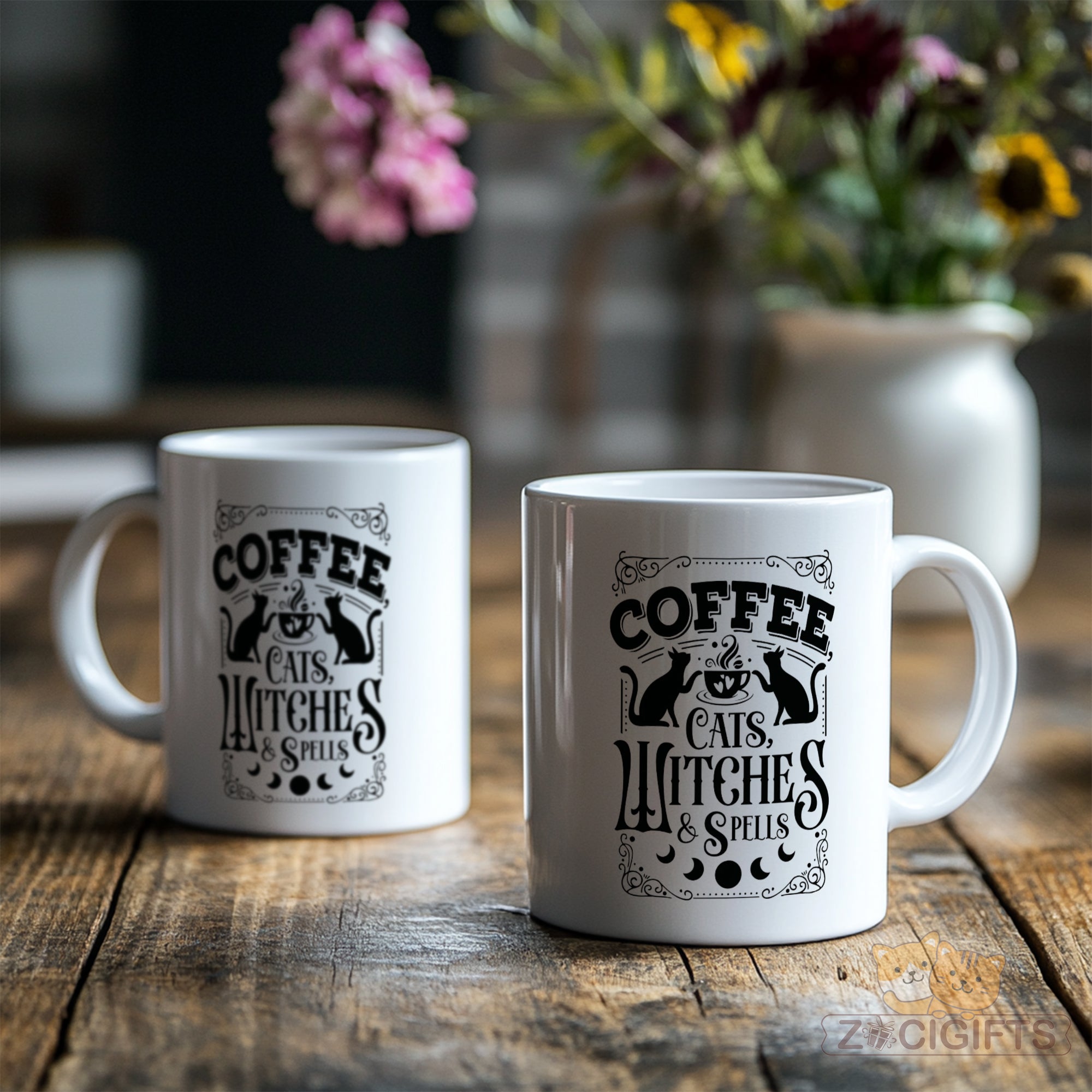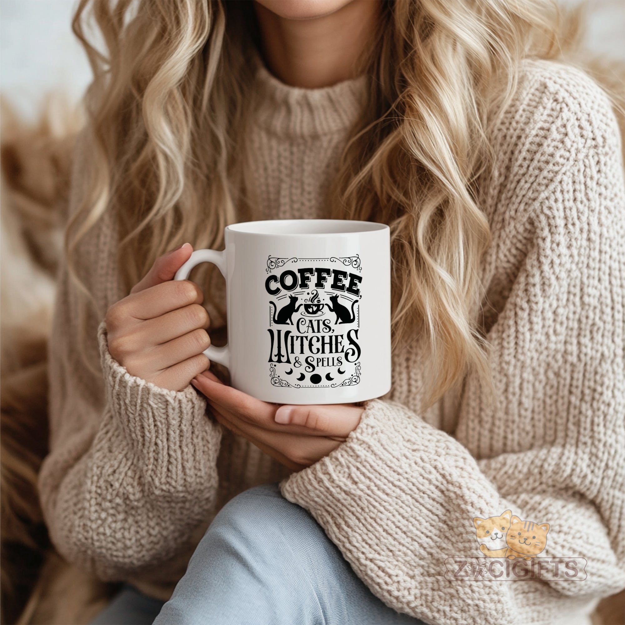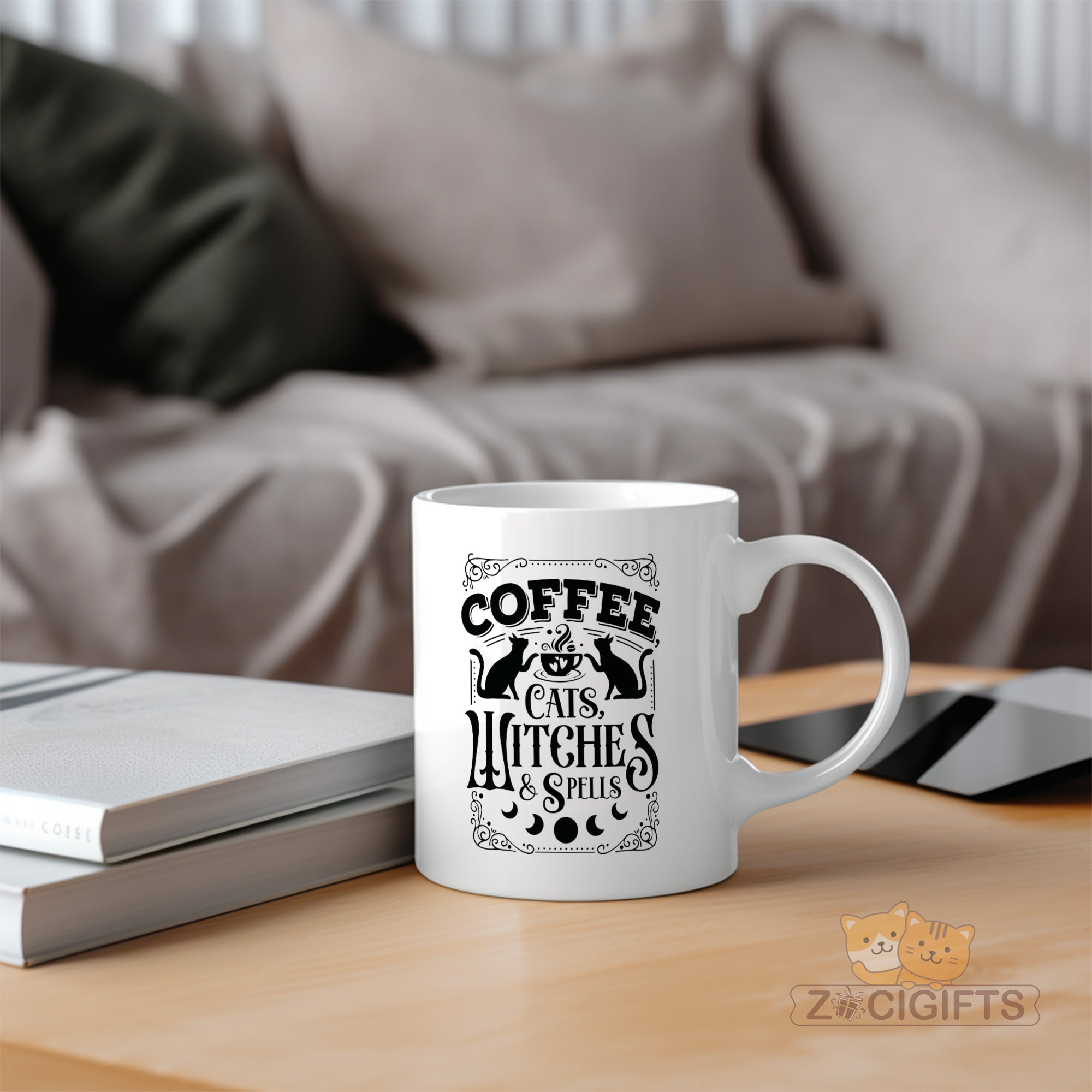 Elevate your coffee - drinking experience with our enchanting "Cats, Witches & Spells" ceramic mug! This isn't just a mug; it's a statement piece that combines the love for coffee, cats, and all things magical.