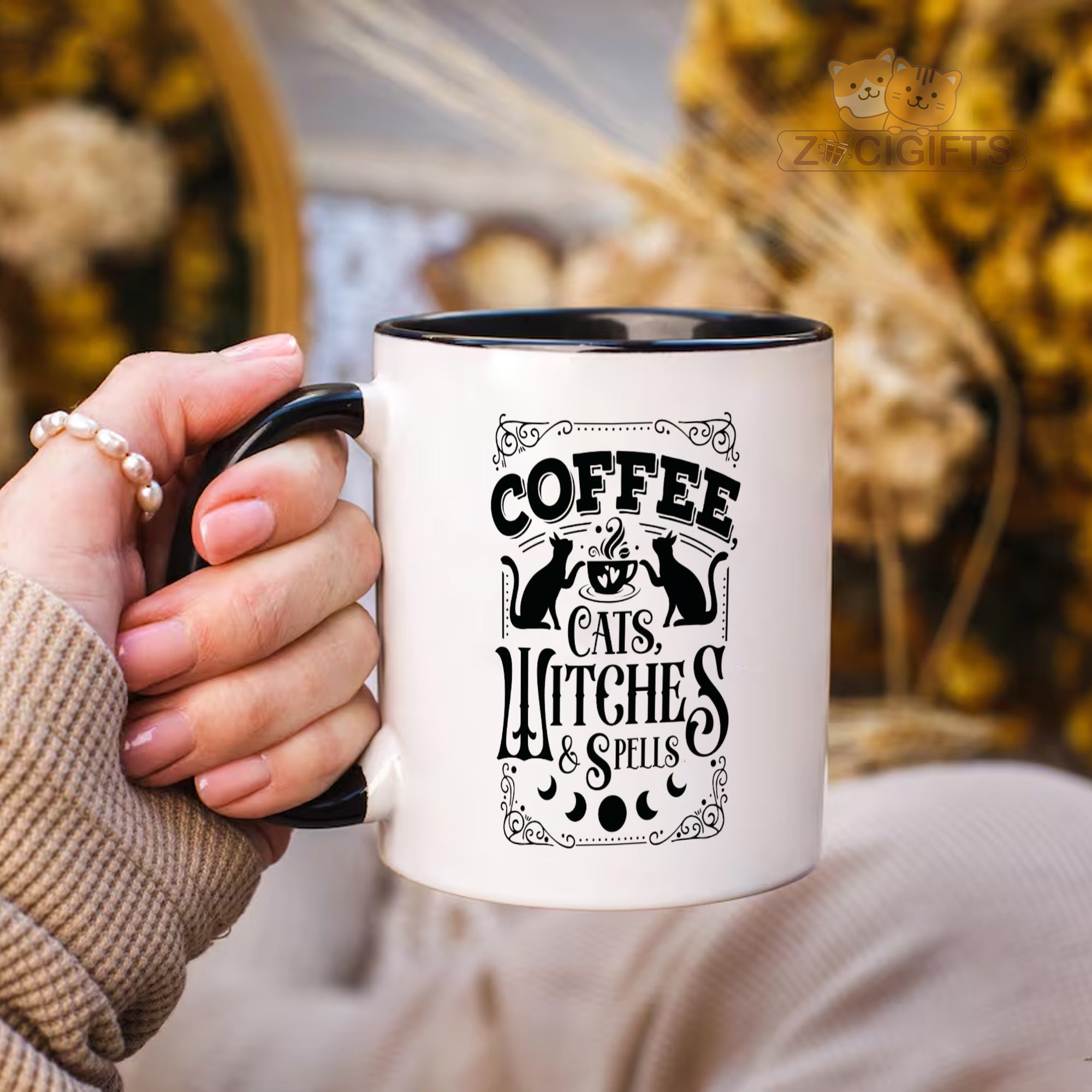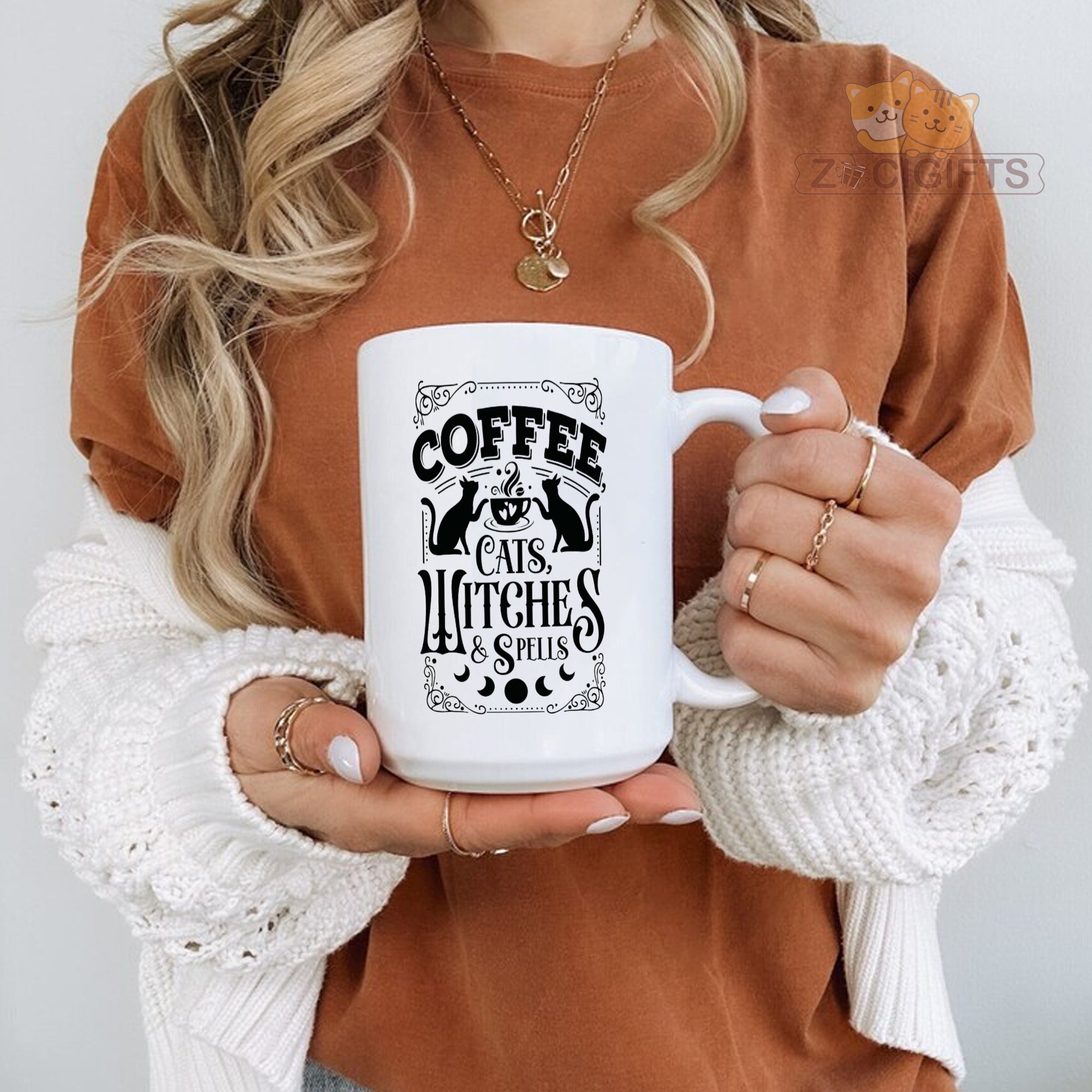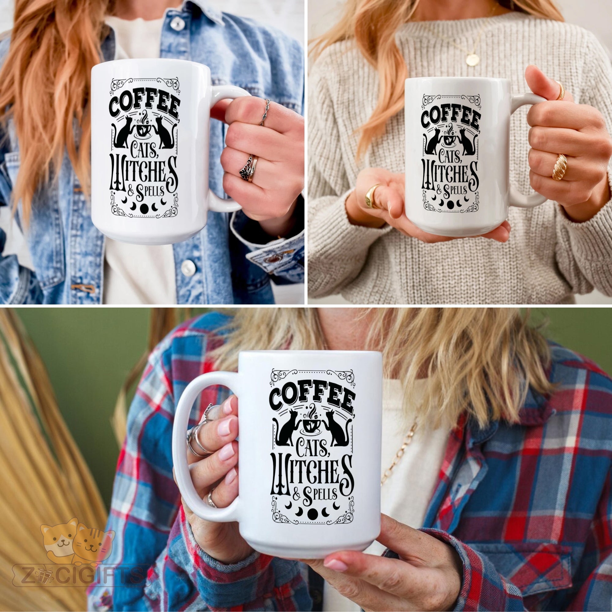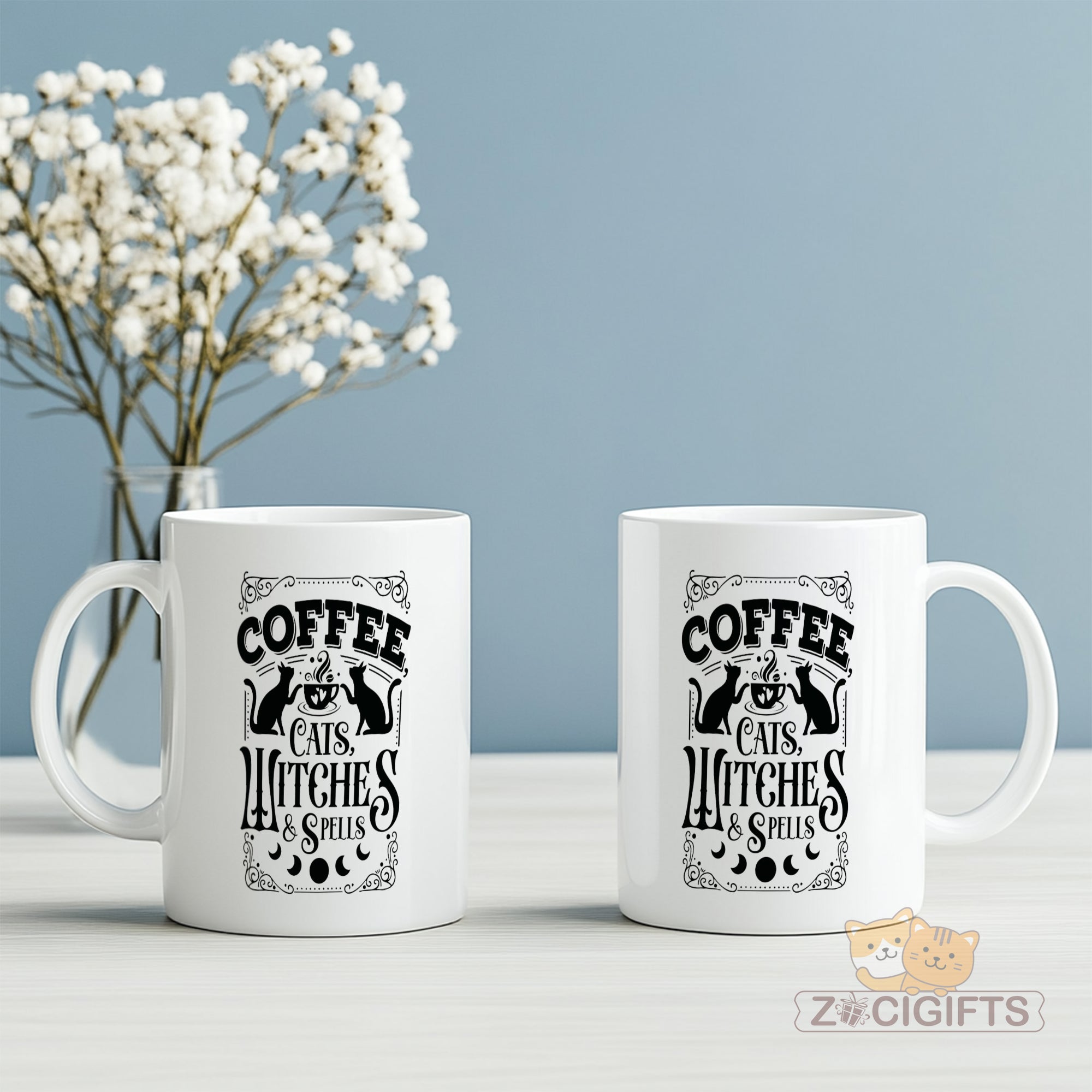 Elevate your coffee - drinking experience with our enchanting "Cats, Witches & Spells" ceramic mug! This isn't just a mug; it's a statement piece that combines the love for coffee, cats, and all things magical.