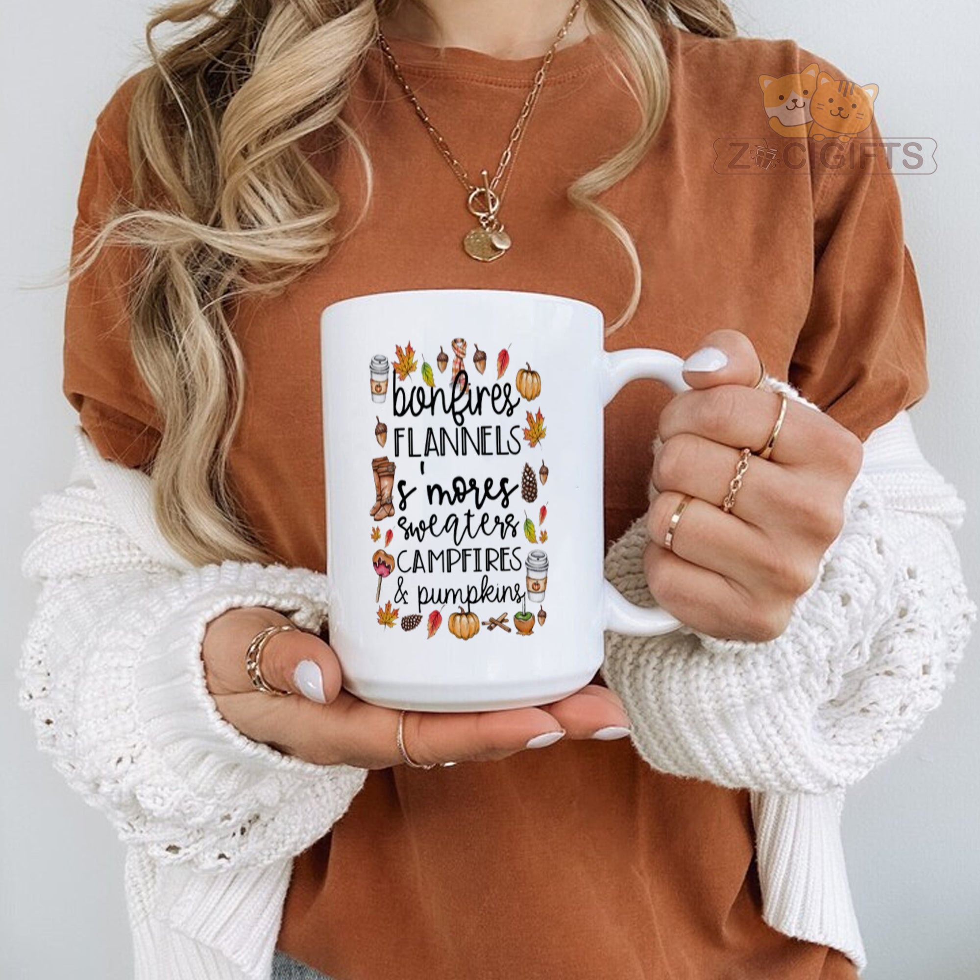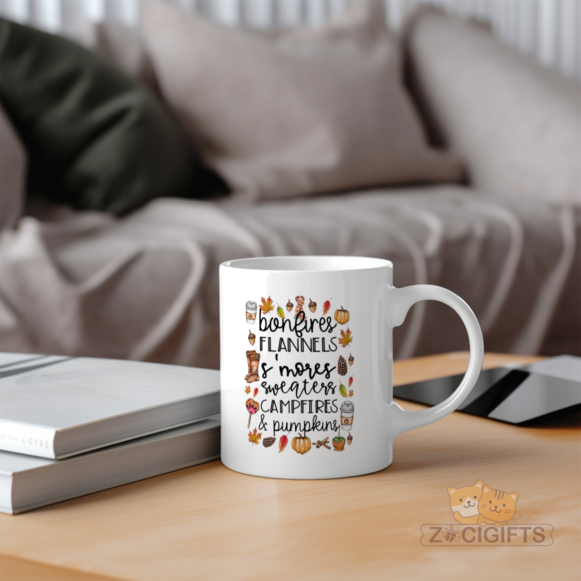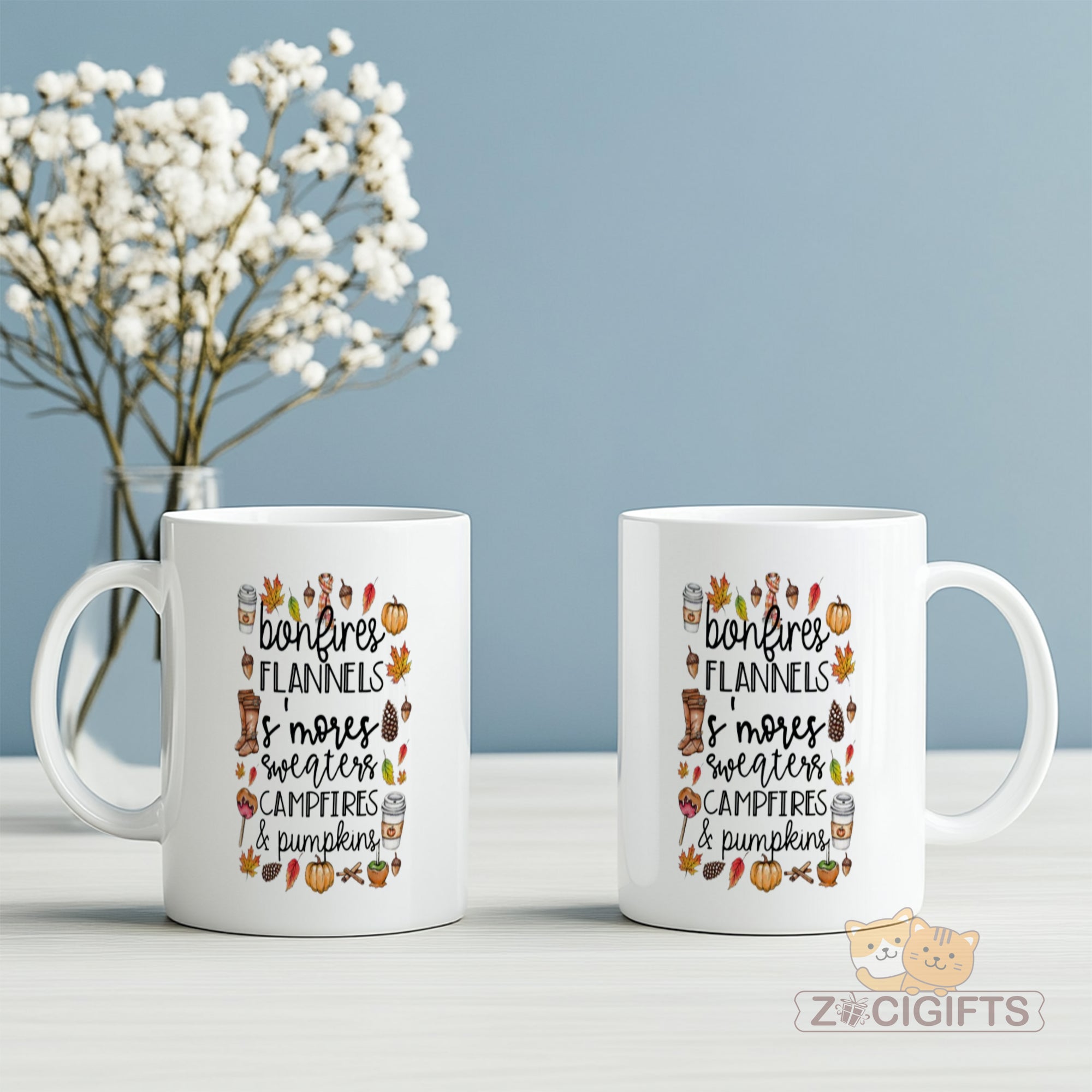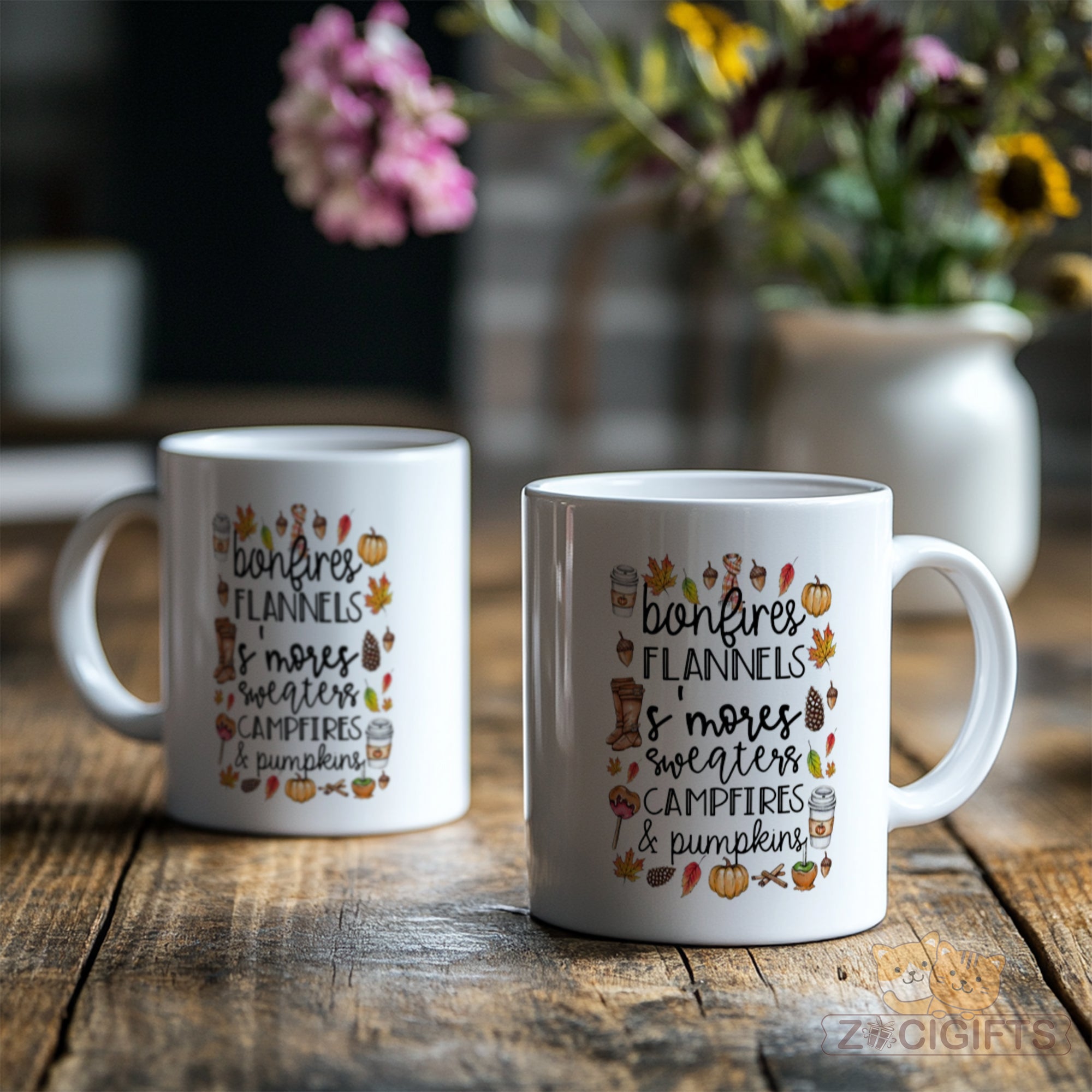 This ceramic mug features an adorable and festive design that captures the essence of the fall season. The charming illustrations of bonfires, flannels, s'mores, pumpkins, and more are accompanied by delightful text, making it a perfect representation of all things autumnal.
