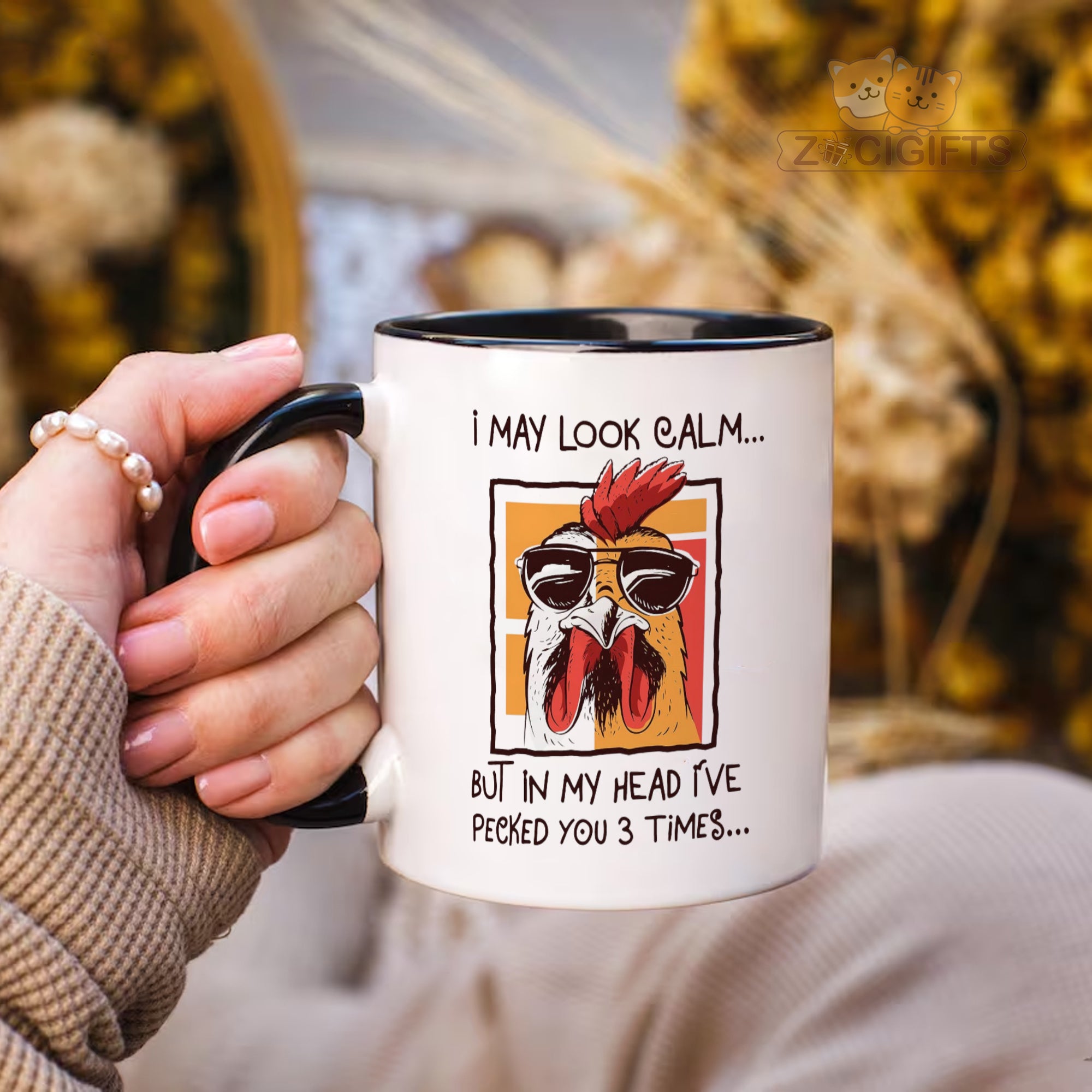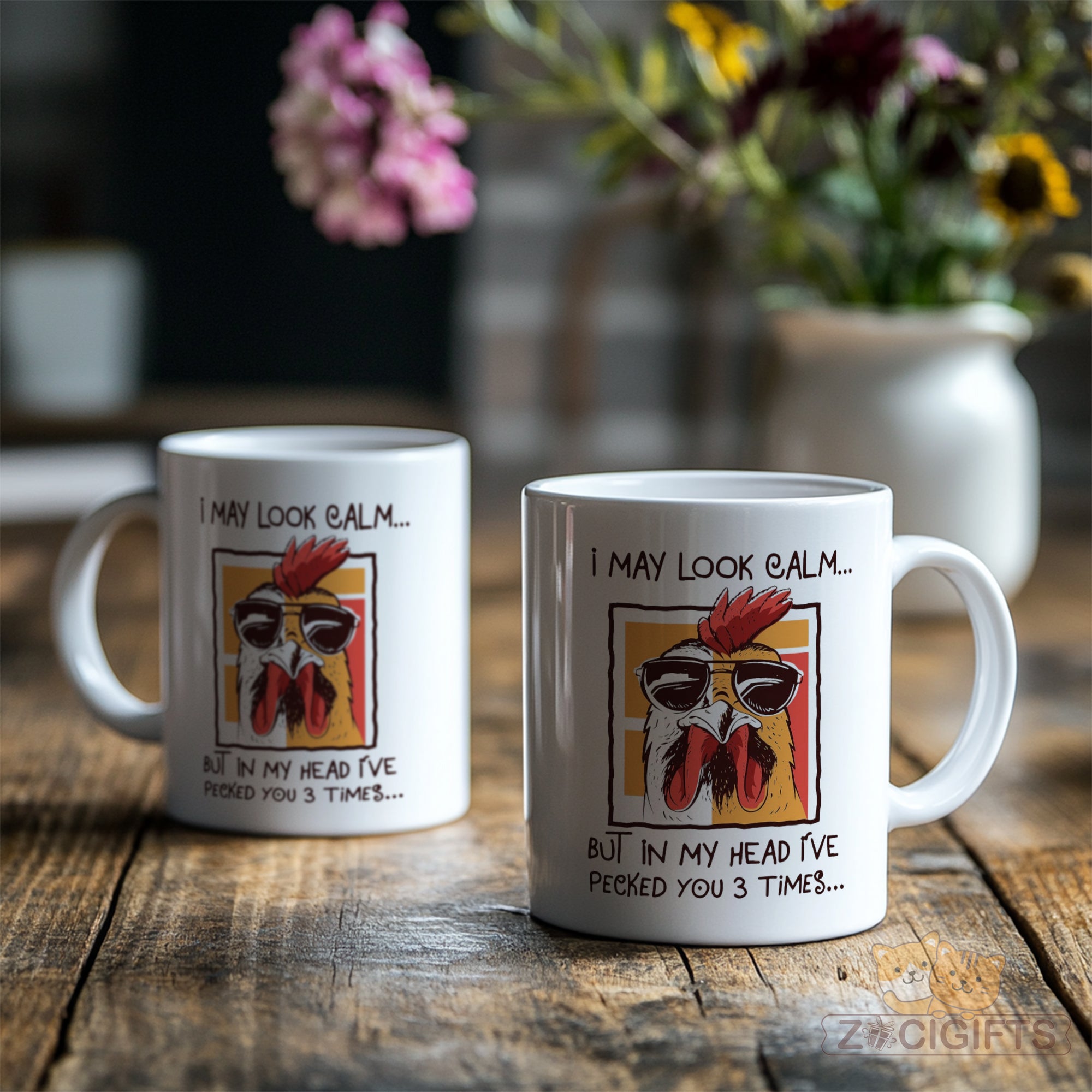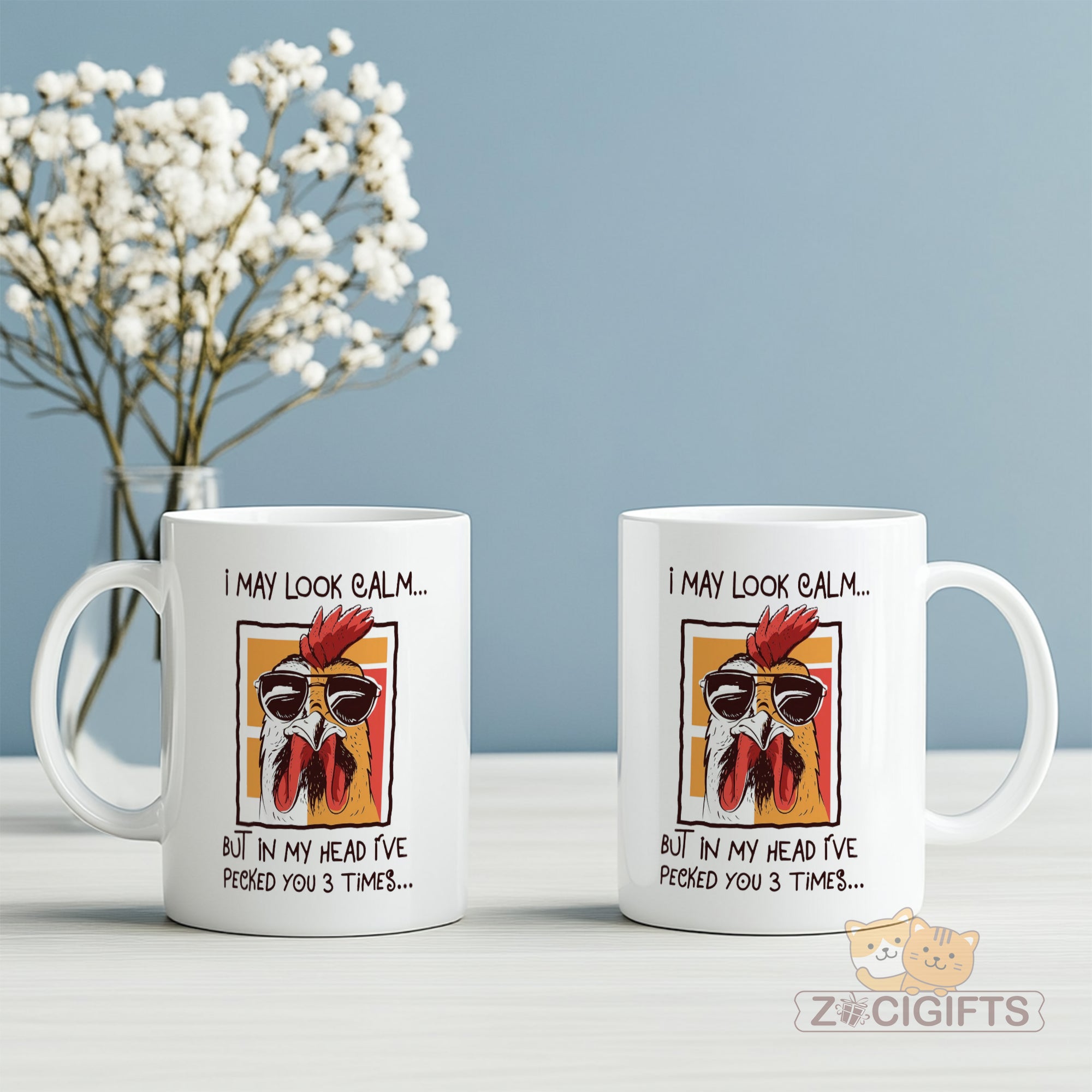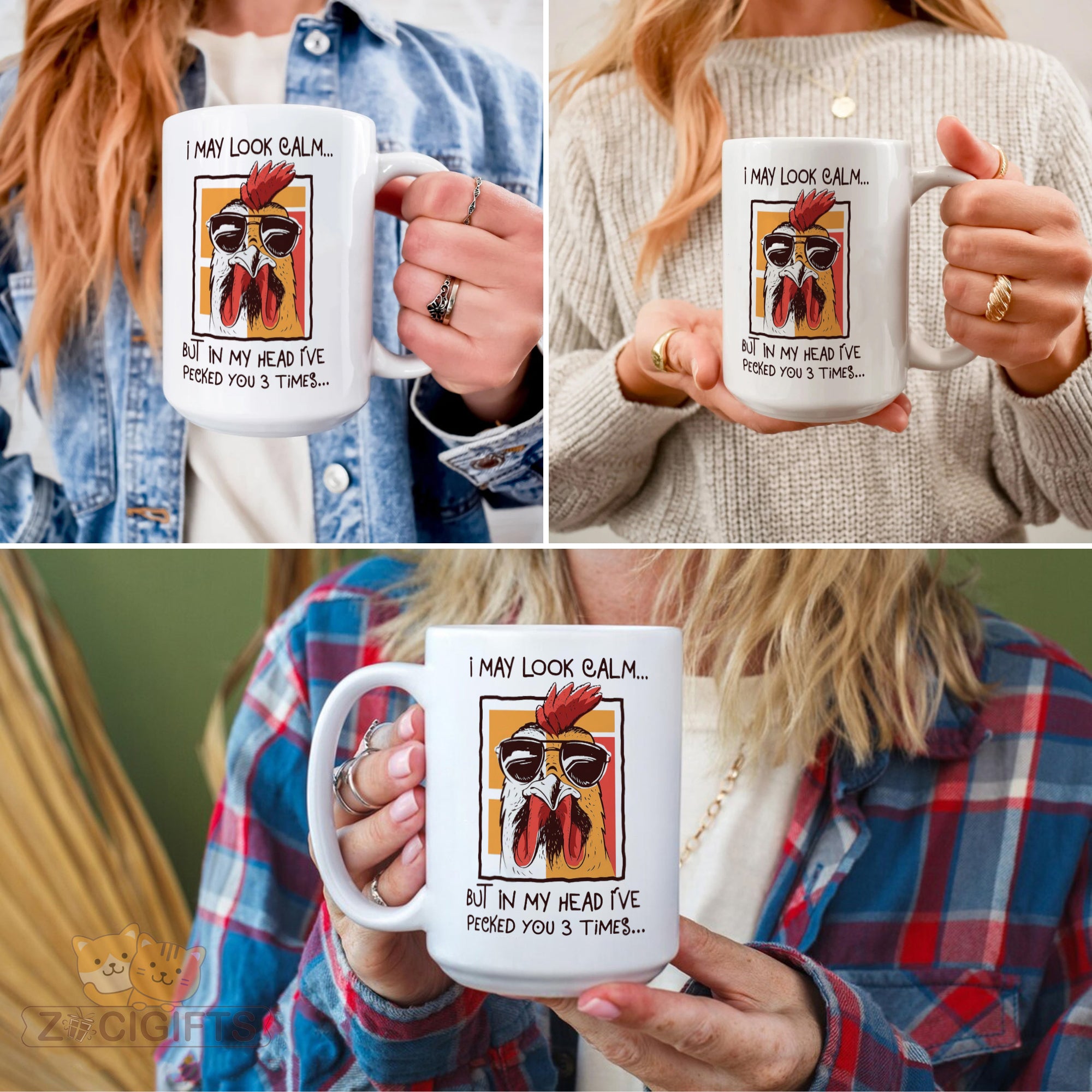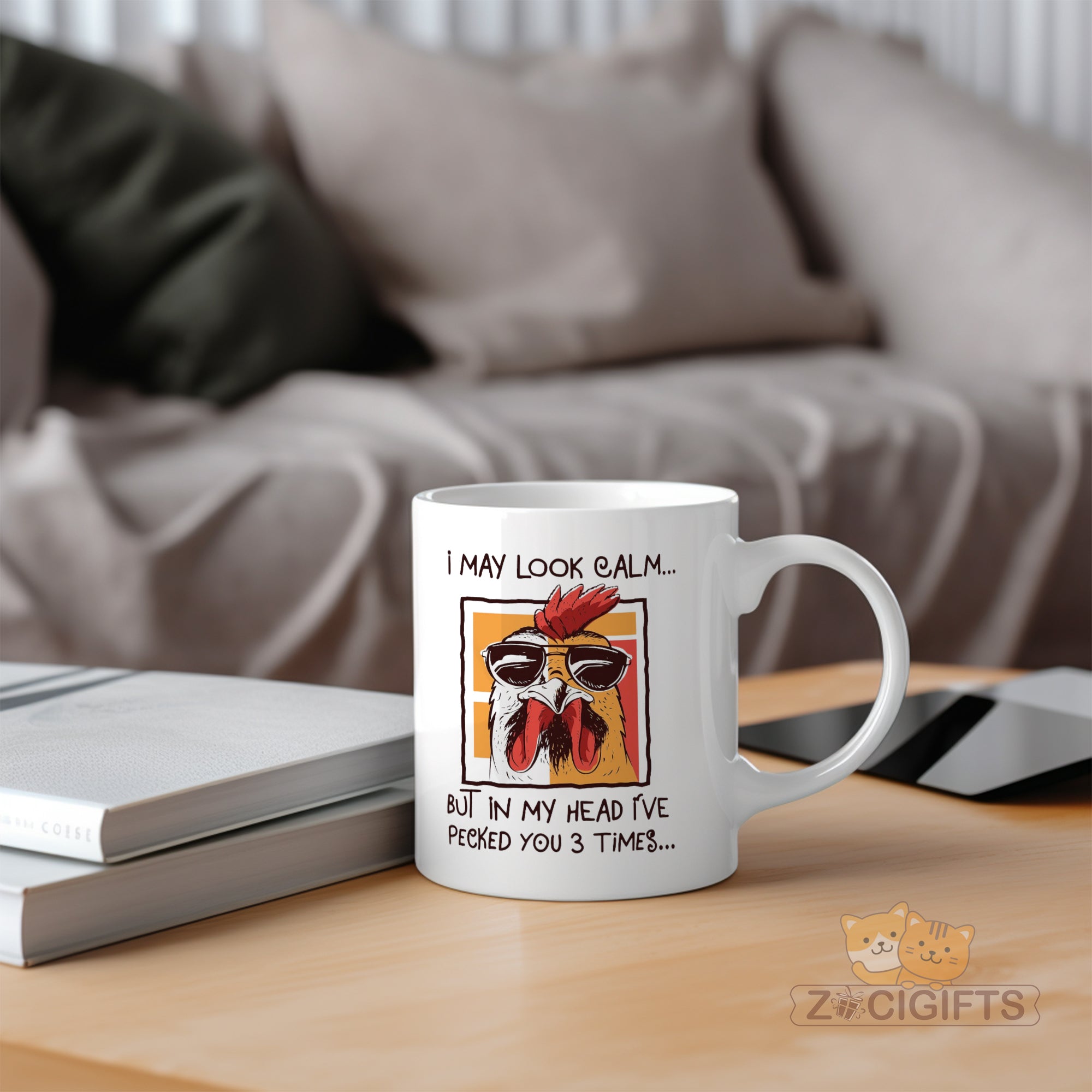 The quote on the mug, "I may look calm but in my head I've pecked you 3 times", adds a touch of humor and sass. Whether you're sipping your morning coffee or enjoying an afternoon tea, this witty saying is sure to start conversations and lighten the mood.