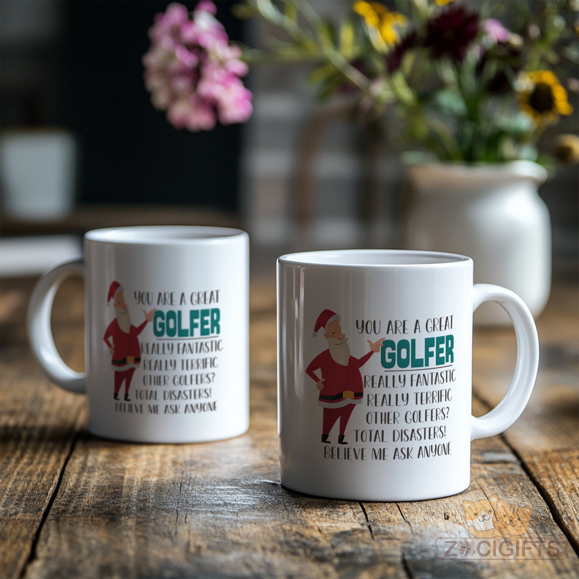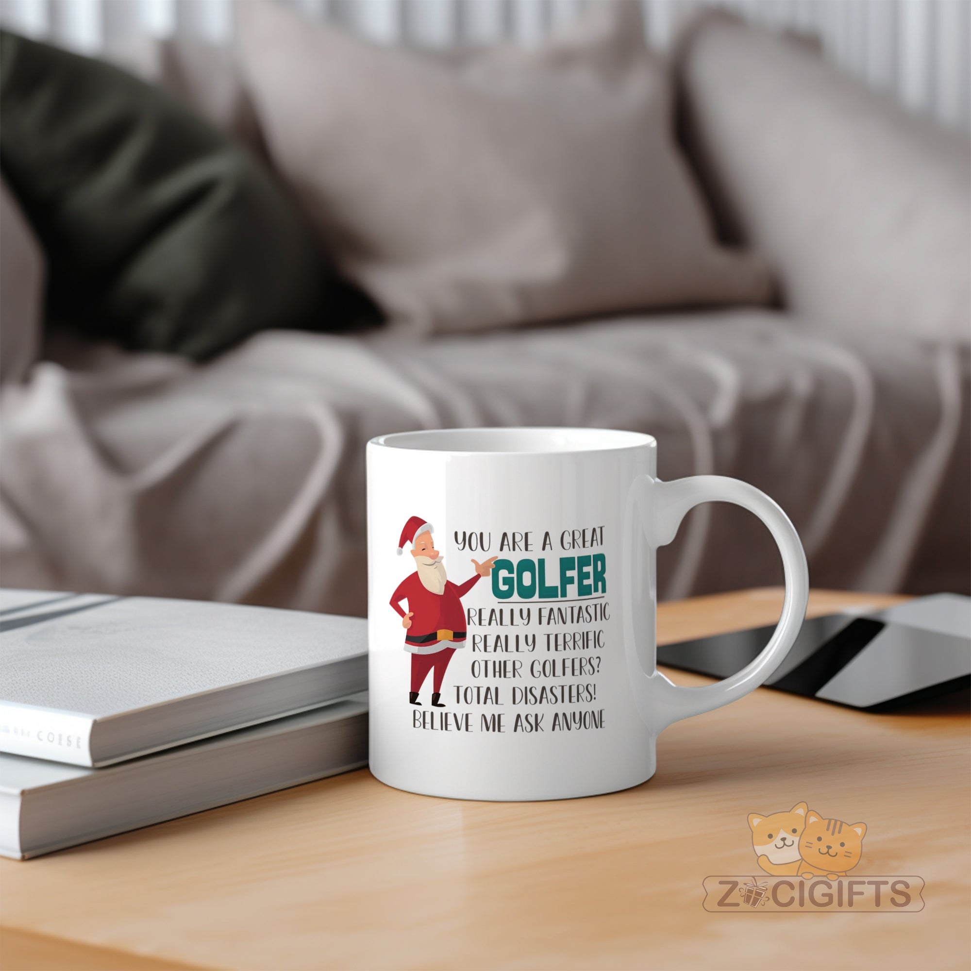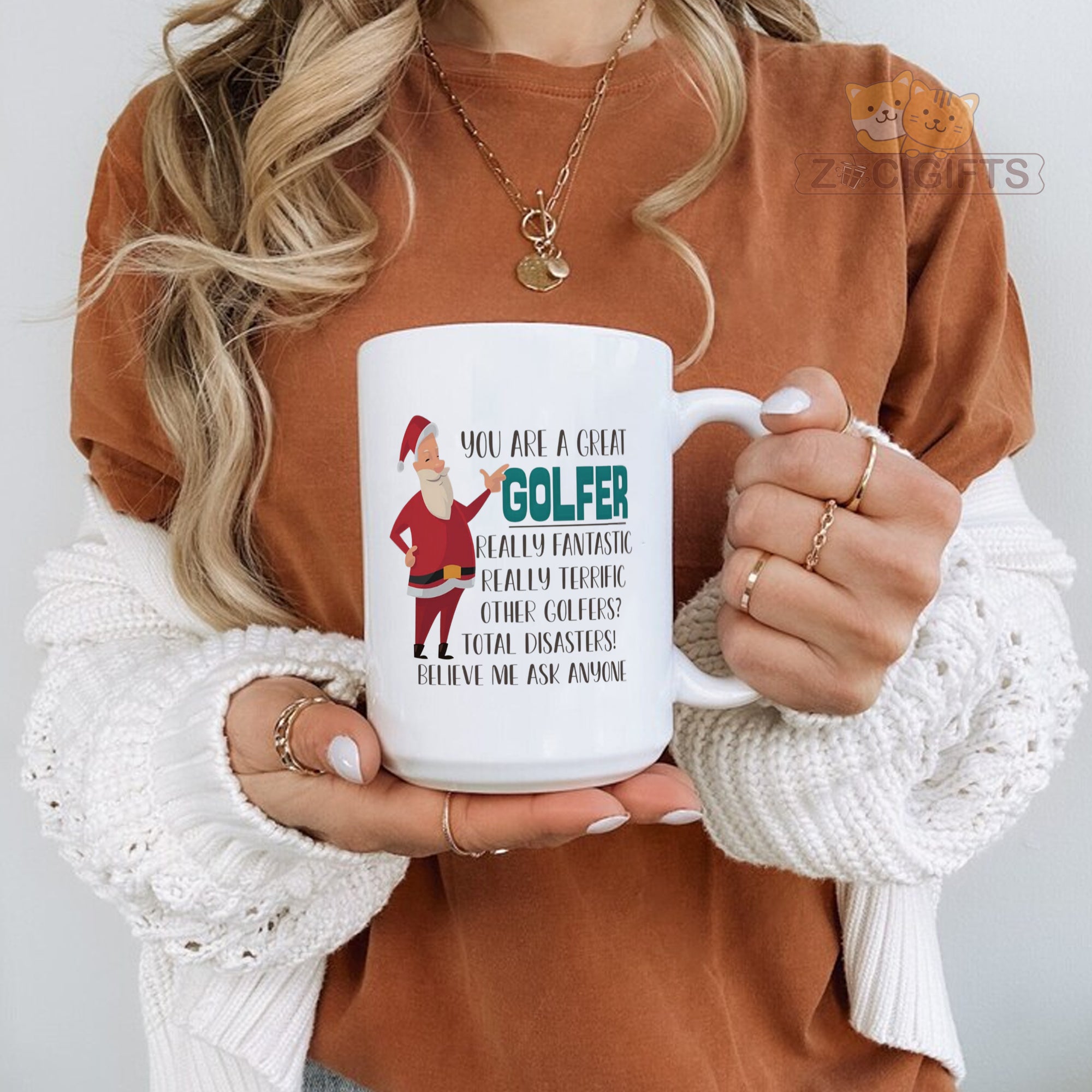 Elevate your golf - loving friend's or family member's day with this hilarious and festive Christmas - themed golf mug! This white ceramic mug features a cheerful Santa Claus design pointing towards the bold text that reads, "YOU ARE A GREAT GOLFER, REALLY FANTASTIC, REALLY TERRIFIC. OTHER GOLFERS? TOTAL DISASTERS! BELIEVE ME ASK ANYONE".