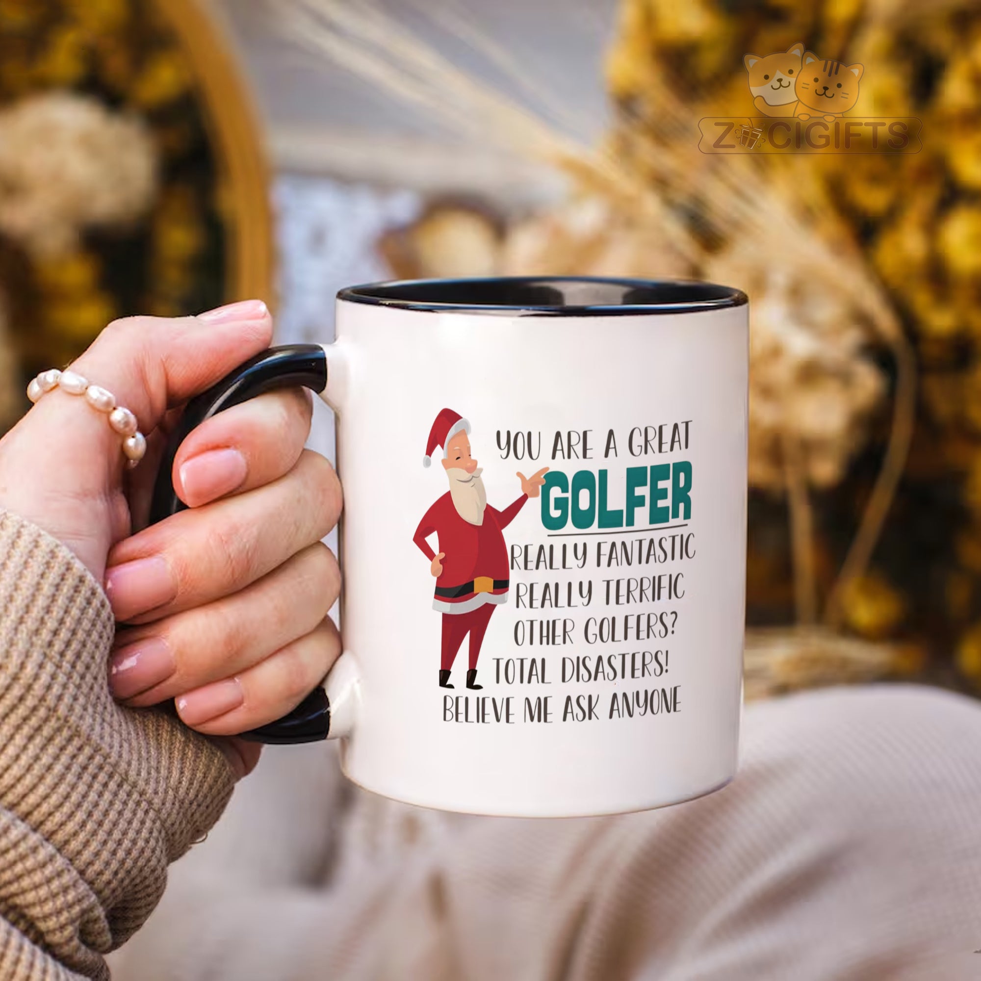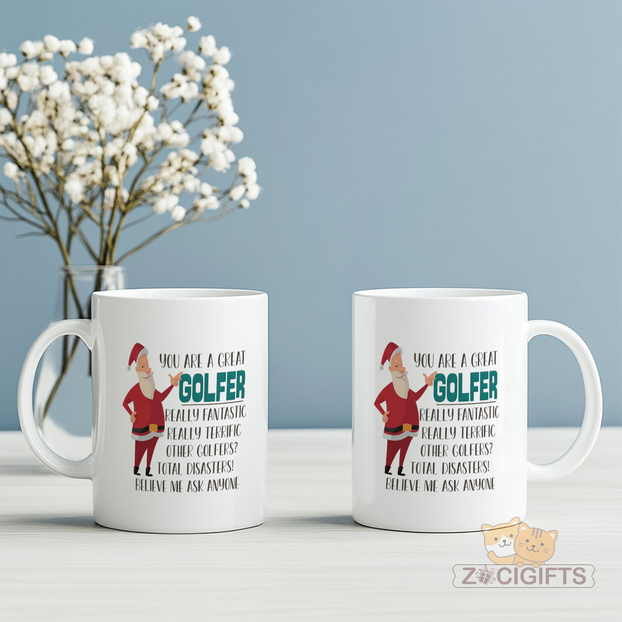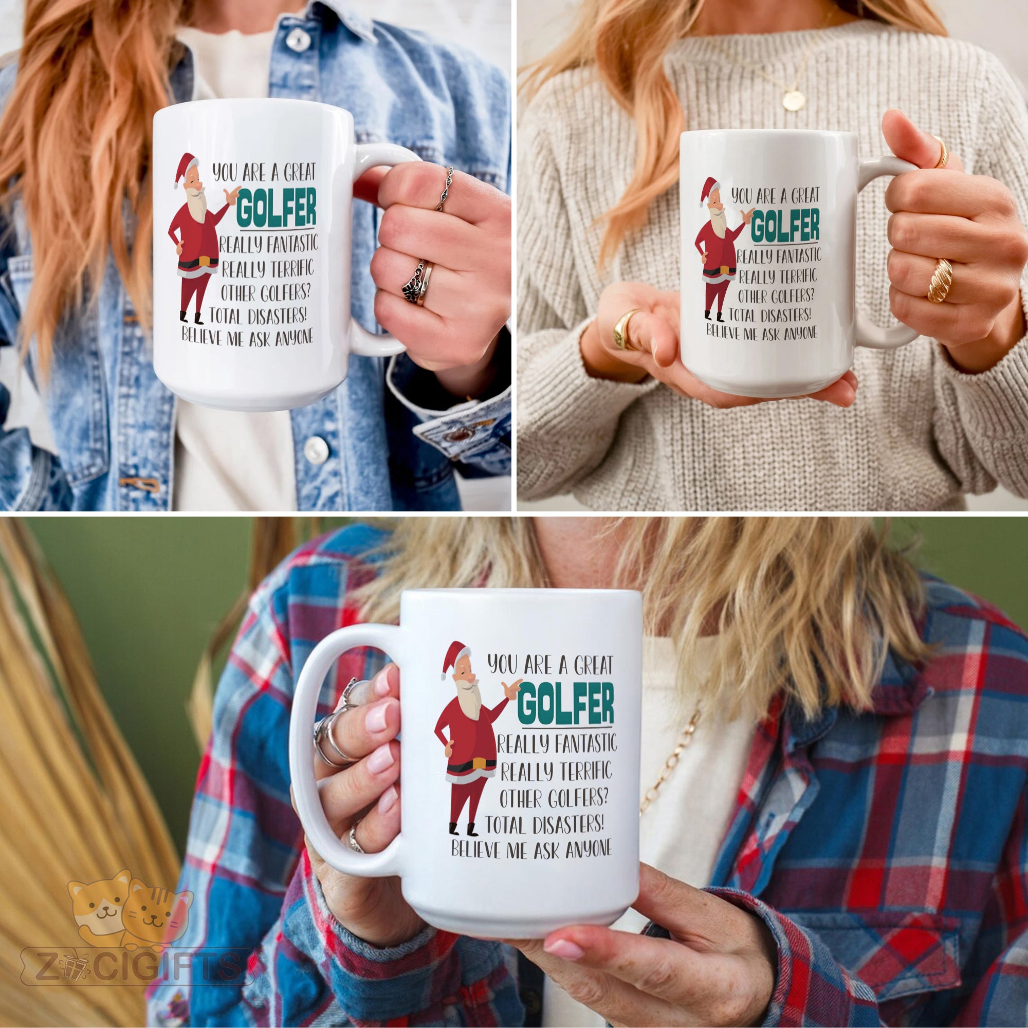 Elevate your golf - loving friend's or family member's day with this hilarious and festive Christmas - themed golf mug! This white ceramic mug features a cheerful Santa Claus design pointing towards the bold text that reads, "YOU ARE A GREAT GOLFER, REALLY FANTASTIC, REALLY TERRIFIC. OTHER GOLFERS? TOTAL DISASTERS! BELIEVE ME ASK ANYONE".