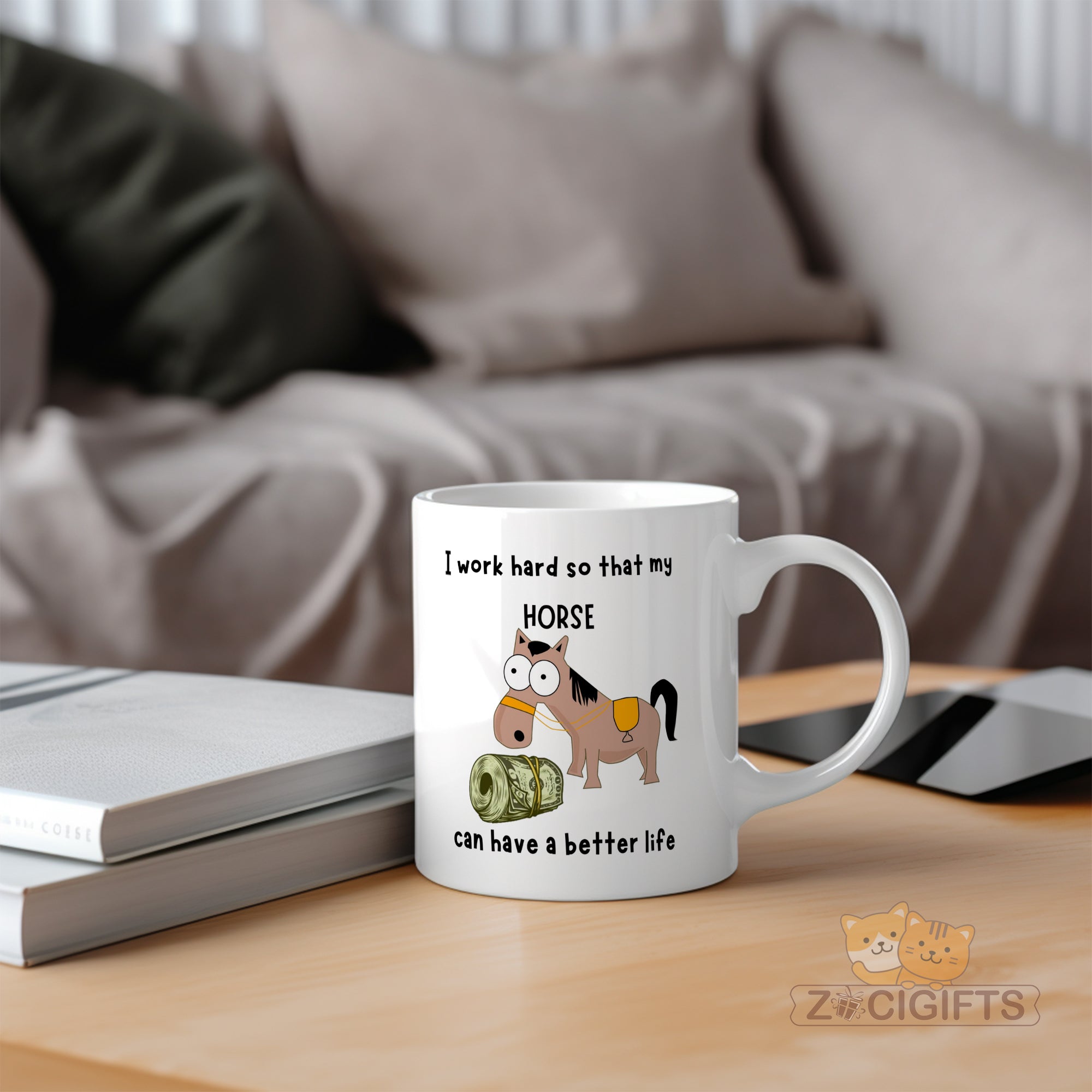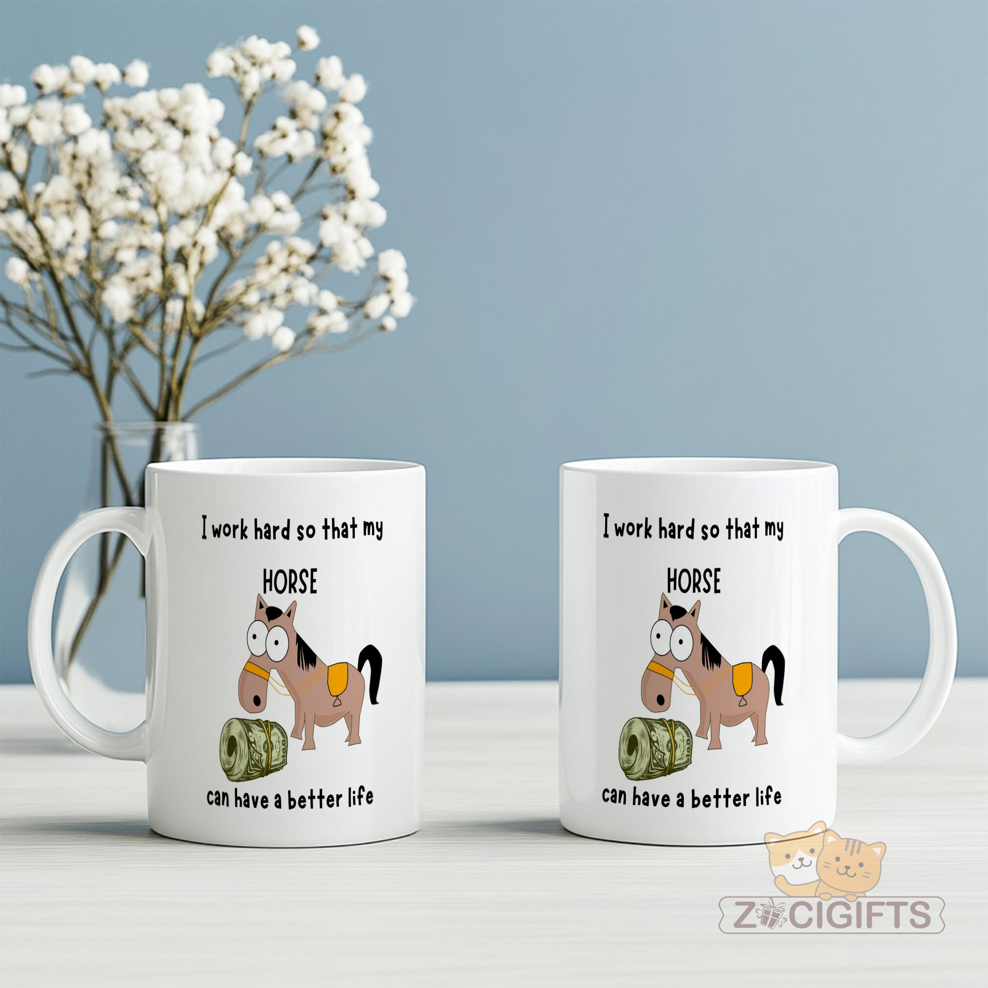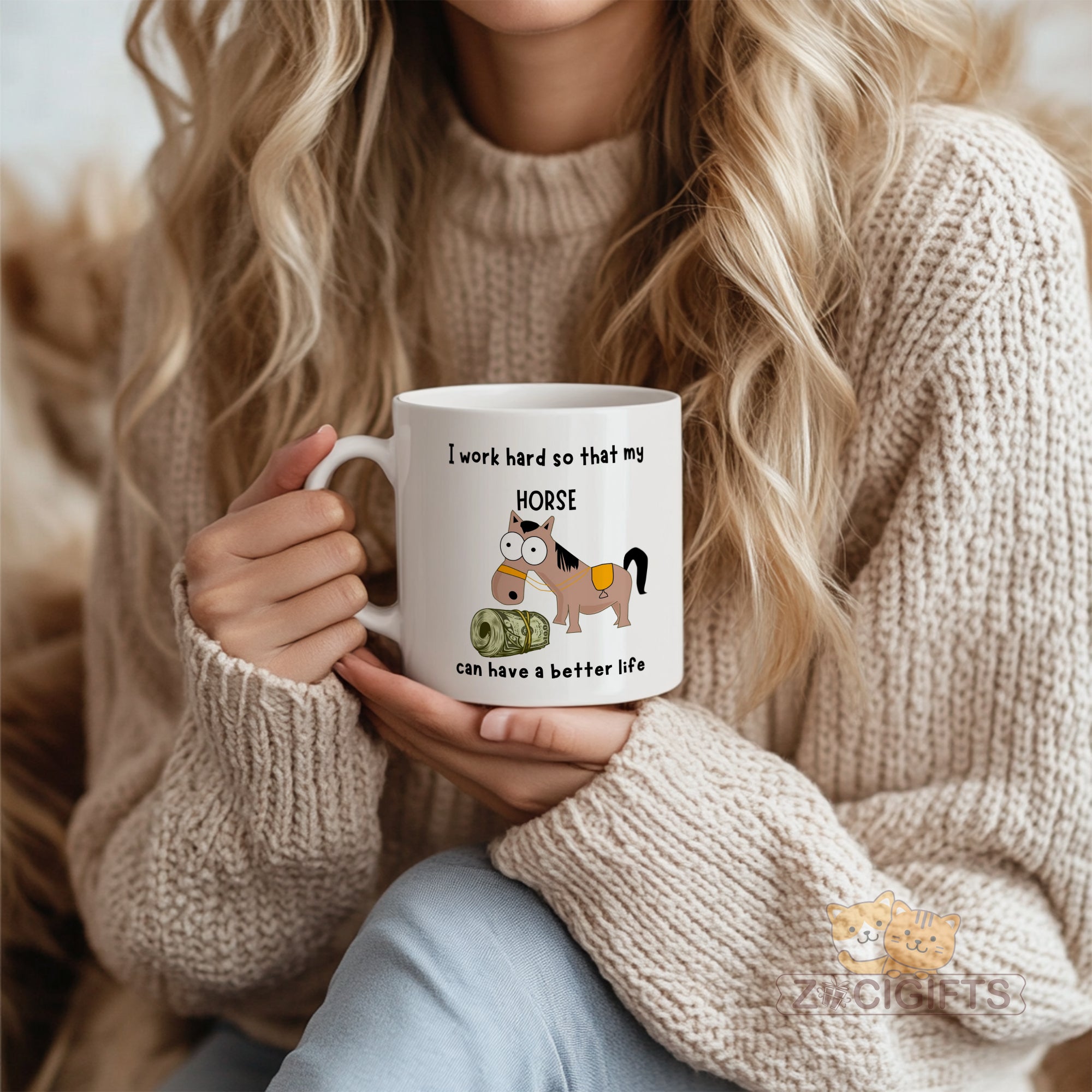 Upgrade your morning routine with our unique and hilarious ceramic coffee mug! This 11oz mug is not just a vessel for your favorite brew; it's a statement piece for all the hard - working horse owners out there. The mug features a fun illustration of a wide - eyed horse next to a stack of money, accompanied by the witty text "I work hard so my horse can have a better life." It's the perfect way to showcase your love for your equine companion and your sense of humor. Whether you're sipping coffee before a long day at the stables, enjoying a relaxing evening at home, or looking for a great gift for a fellow horse lover, this mug is sure to bring a smile to your face. Made from high - quality ceramic, it's durable and dishwasher safe for easy cleaning. Don't miss out on this one - of - a - kind equestrian gift that combines functionality and fun!
