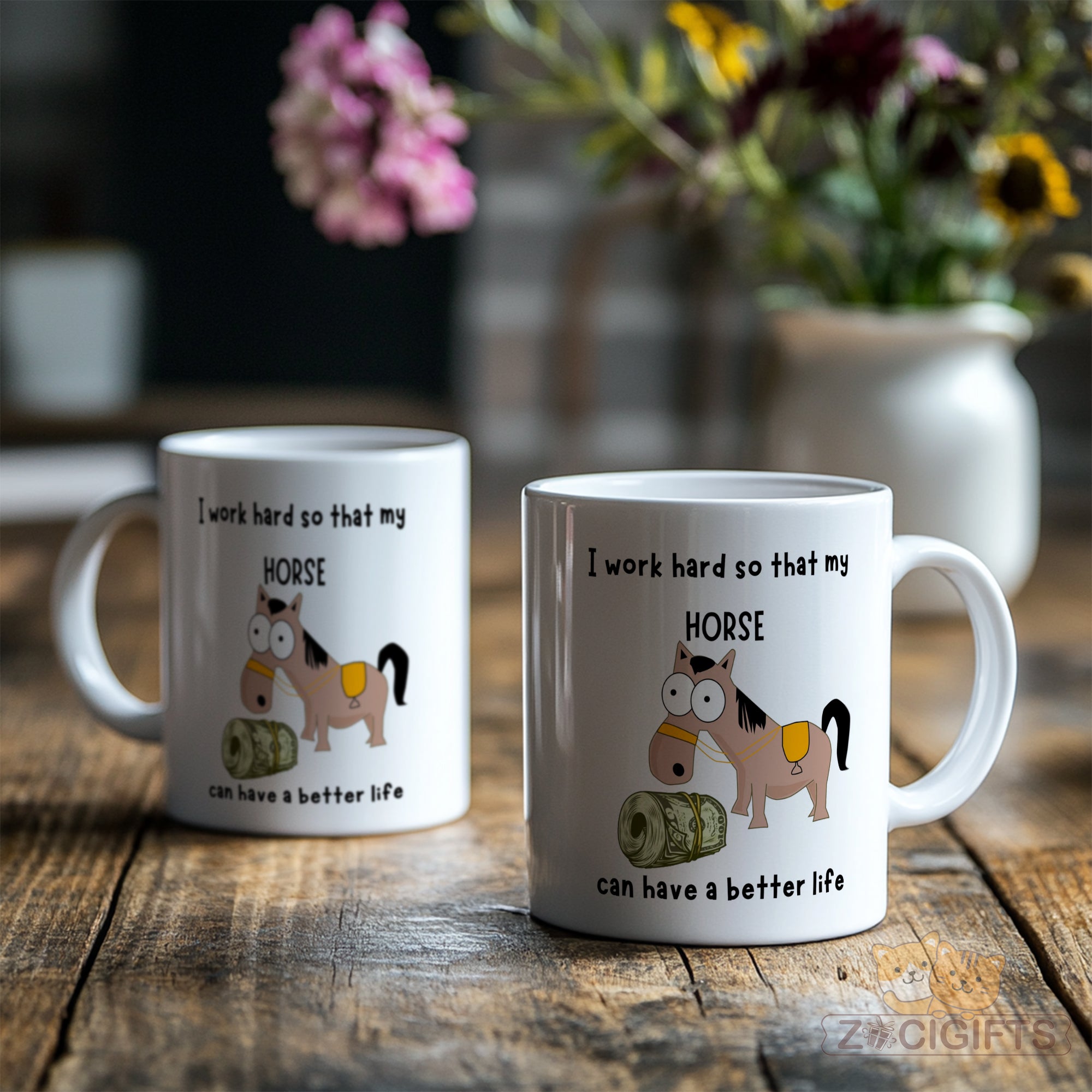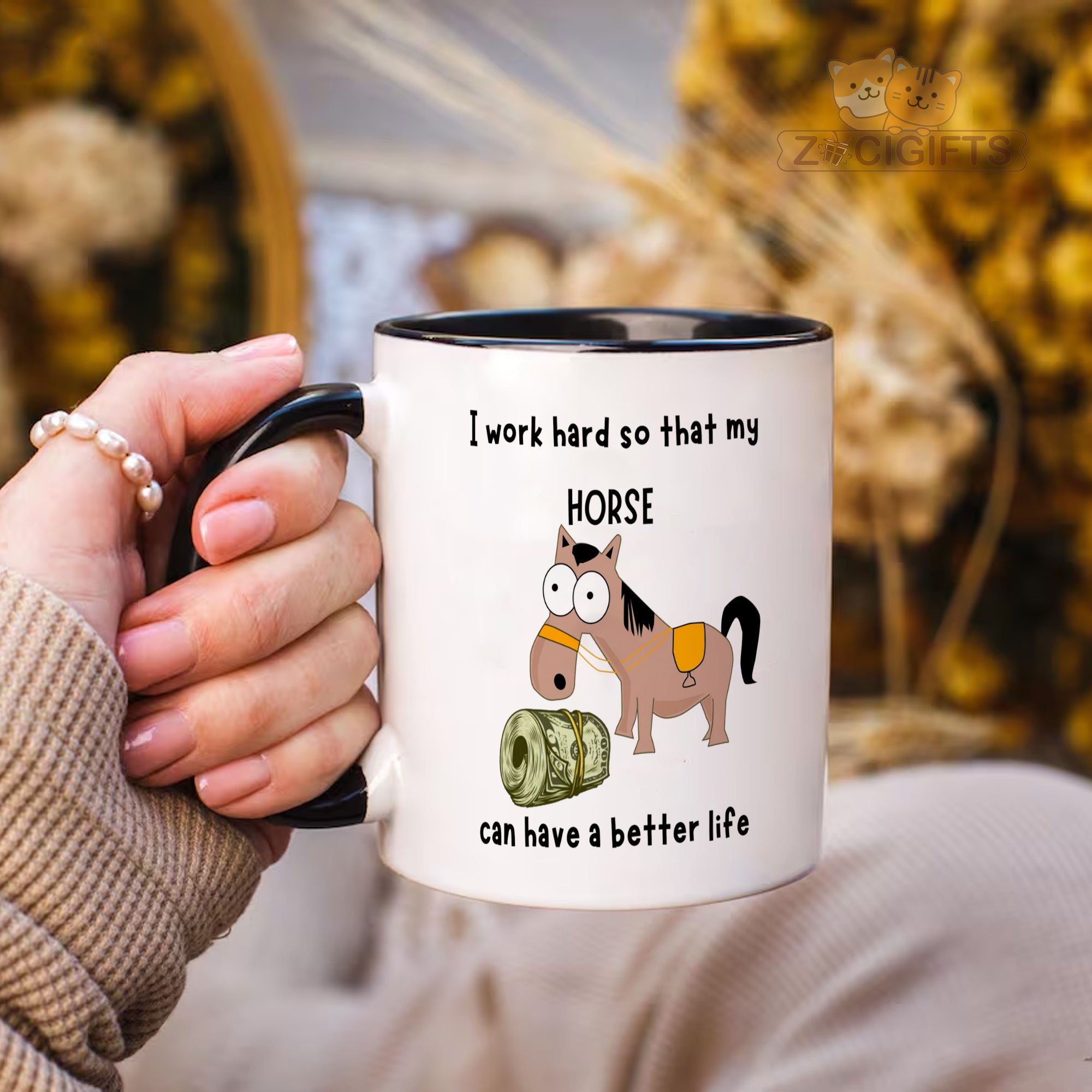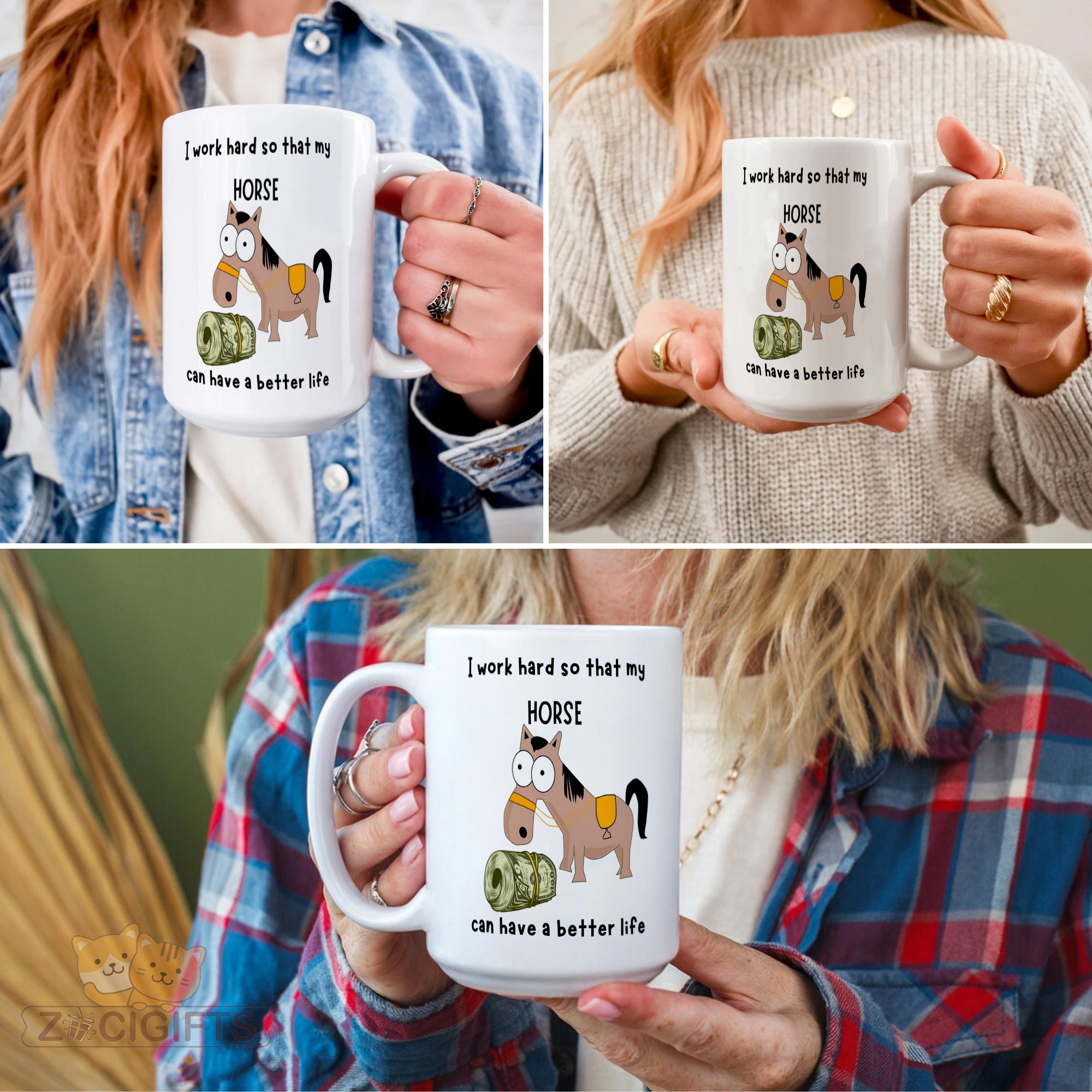 Upgrade your morning routine with our unique and hilarious ceramic coffee mug! This 11oz mug is not just a vessel for your favorite brew; it's a statement piece for all the hard - working horse owners out there. The mug features a fun illustration of a wide - eyed horse next to a stack of money, accompanied by the witty text "I work hard so my horse can have a better life." It's the perfect way to showcase your love for your equine companion and your sense of humor. Whether you're sipping coffee before a long day at the stables, enjoying a relaxing evening at home, or looking for a great gift for a fellow horse lover, this mug is sure to bring a smile to your face. Made from high - quality ceramic, it's durable and dishwasher safe for easy cleaning. Don't miss out on this one - of - a - kind equestrian gift that combines functionality and fun!