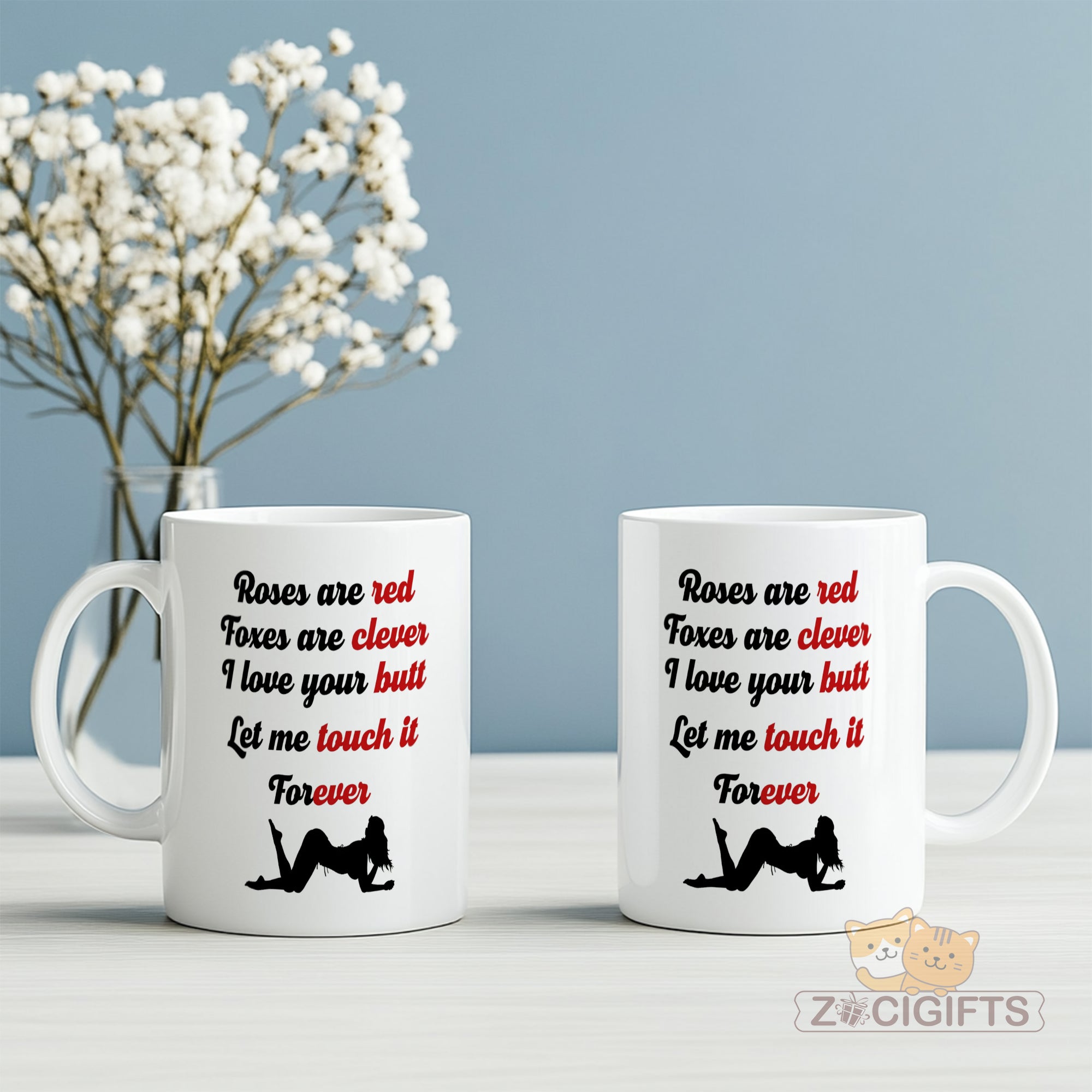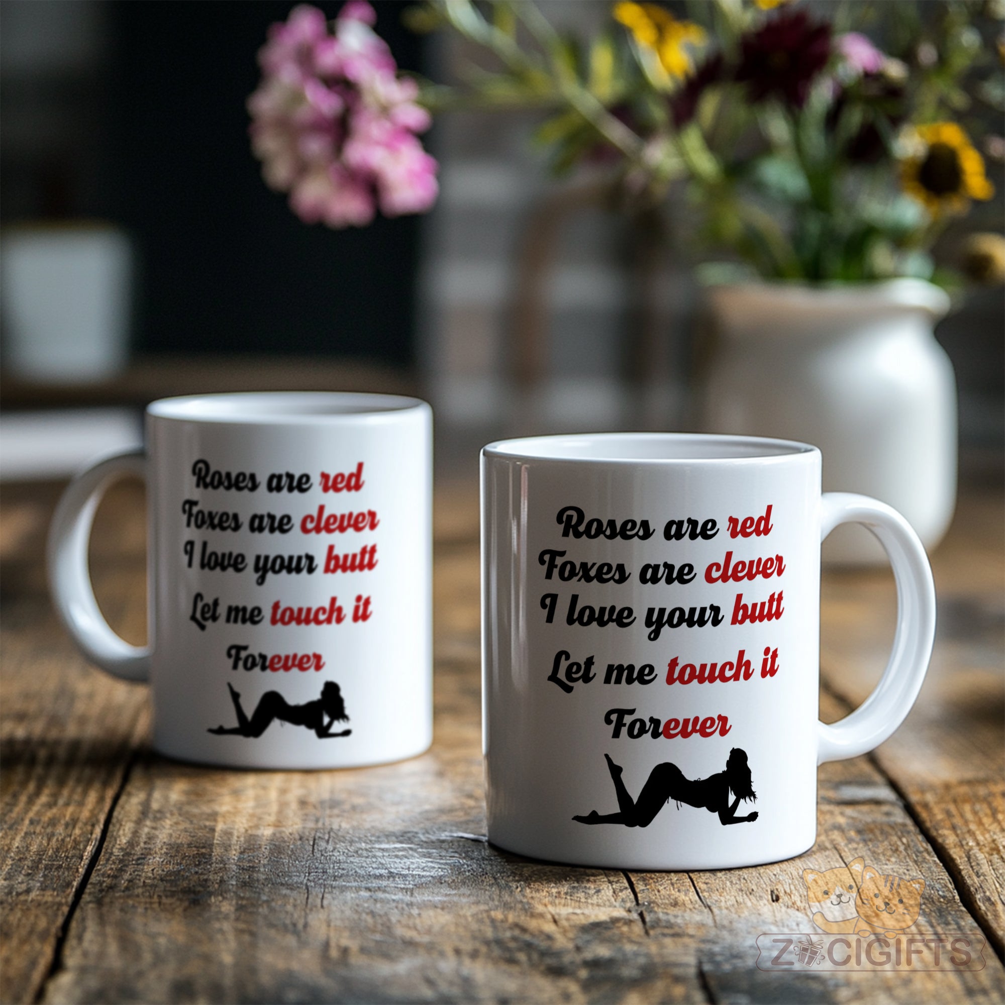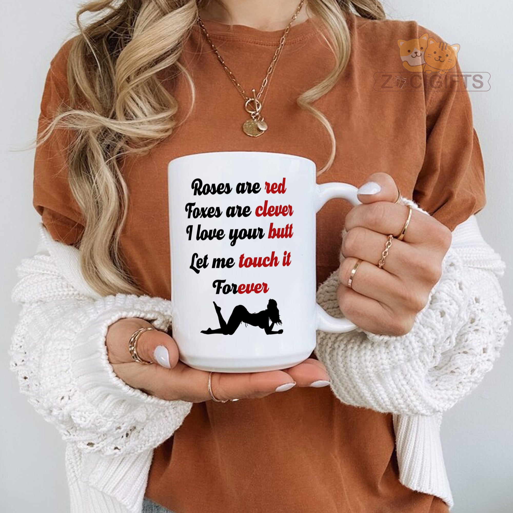 Add a touch of humor and romance to your daily routine with our unique mug! This white ceramic mug features a playful and flirty poem that goes: "Roses are red, Foxes are clever, I love your butt, Let me touch it Forever". The cheeky words are paired with a silhouette of a woman in a seductive pose, making it a perfect conversation starter or a fun gift for your loved ones. Whether you're looking to surprise your partner, add some spice to your morning coffee, or simply have a good laugh while sipping your tea, this mug is a great choice. It's made from high - quality materials, ensuring durability and a comfortable grip. The smooth finish makes it easy to clean, whether you use it in the microwave or dishwasher. This mug also makes an ideal gift for special occasions such as Valentine's Day, anniversaries, birthdays, or just as a random act of kindness. Show your sense of humor and love with this one - of - a - kind mug. Get yours today and enjoy a little fun in every sip!