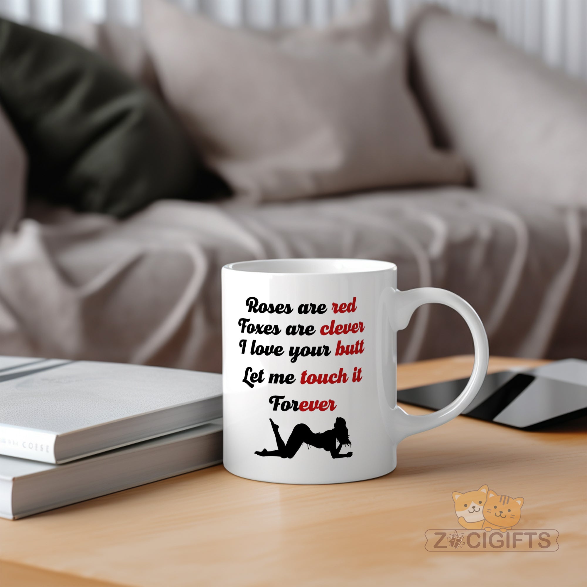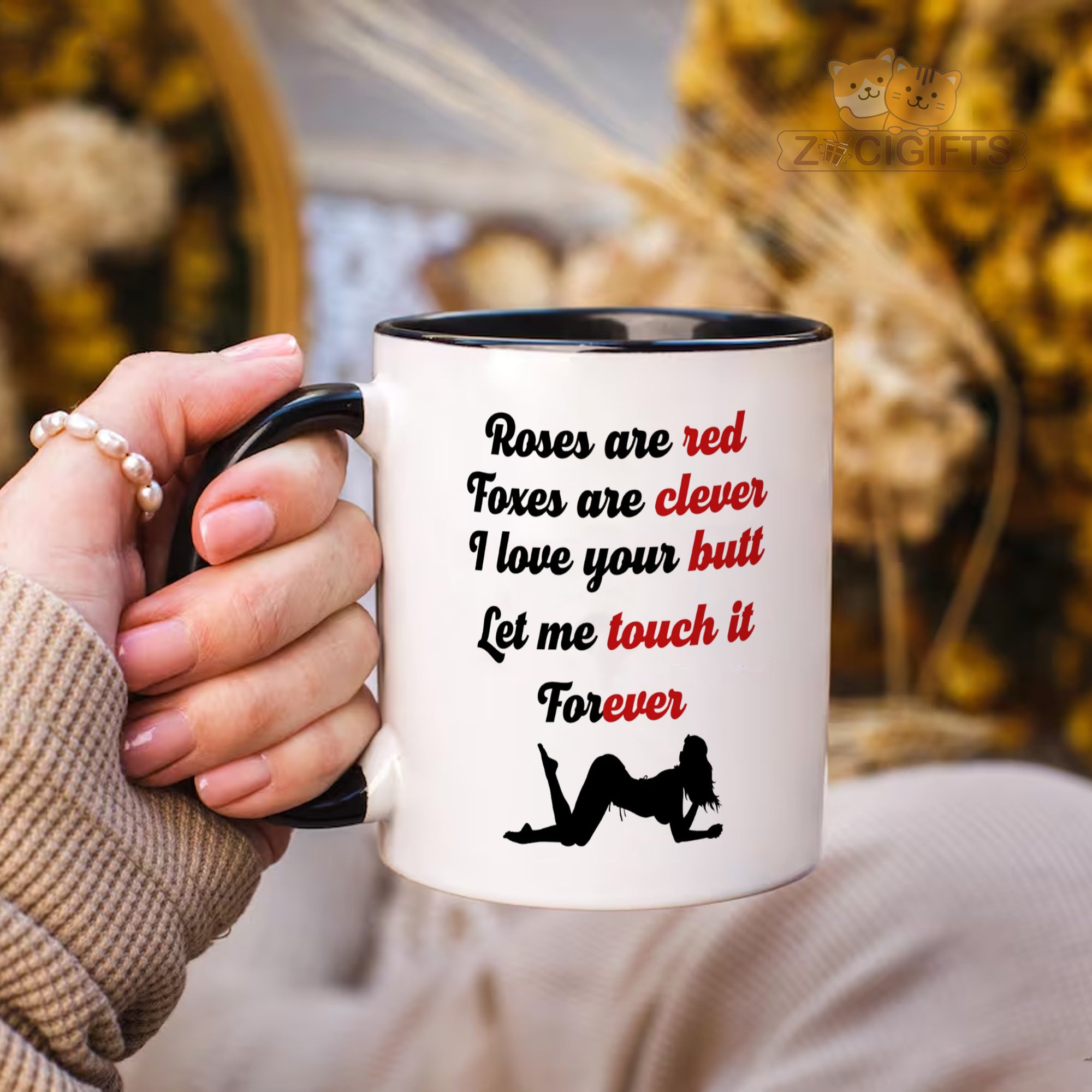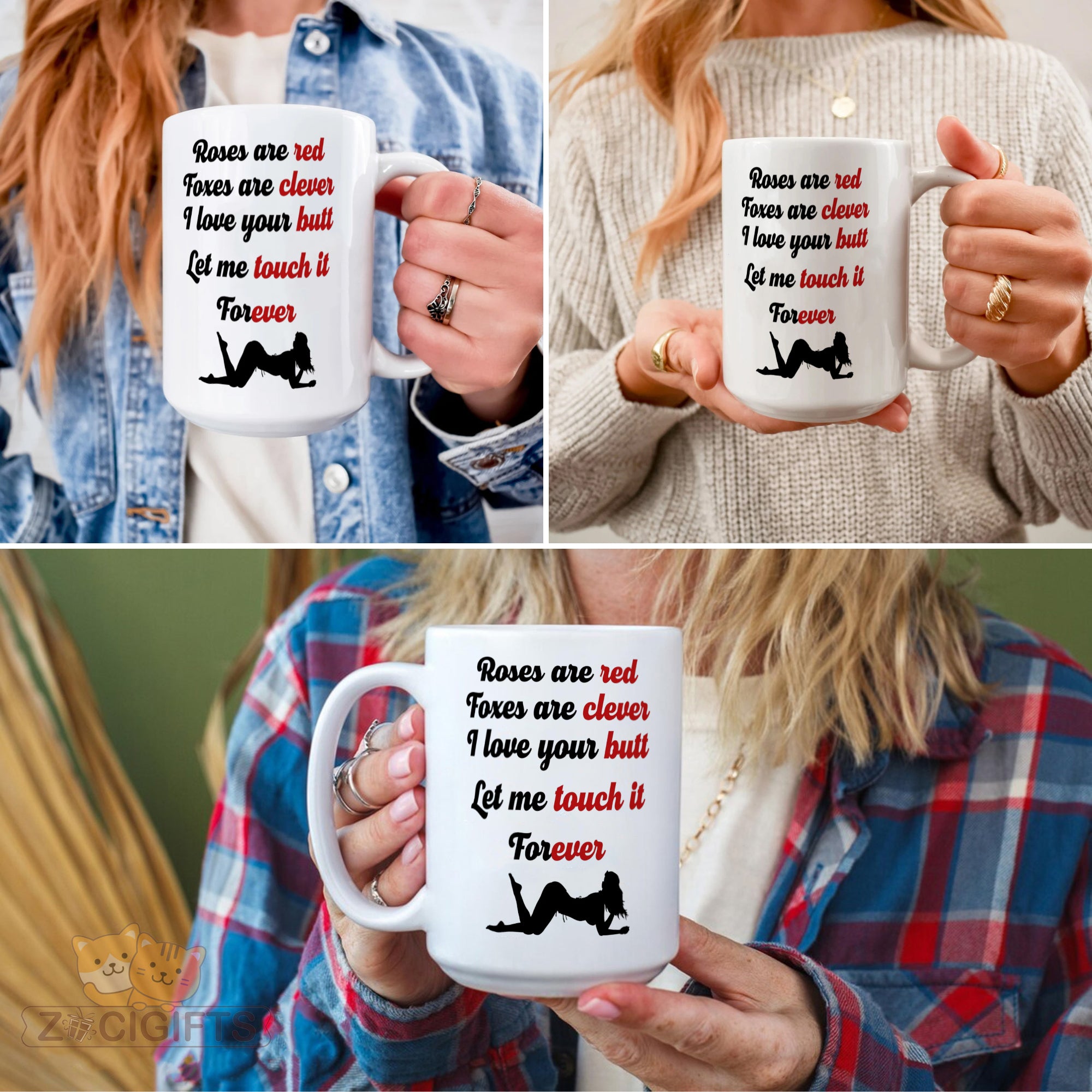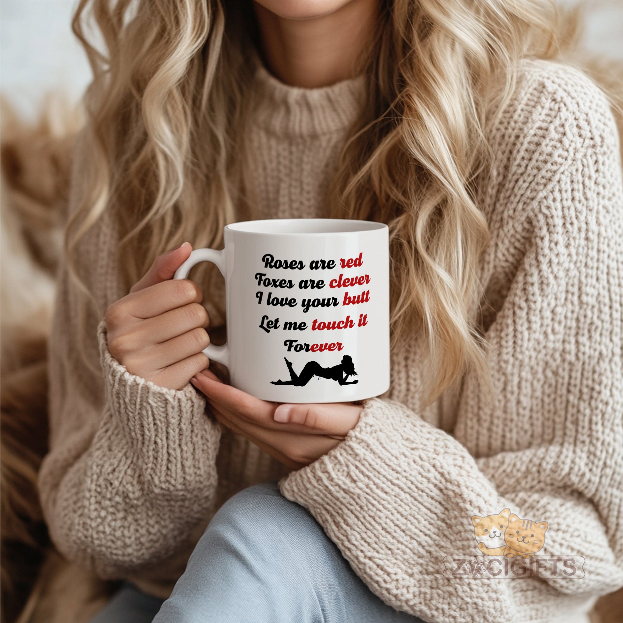 Add a touch of humor and romance to your daily routine with our unique mug! This white ceramic mug features a playful and flirty poem that goes: "Roses are red, Foxes are clever, I love your butt, Let me touch it Forever". The cheeky words are paired with a silhouette of a woman in a seductive pose, making it a perfect conversation starter or a fun gift for your loved ones. Whether you're looking to surprise your partner, add some spice to your morning coffee, or simply have a good laugh while sipping your tea, this mug is a great choice. It's made from high - quality materials, ensuring durability and a comfortable grip. The smooth finish makes it easy to clean, whether you use it in the microwave or dishwasher. This mug also makes an ideal gift for special occasions such as Valentine's Day, anniversaries, birthdays, or just as a random act of kindness. Show your sense of humor and love with this one - of - a - kind mug. Get yours today and enjoy a little fun in every sip!