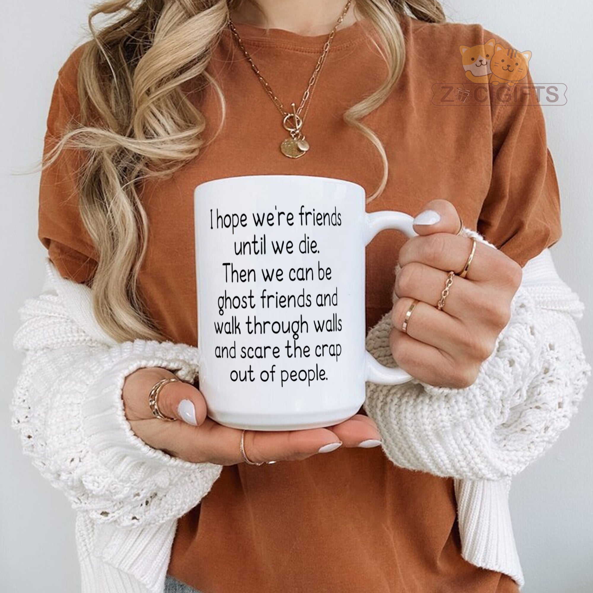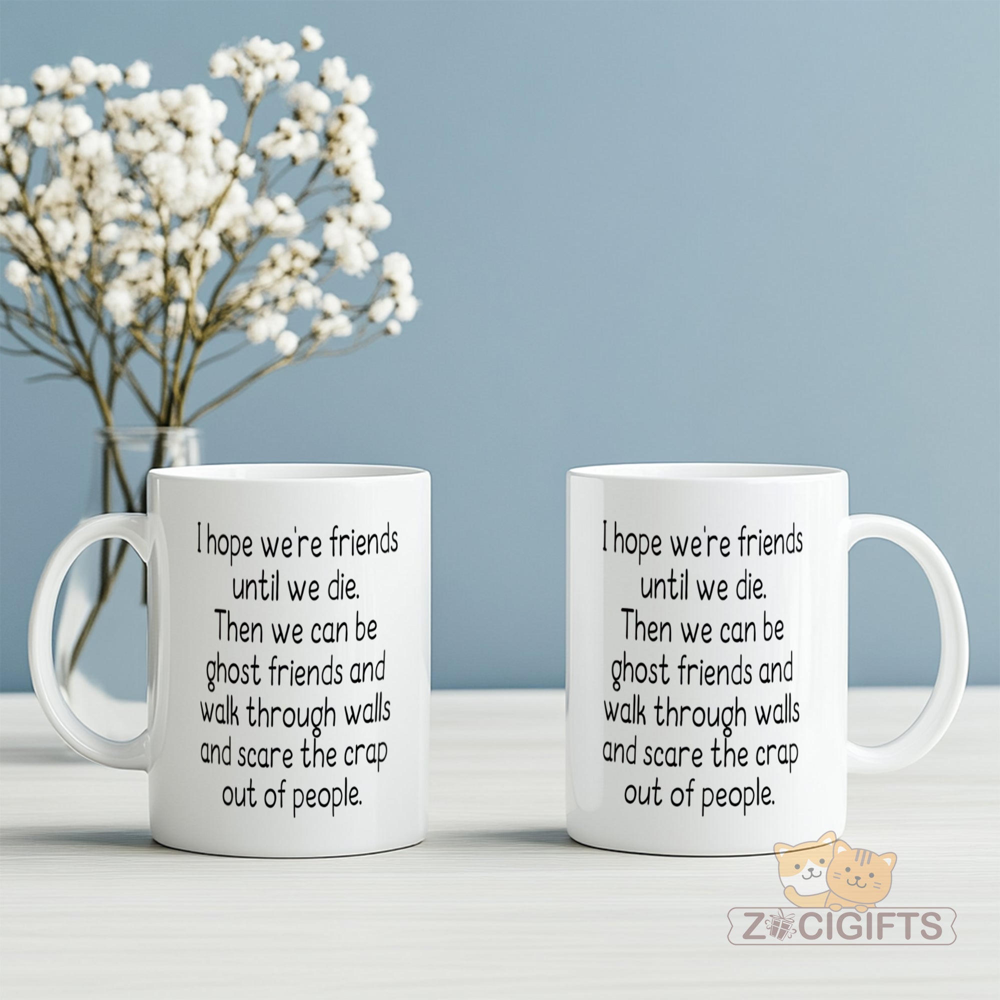 Introducing our hilarious "Ghost Friends" mug, the perfect blend of humor and friendship! This white ceramic mug features a witty slogan that reads, "I hope we're friends until we die. Then we can be ghost friends and walk through walls and scare the crap out of people." Whether you're sipping your morning coffee, enjoying an afternoon tea, or sharing a drink with your closest pal, this mug is sure to bring a smile to your face and spark conversations.