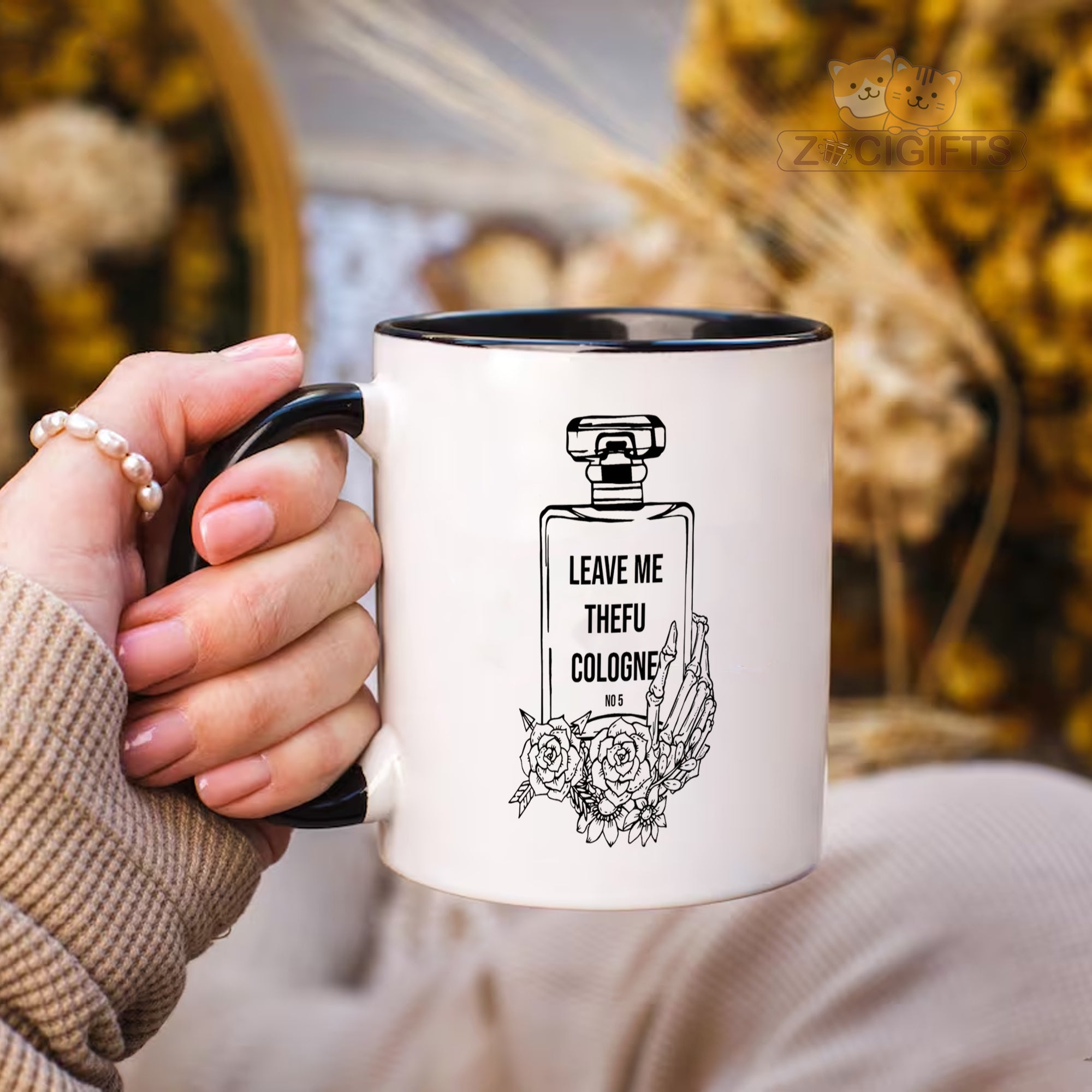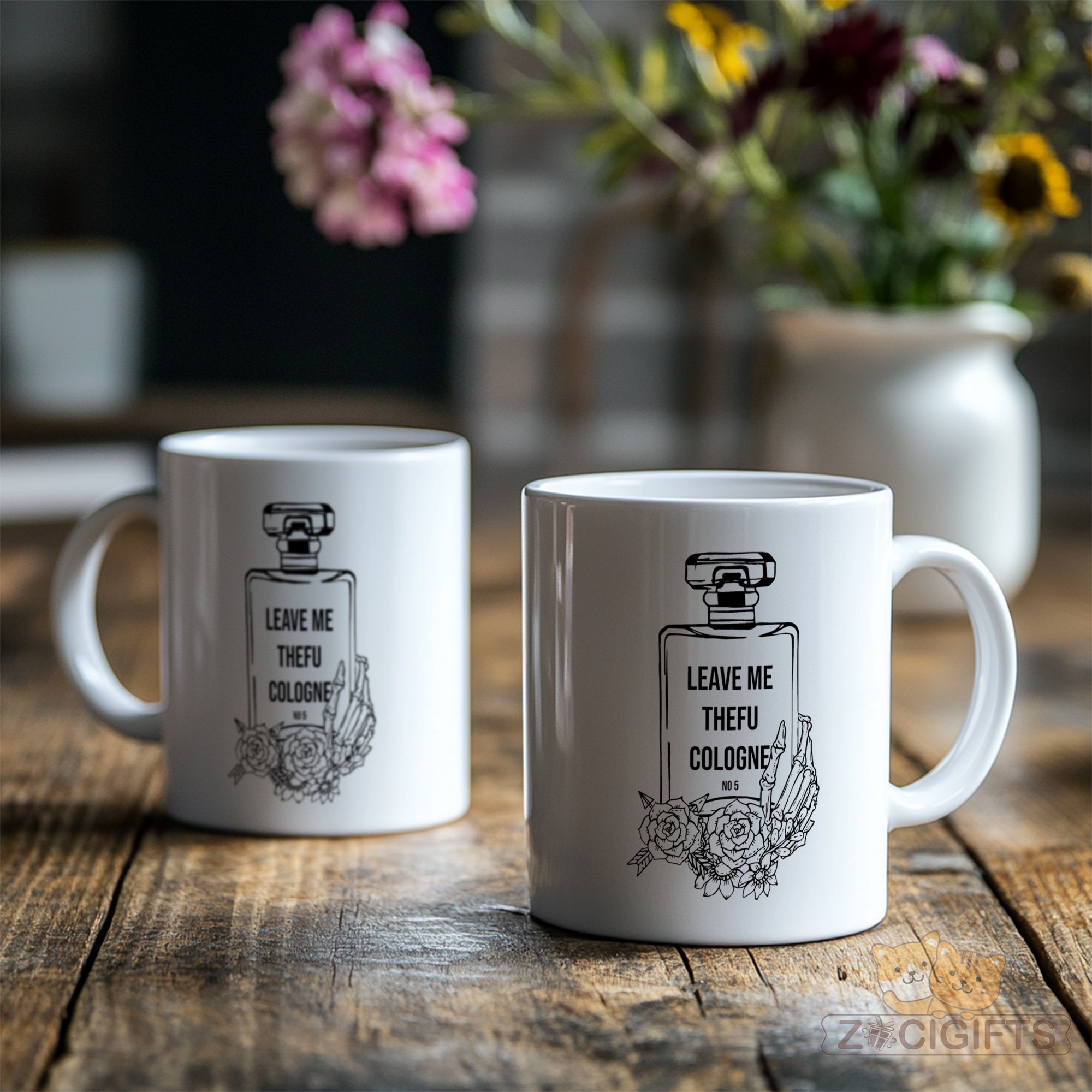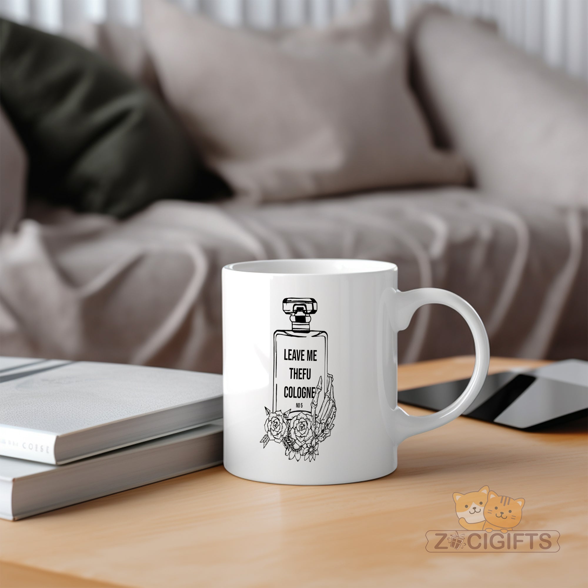 Feast your eyes on the sleek artwork: a classic perfume bottle design takes center stage, with the bold text “LEAVE ME THEFU COLOGNE” adding a hilarious twist, surrounded by delicate floral details. It’s a perfect blend of high-fashion charm and lighthearted wit — ideal for your morning coffee, evening tea, or anytime you need a grin.