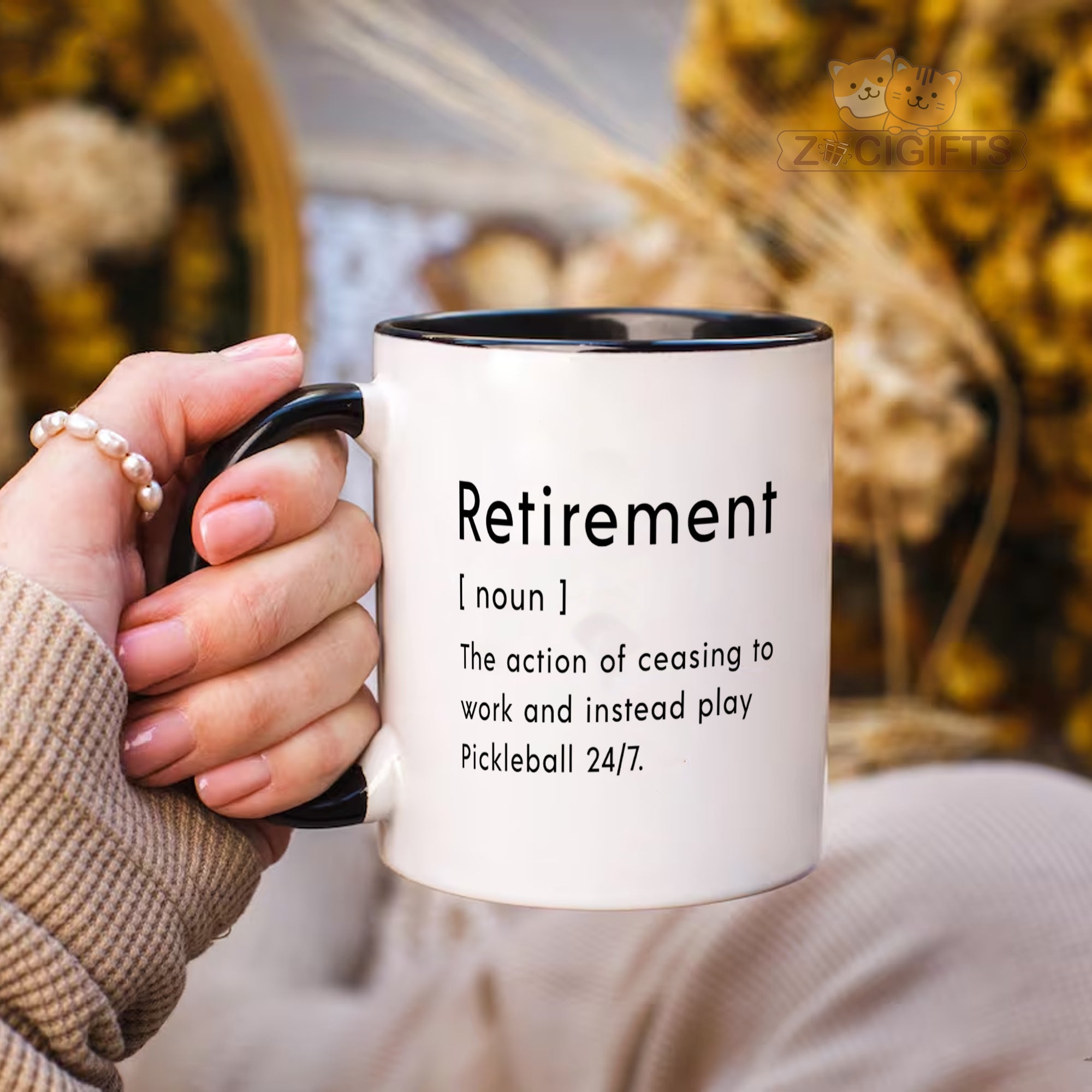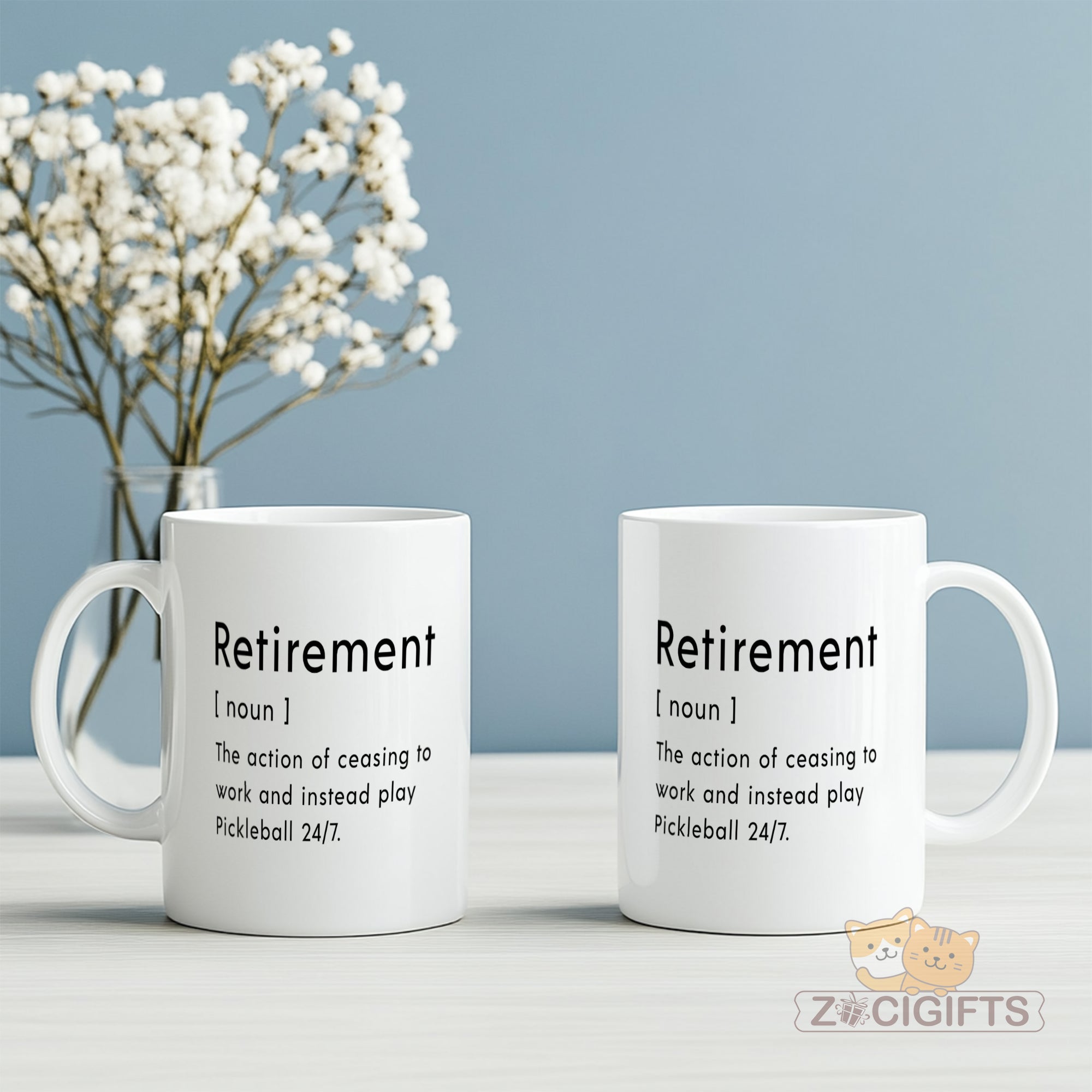 Celebrate retirement in style with this hilarious and heartwarming mug! Featuring a clever definition-style print that reads ¡°Retirement [noun] The action of ceasing to work and instead play Pickleball 24/7,¡± this novelty mug is the perfect gift for retirees, pickleball enthusiasts, or anyone who loves a good laugh. Whether you¡¯re treating yourself or gifting to a loved one, this mug brings joy and humor to every sip. Crafted from high-quality ceramic, it¡¯s durable, dishwasher safe, and designed to become your favorite daily companion. Toast to a life well-lived and countless hours of fun¡ªbecause retirement should be all about enjoying the little (and big!) things.