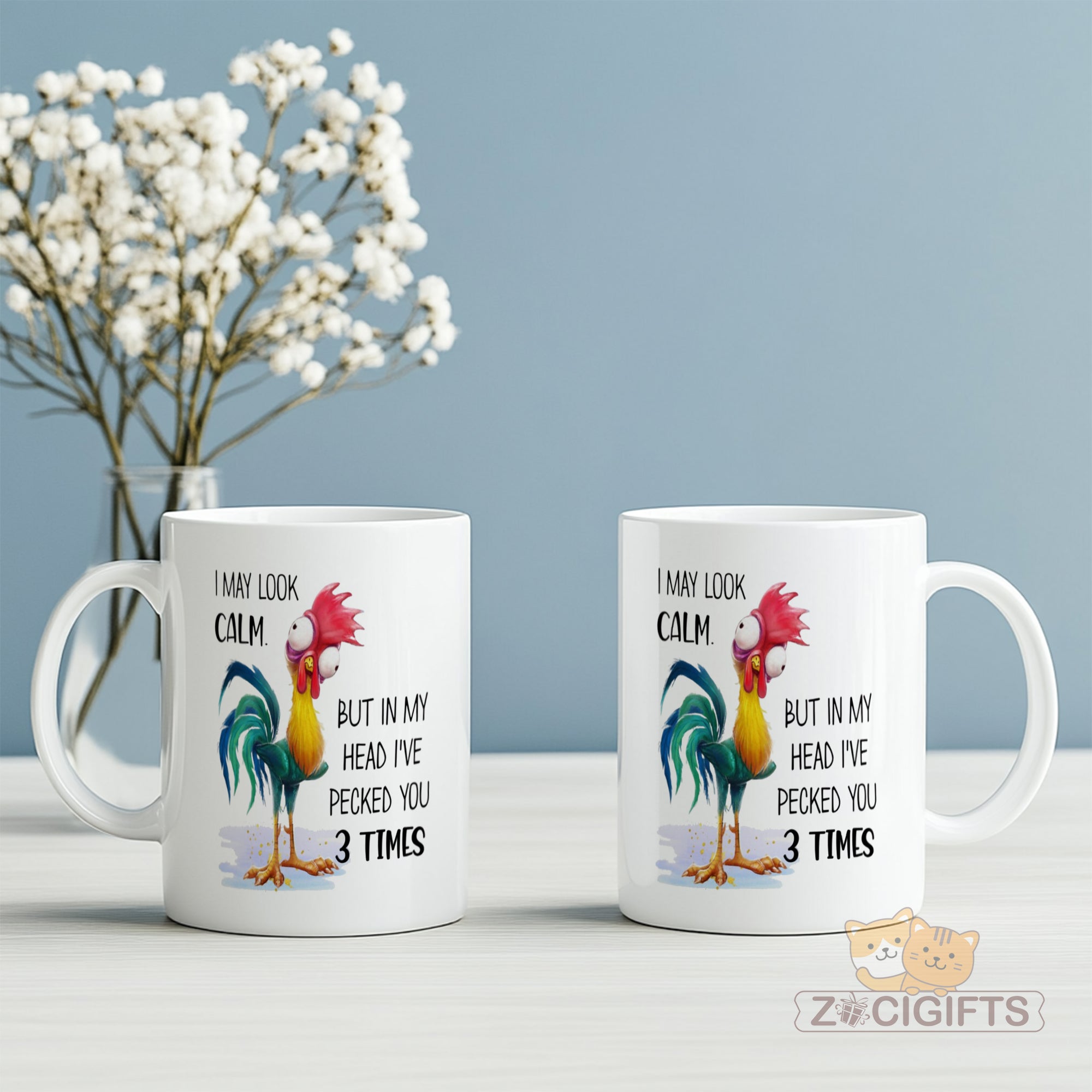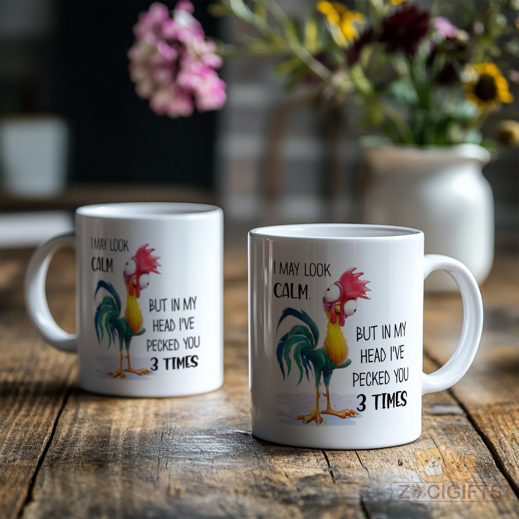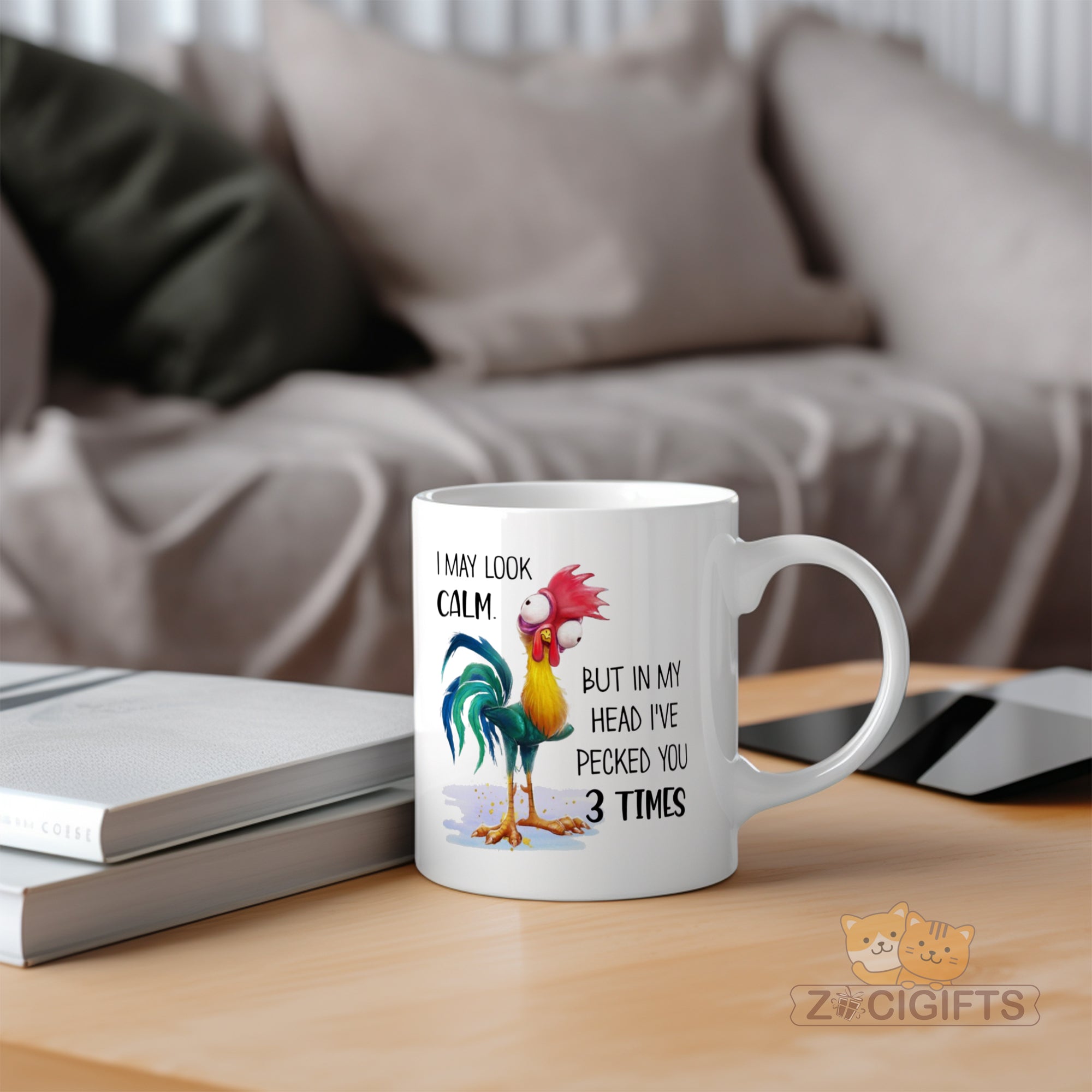 The design features a vibrant rooster with a cheeky expression, accompanied by the witty text "I MAY LOOK CALM. BUT IN MY HEAD I'VE PECKED YOU 3 TIMES". Whether you're sipping your morning coffee or enjoying an afternoon tea, this mug is sure to put a smile on your face and those around you.