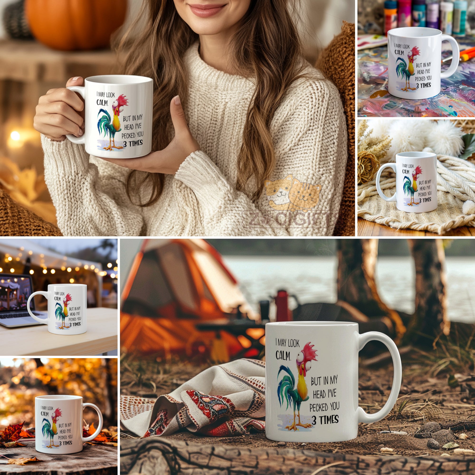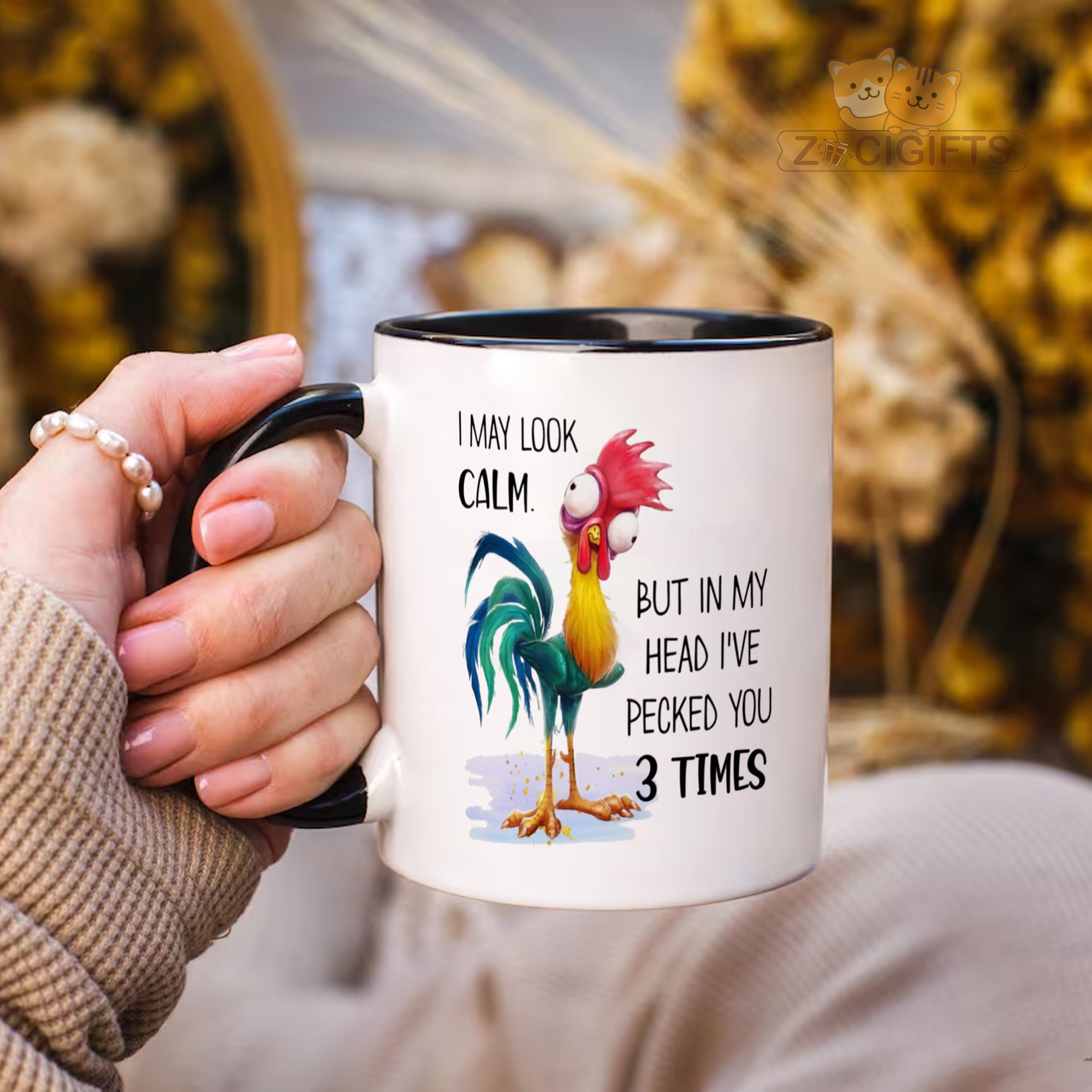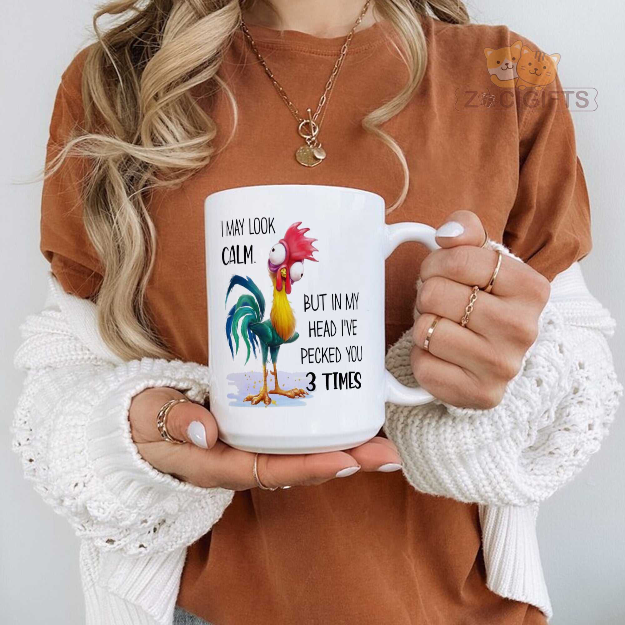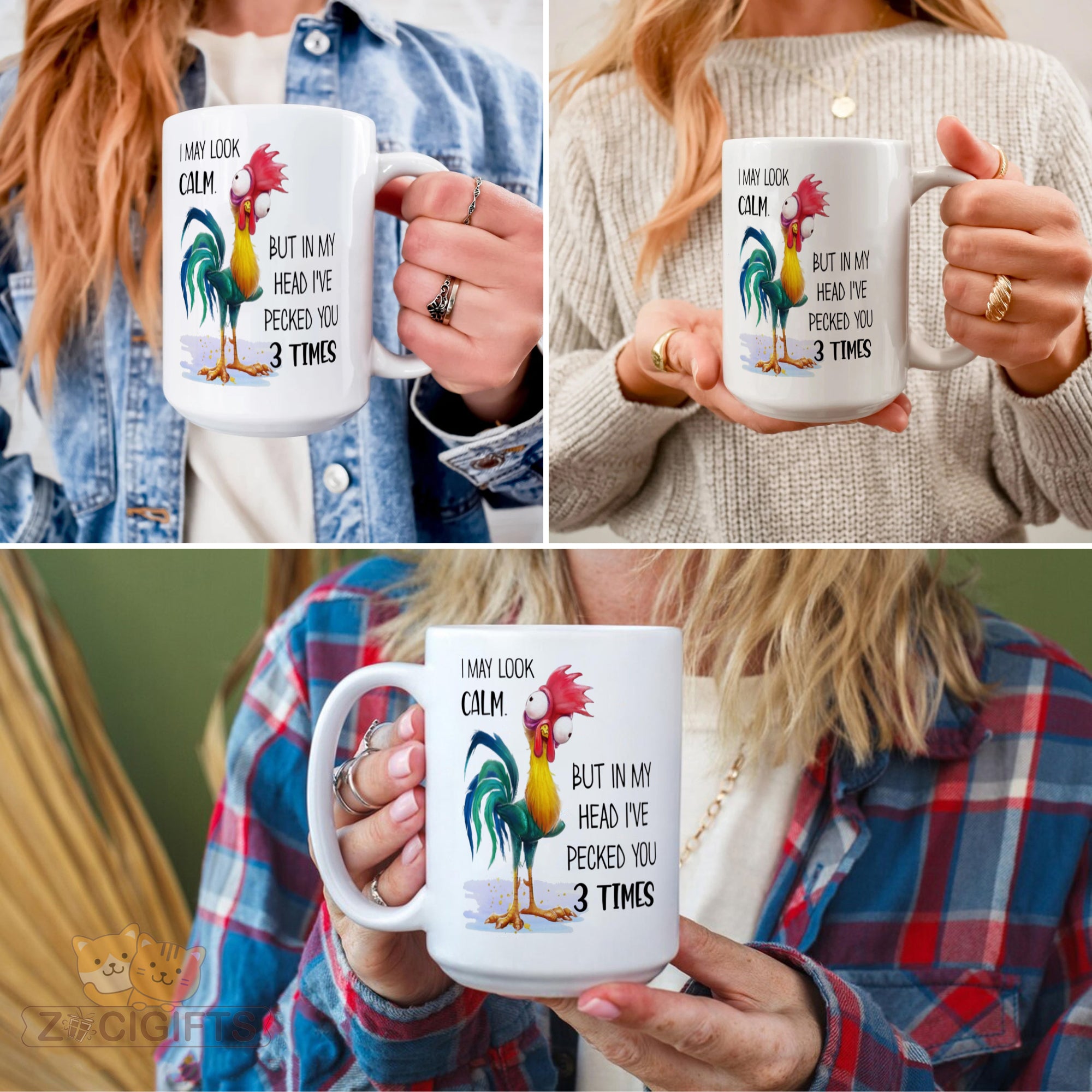 The design features a vibrant rooster with a cheeky expression, accompanied by the witty text "I MAY LOOK CALM. BUT IN MY HEAD I'VE PECKED YOU 3 TIMES". Whether you're sipping your morning coffee or enjoying an afternoon tea, this mug is sure to put a smile on your face and those around you.