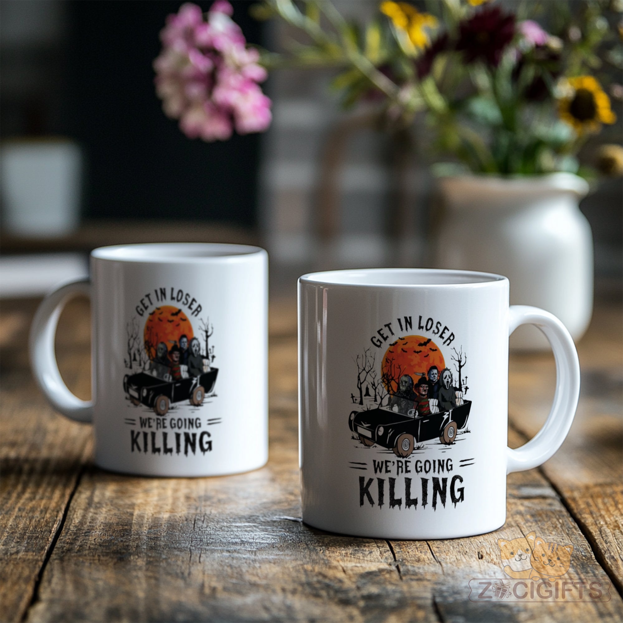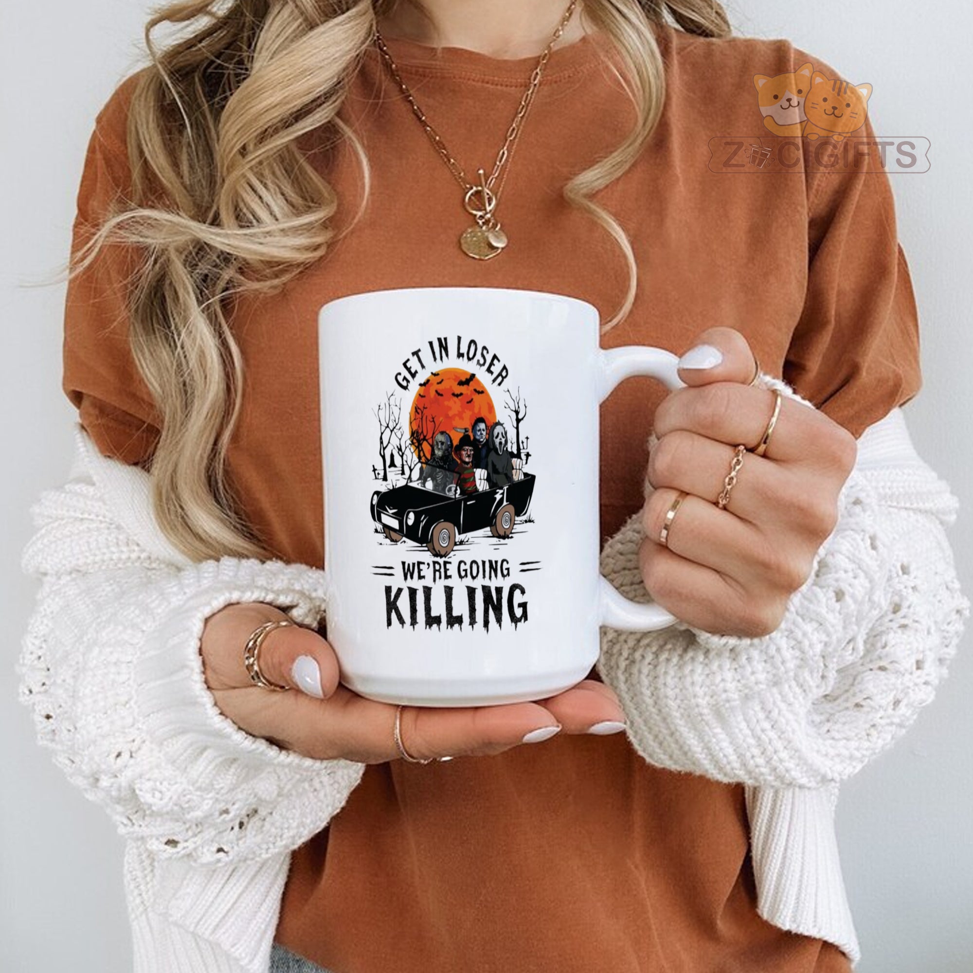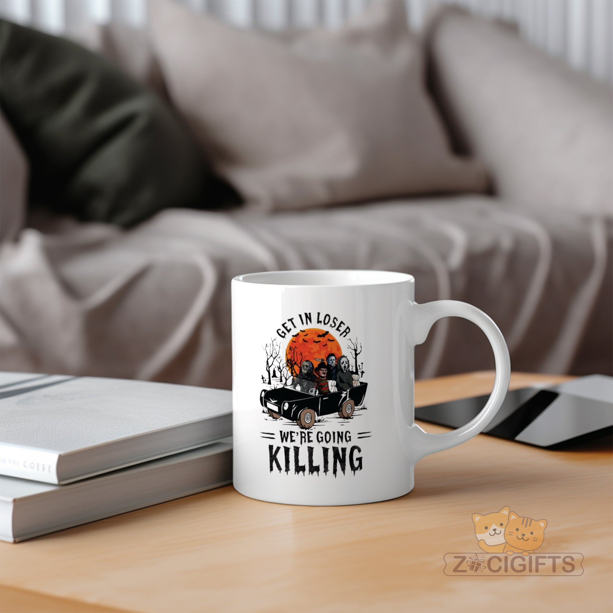 Introducing our one - of - a - kind Halloween - inspired mug! This ceramic mug features a thrilling design with iconic horror characters riding in a car under a spooky full moon. The bold text "Get in Loser, We're Going Killing" adds a touch of dark humor that horror enthusiasts will absolutely love.