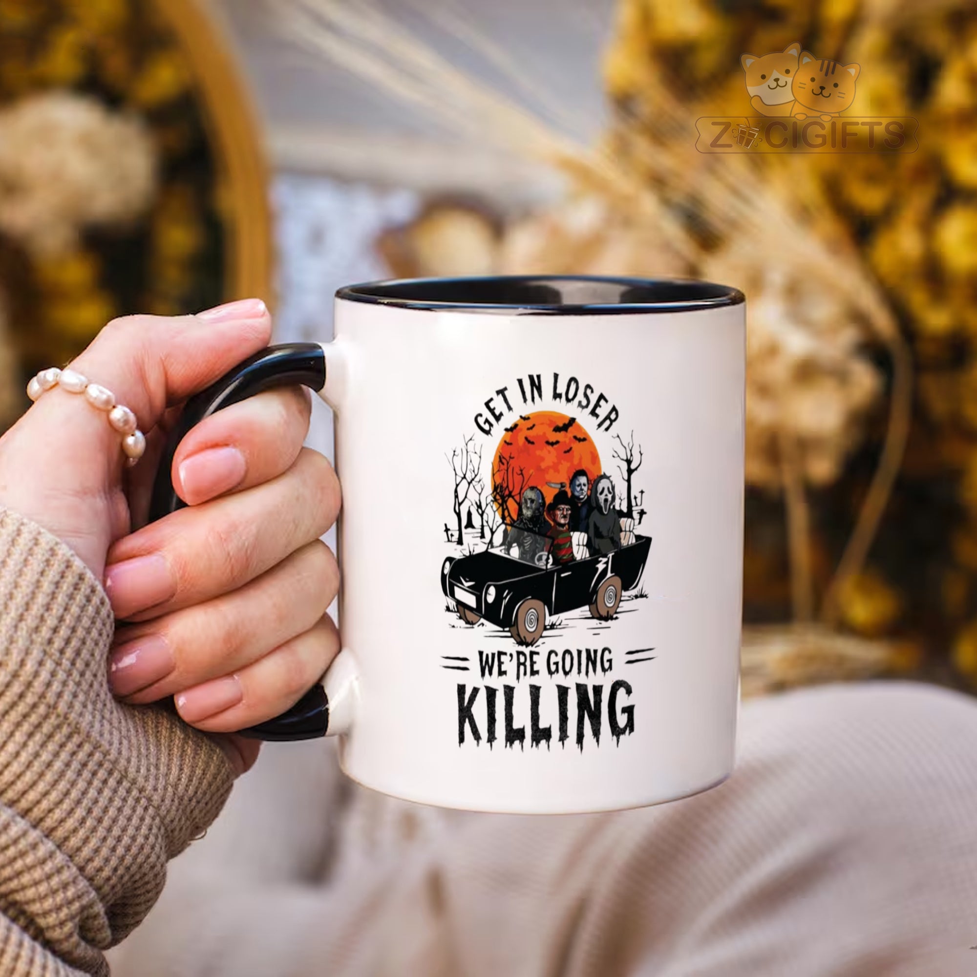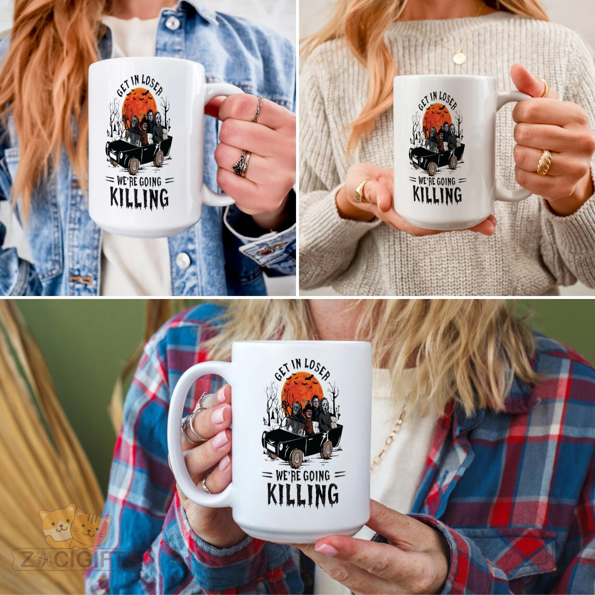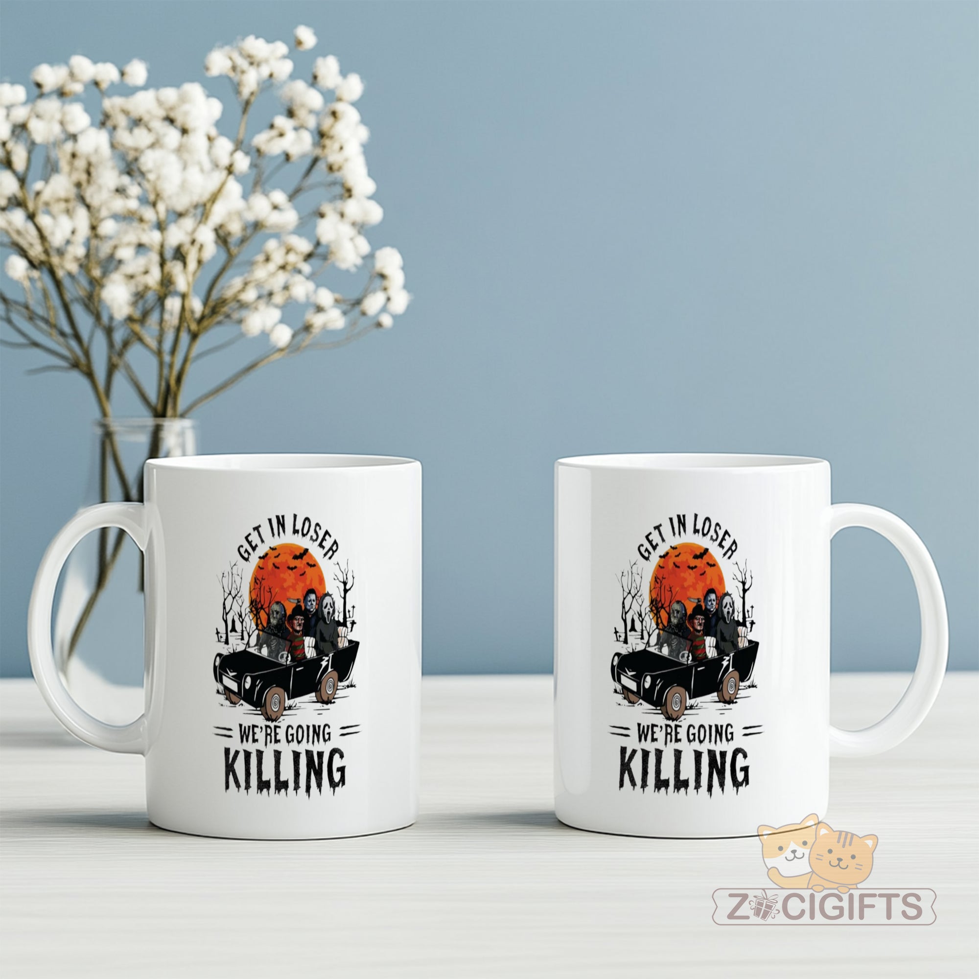 Introducing our one - of - a - kind Halloween - inspired mug! This ceramic mug features a thrilling design with iconic horror characters riding in a car under a spooky full moon. The bold text "Get in Loser, We're Going Killing" adds a touch of dark humor that horror enthusiasts will absolutely love.