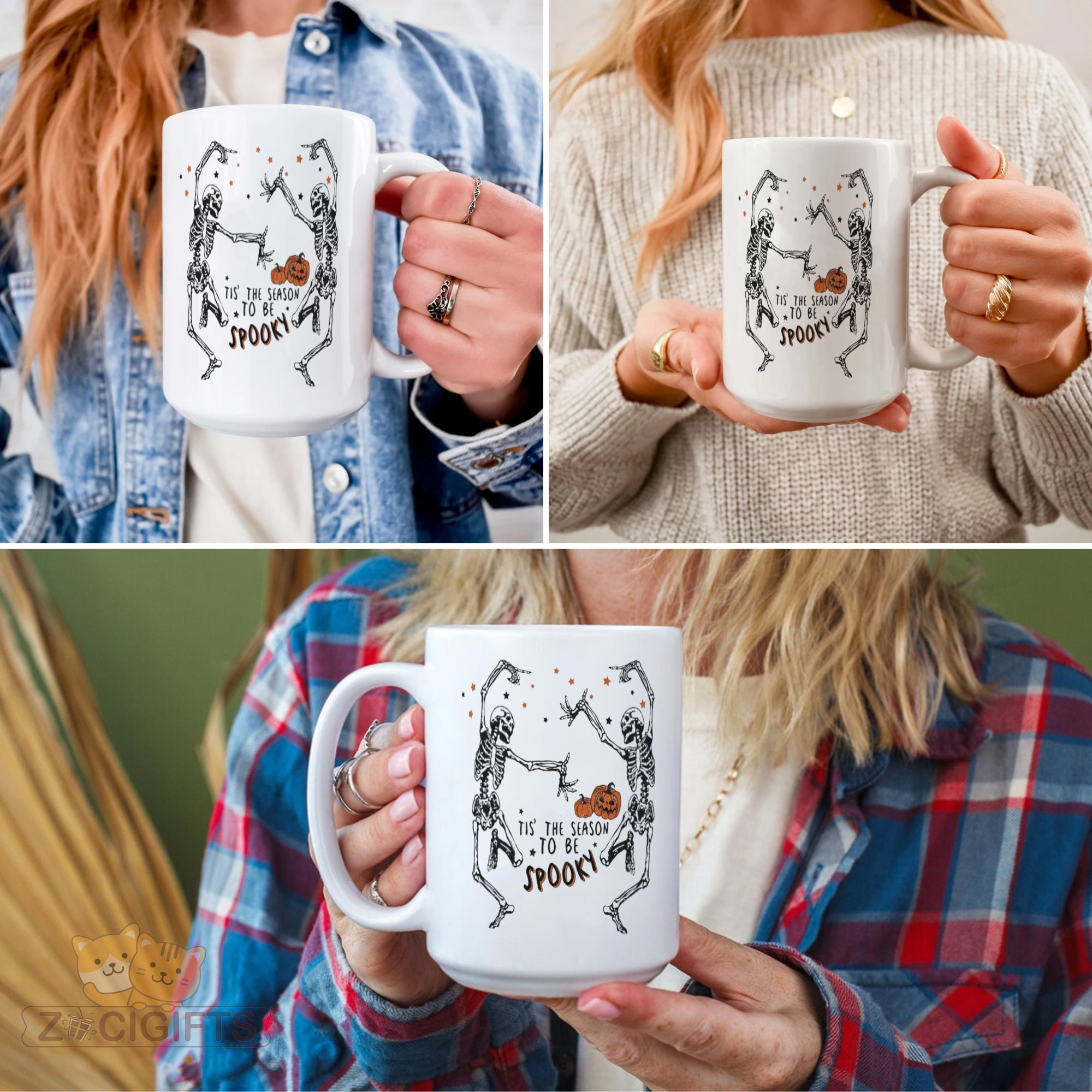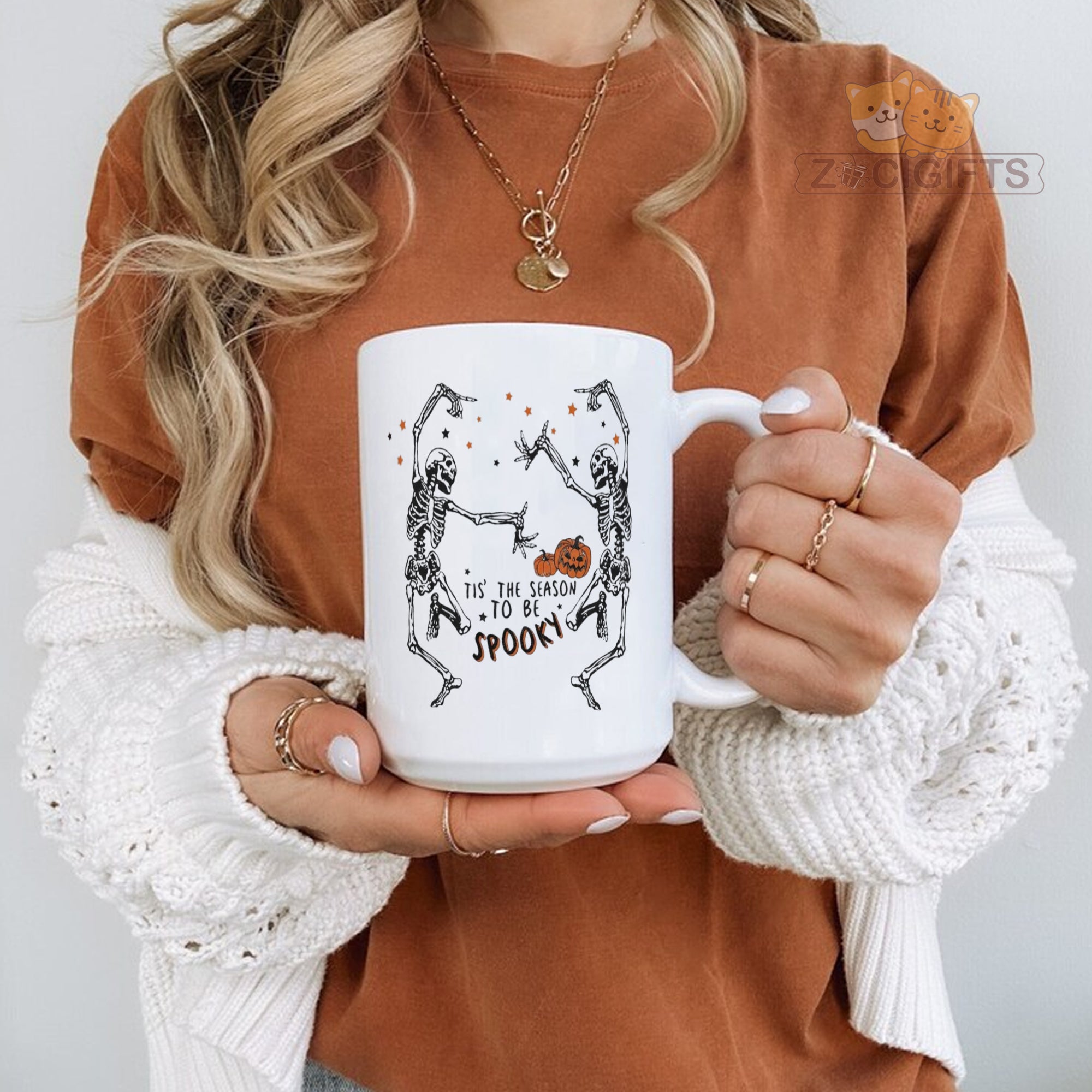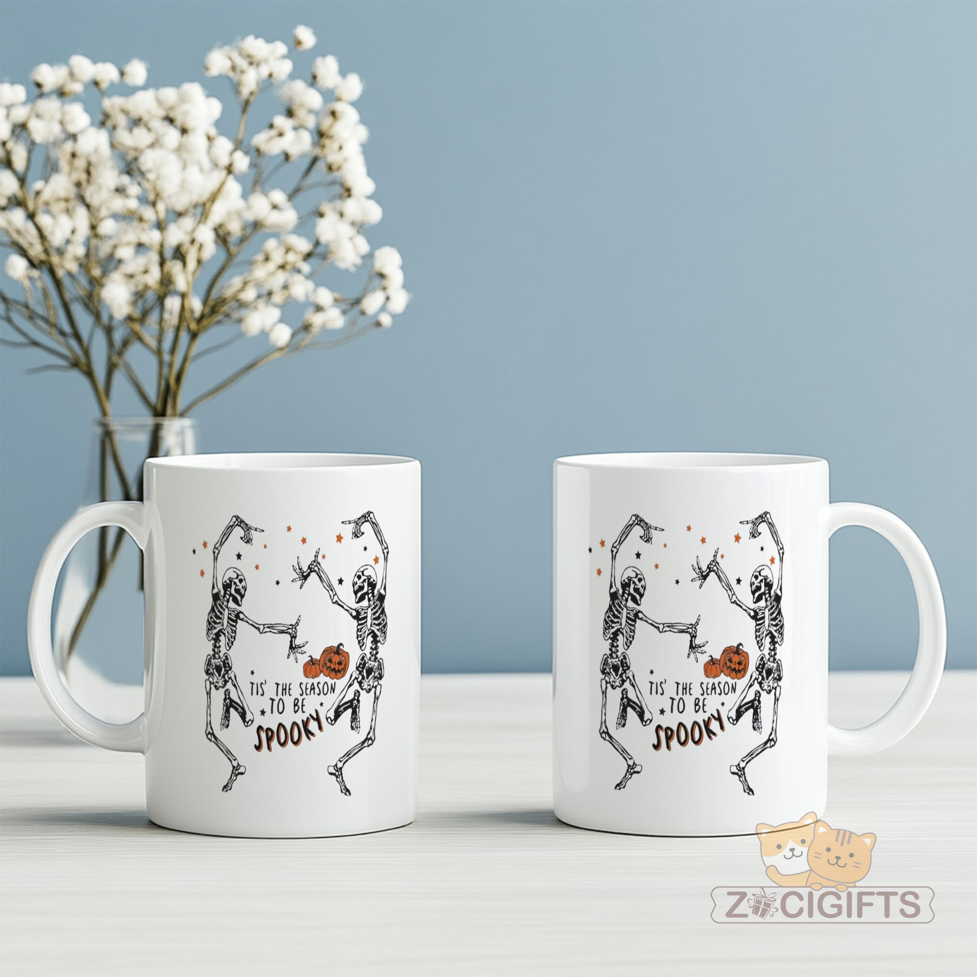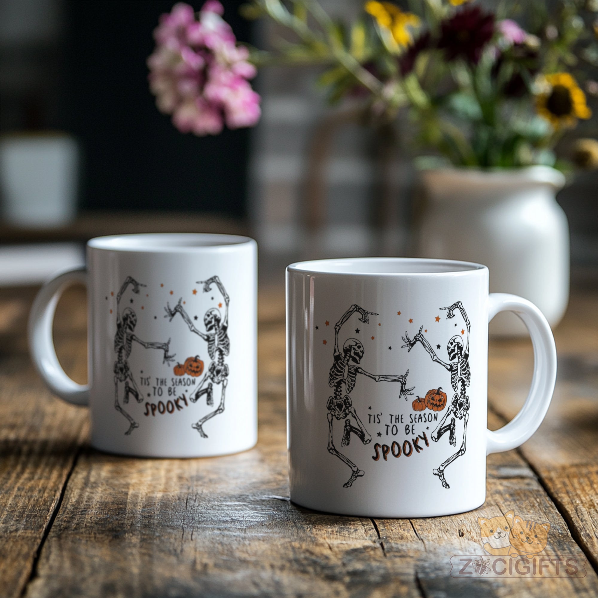 Introducing our delightful Halloween - themed mug! This white ceramic mug features an eye - catching design of two skeletons joyfully dancing around two adorable jack - o'- lanterns. The phrase "Tis The Season To Be Spooky" is perfectly placed in the center, adding a touch of spooky charm to your daily coffee or tea routine.