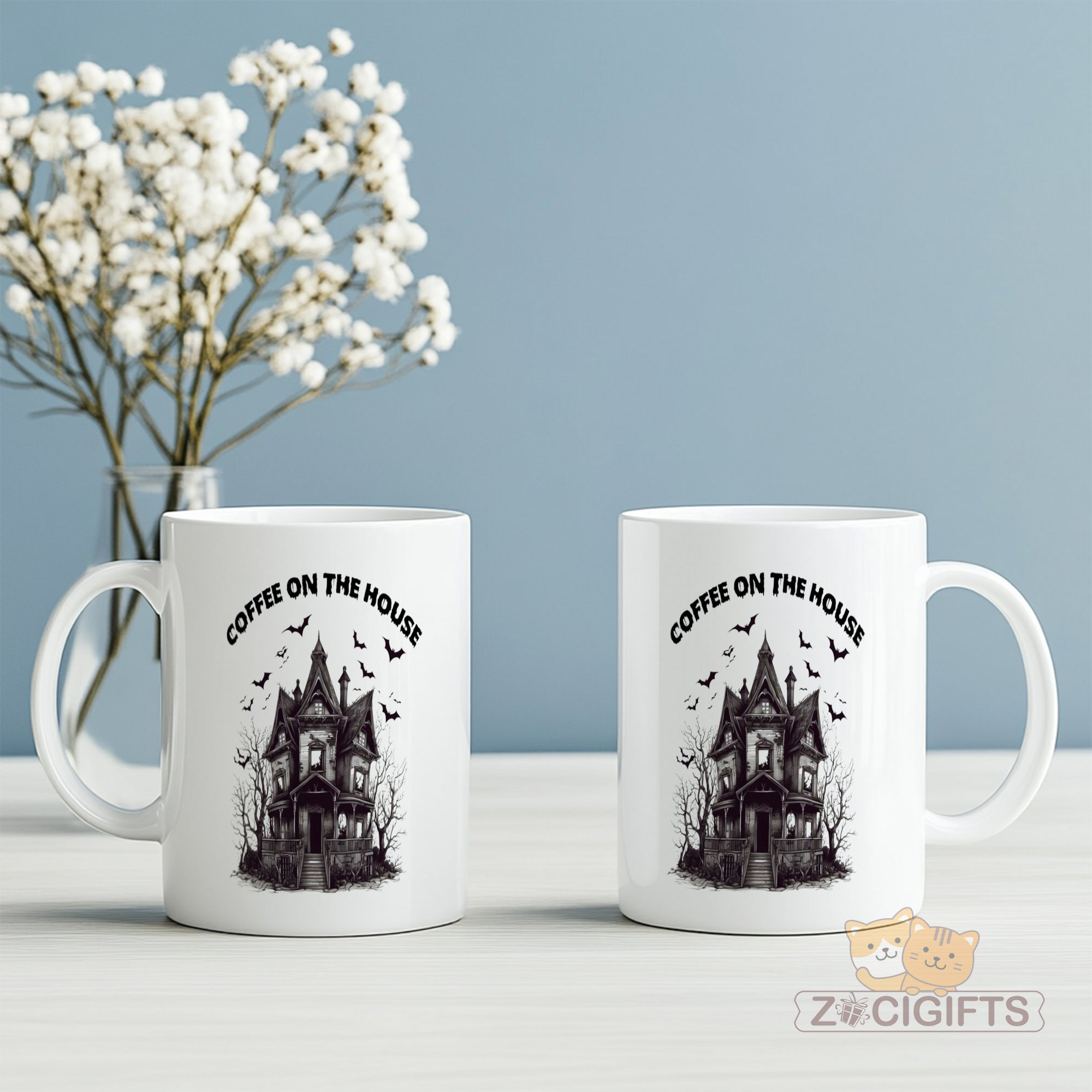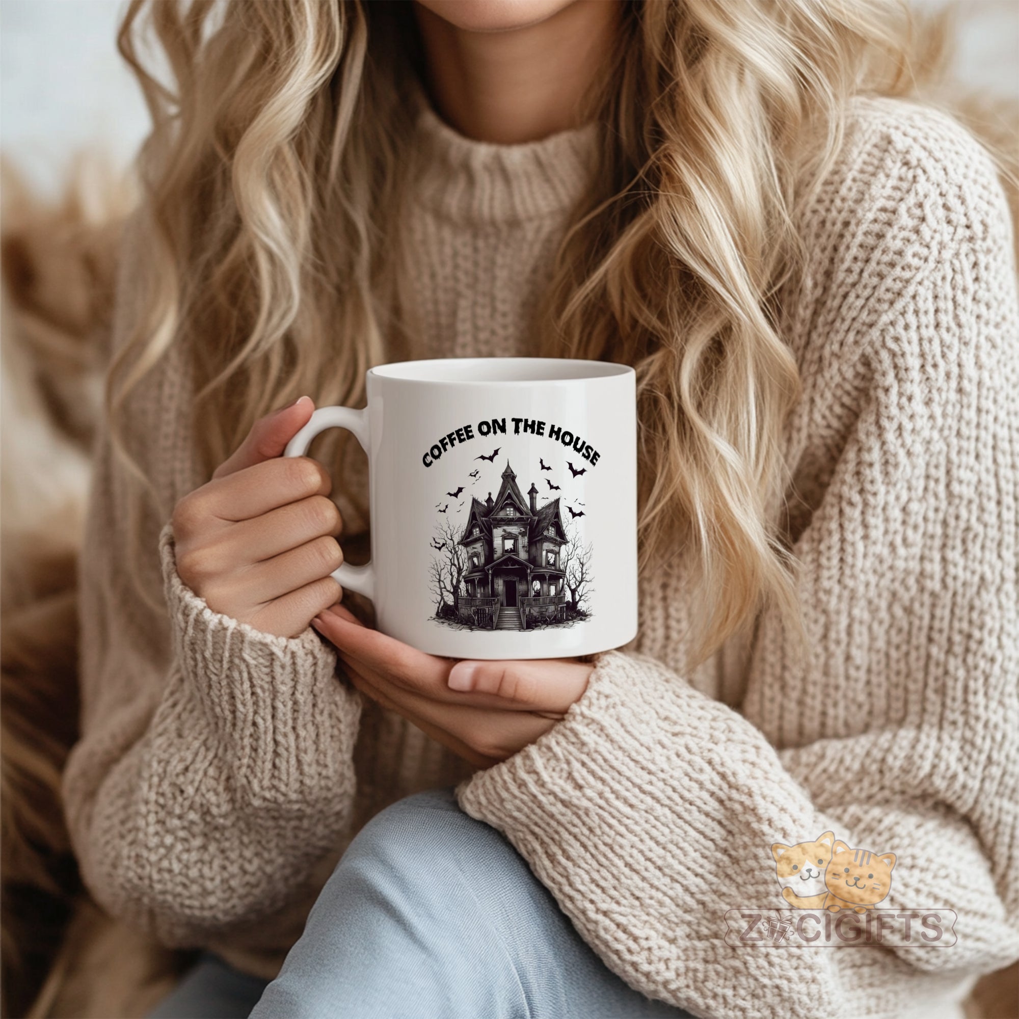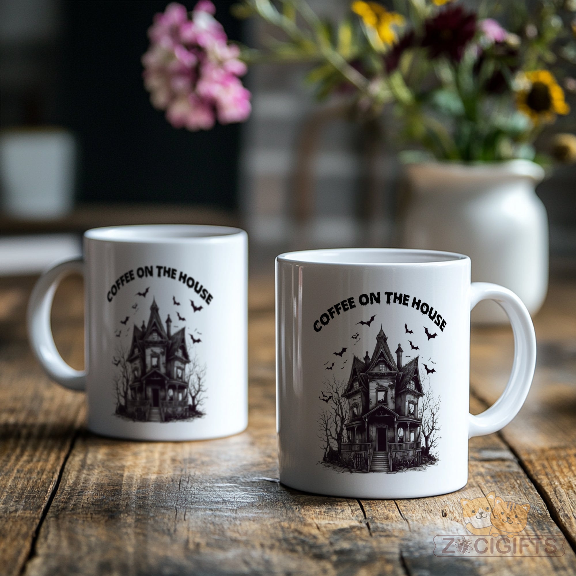 Introducing our one - of - a - kind "Coffee on the House" mug, featuring a spooky haunted house design that's sure to add a touch of eerie charm to your daily routine!