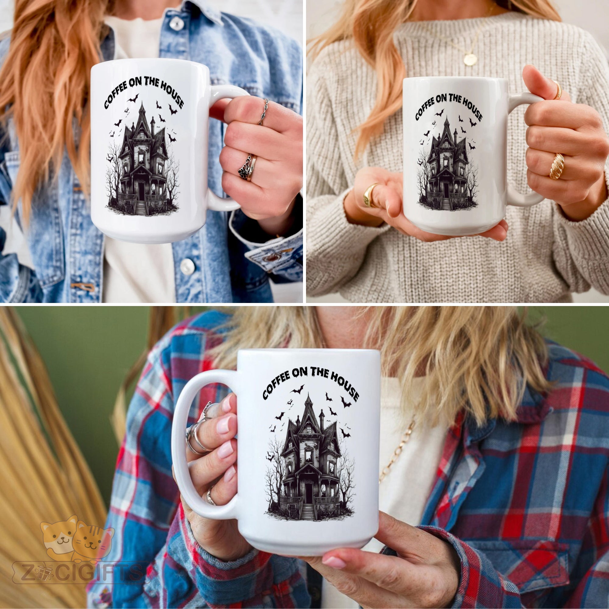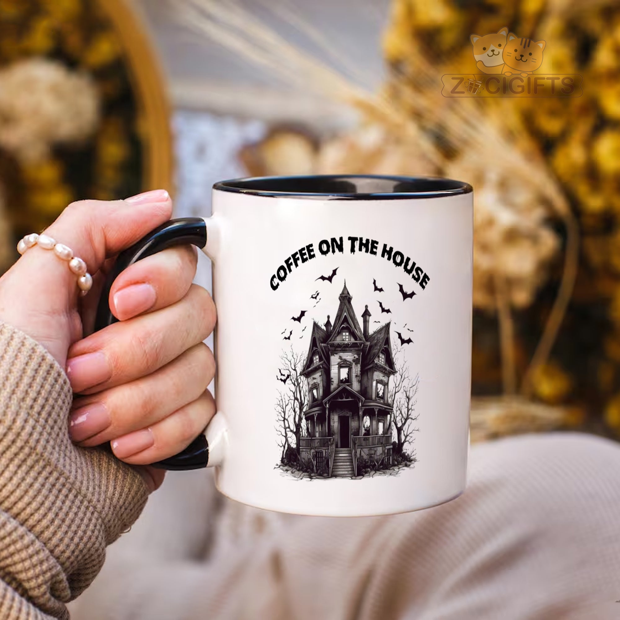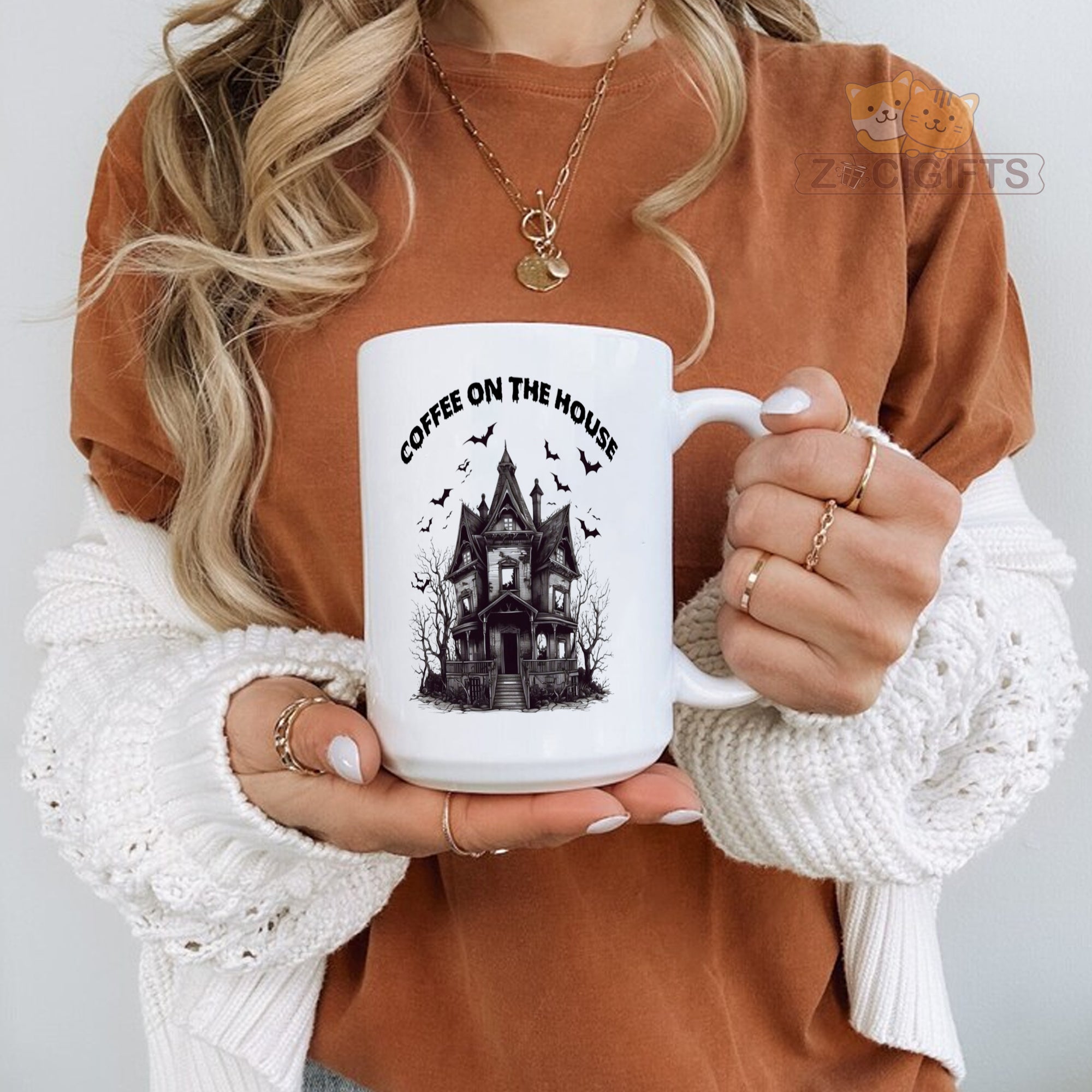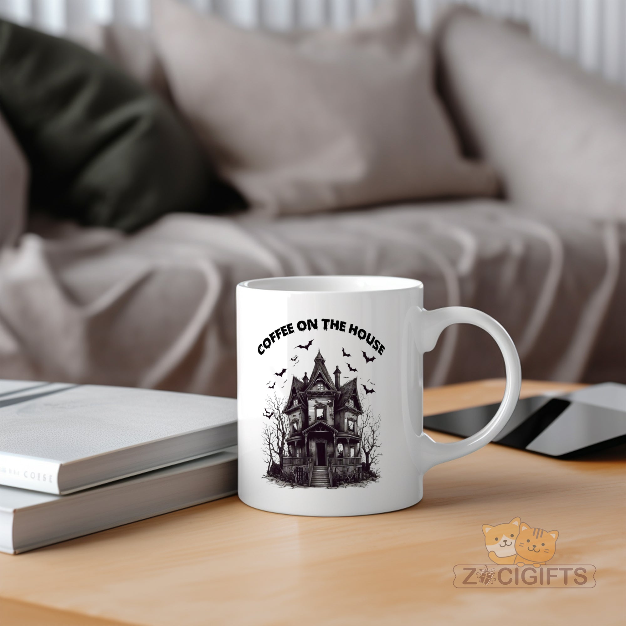 Introducing our one - of - a - kind "Coffee on the House" mug, featuring a spooky haunted house design that's sure to add a touch of eerie charm to your daily routine!