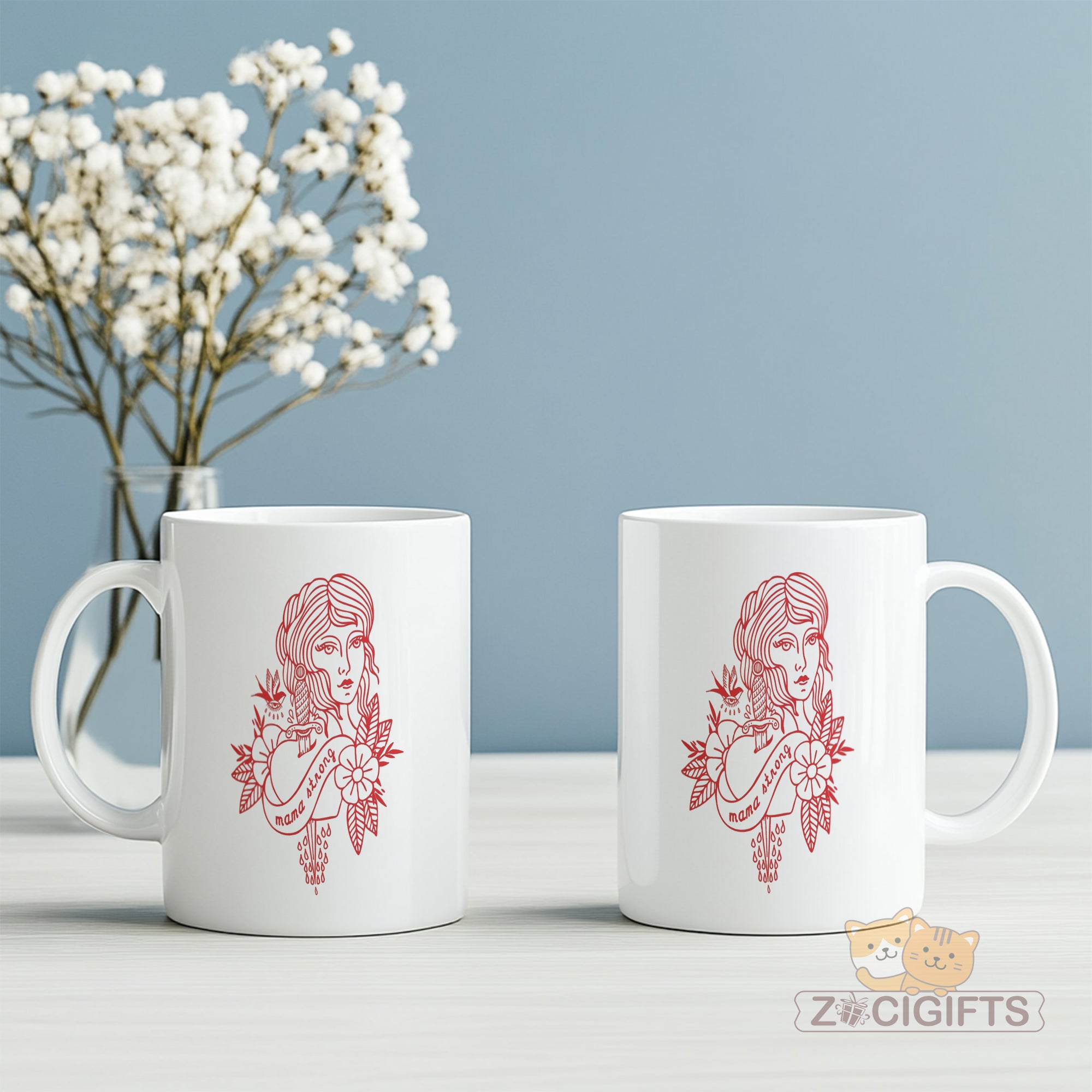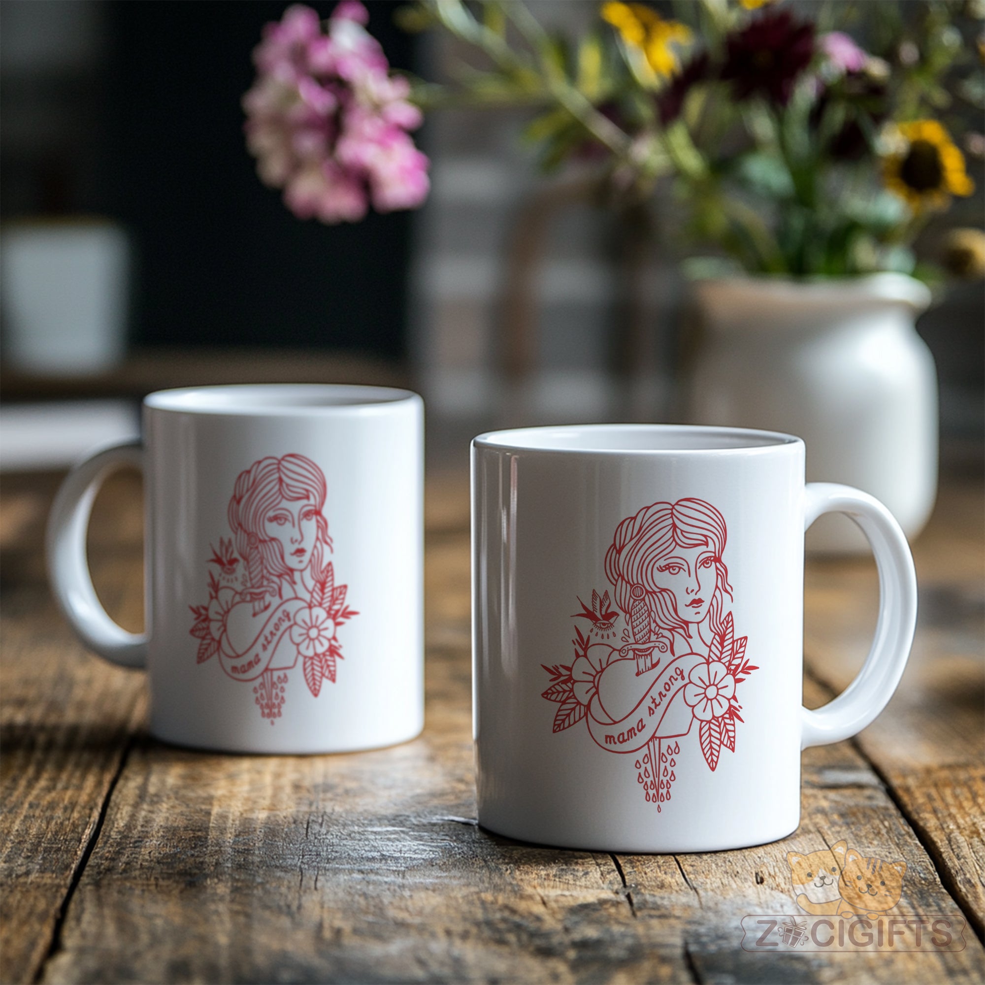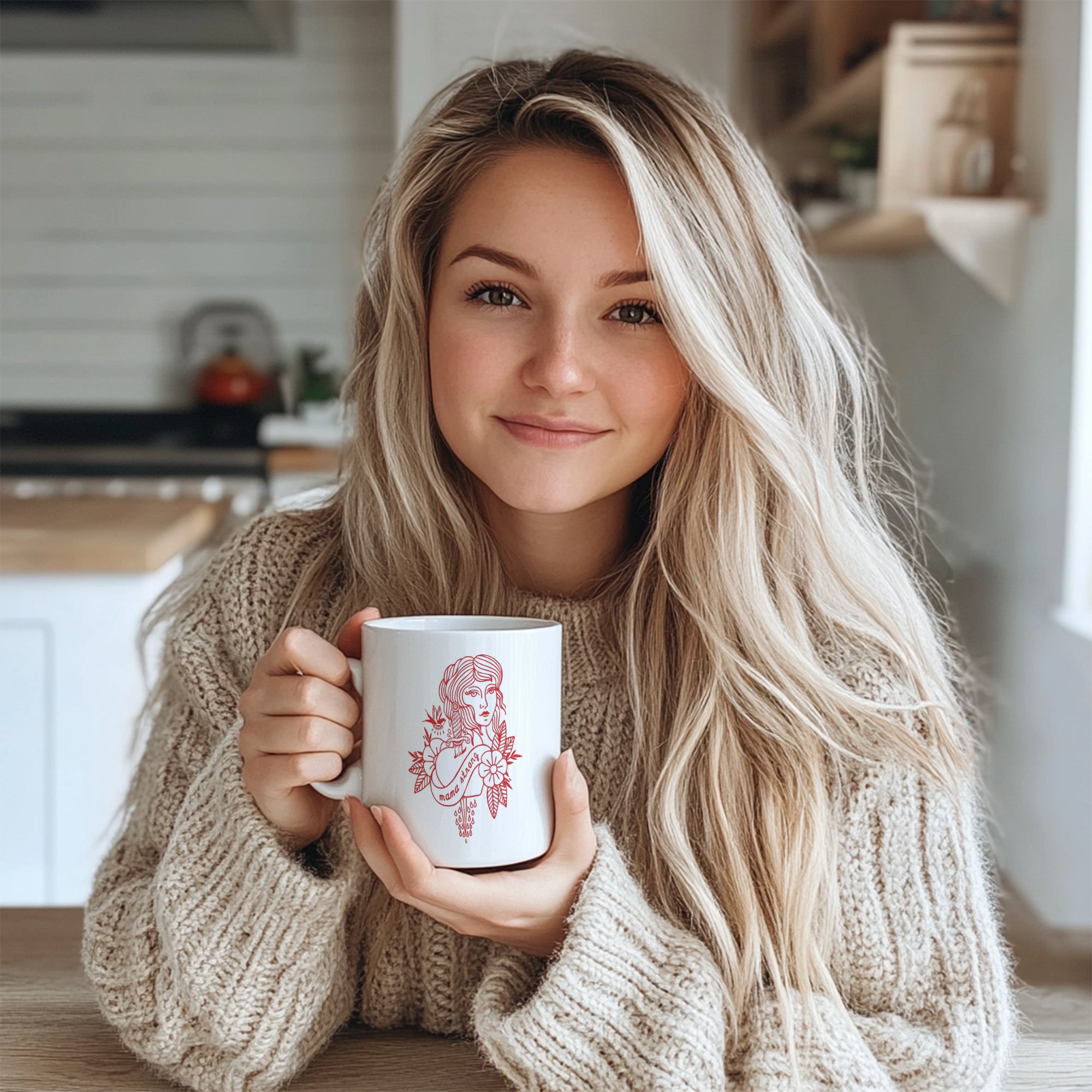 Feast your eyes on the bold red artwork: a detailed feminine portrait paired with a sword, floral elements, and the empowering phrase “mama strong”. It blends vintage tattoo aesthetics with a celebration of mom power — ideal for your morning coffee, evening tea, or anytime you want to feel uplifted.