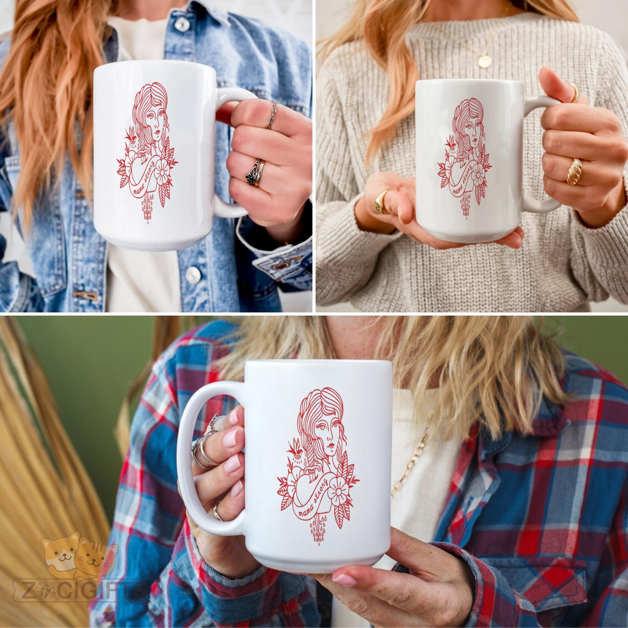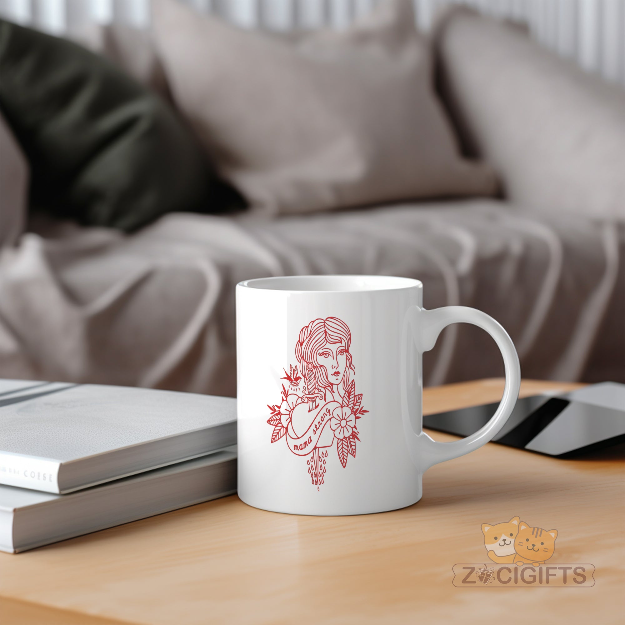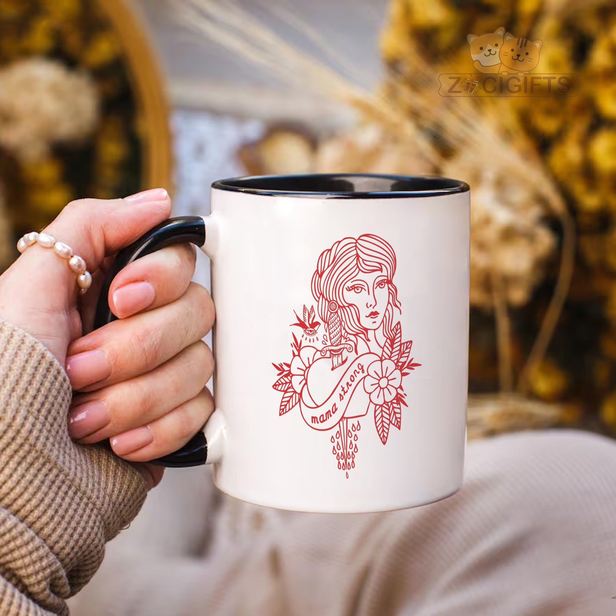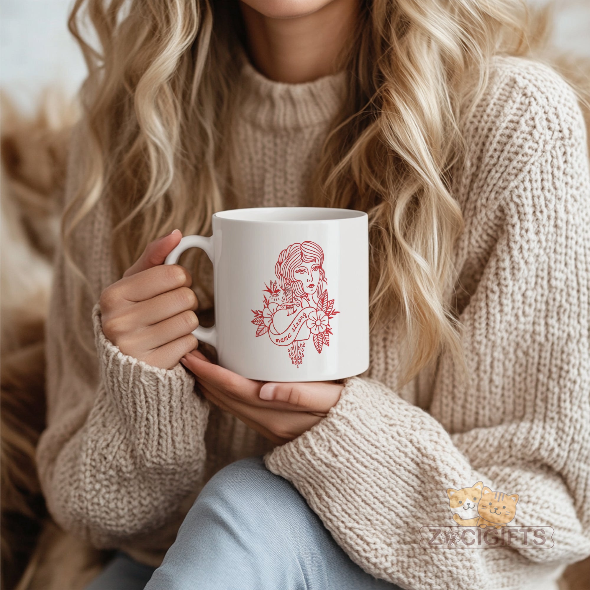 Feast your eyes on the bold red artwork: a detailed feminine portrait paired with a sword, floral elements, and the empowering phrase “mama strong”. It blends vintage tattoo aesthetics with a celebration of mom power — ideal for your morning coffee, evening tea, or anytime you want to feel uplifted.