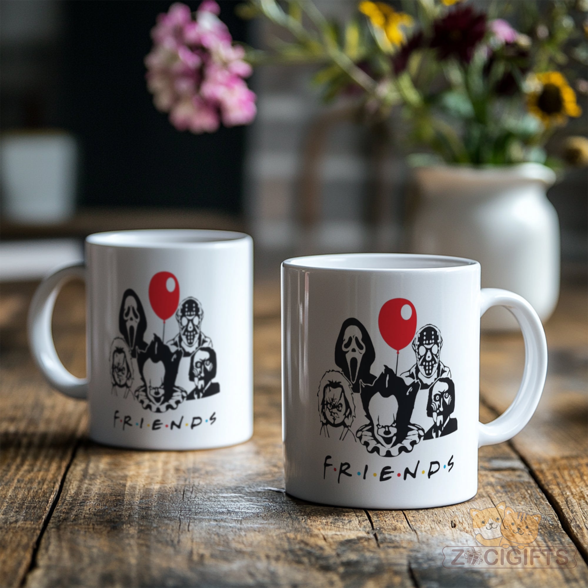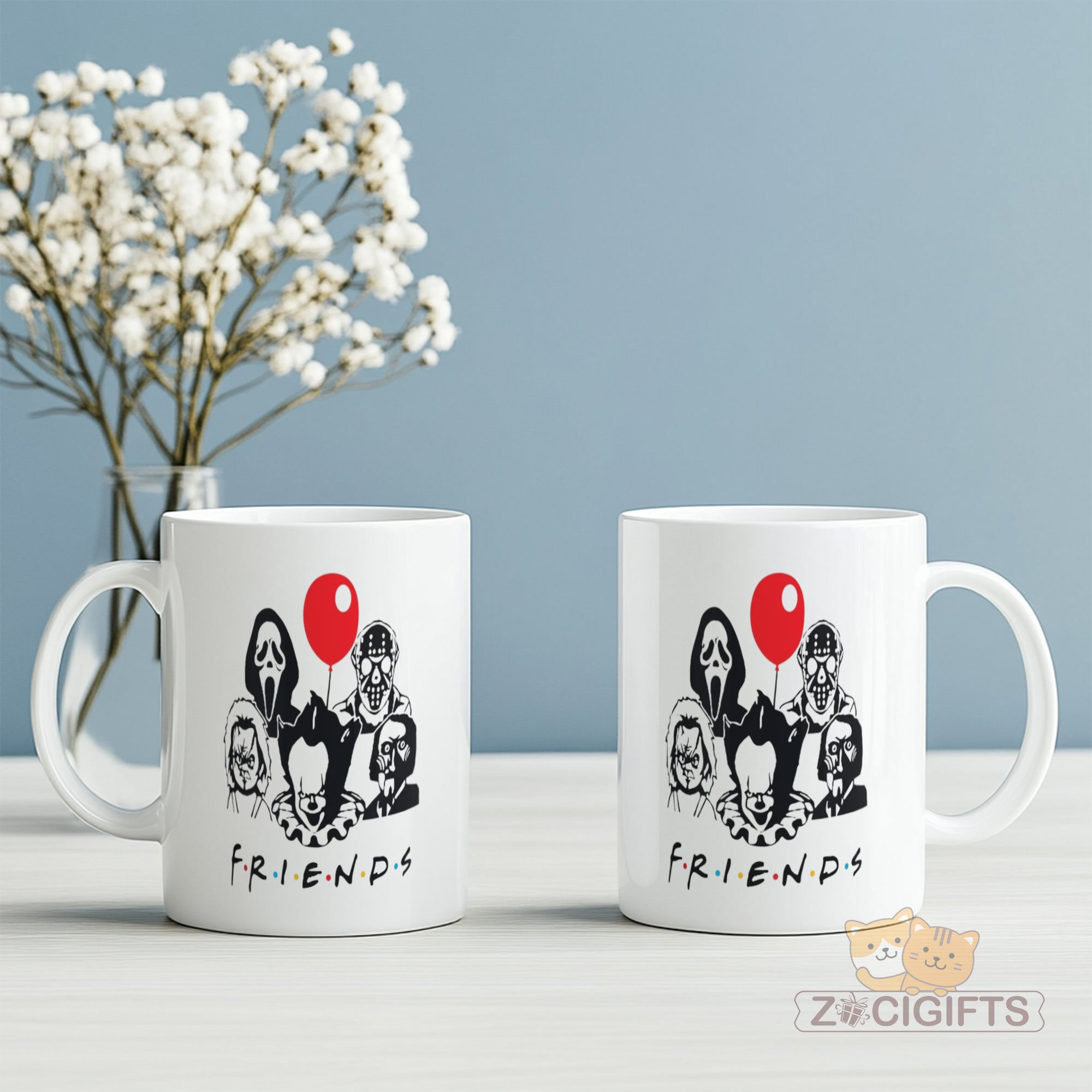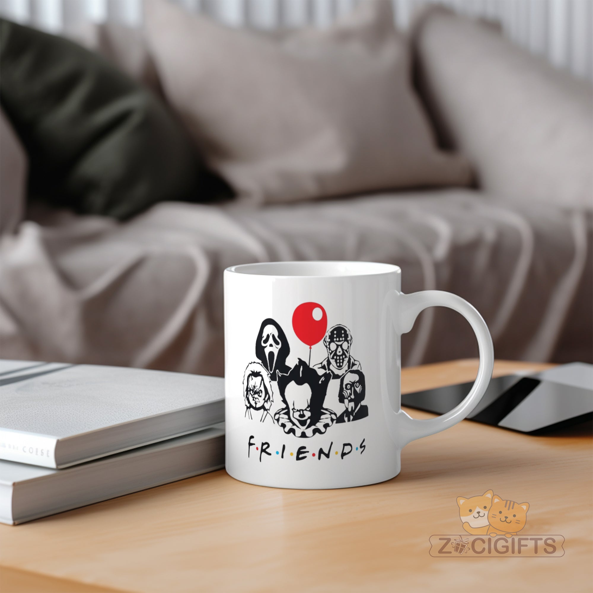 Introducing our unique Scary Friends Mug, a must - have for all horror movie enthusiasts! This isn't just any ordinary mug; it features an eye - catching design of iconic horror movie characters grouped together, with the word "FRIENDS" playfully displayed below. The black and white illustrations of these terrifying yet beloved characters are sure to add a touch of spookiness and fun to your daily routine. Crafted from high - quality, durable ceramic, this mug is built to last. Whether you're sipping on your morning coffee, enjoying an afternoon tea, or having a late - night hot chocolate, this mug will keep your beverage warm and your spirits high. It makes for a great conversation starter at home, in the office, or when hosting horror - themed parties. Surprise your friends and family with this one - of - a - kind gift that perfectly combines their love for horror movies and functional drinkware. Don't miss out on adding this special Scary Friends Mug to your collection today!