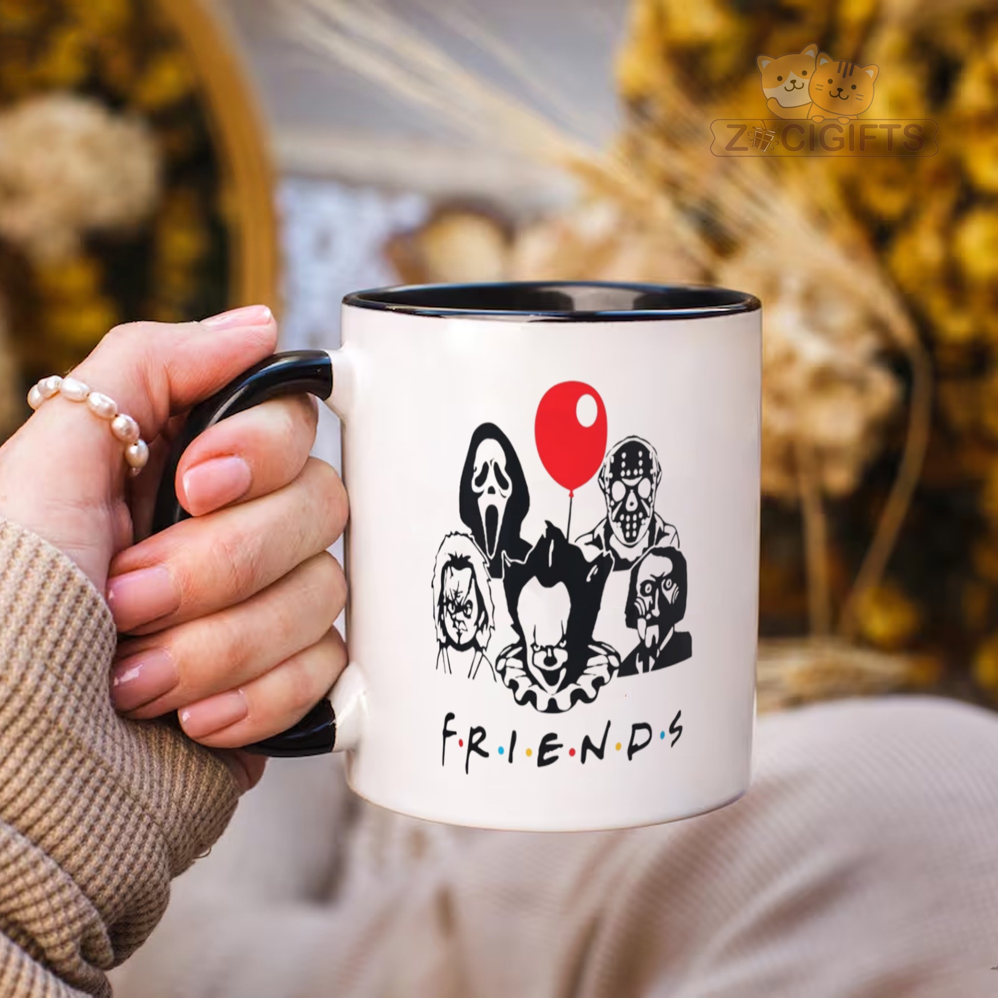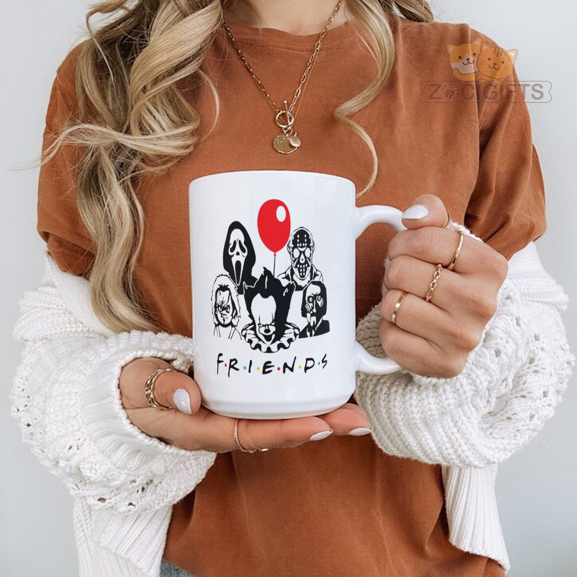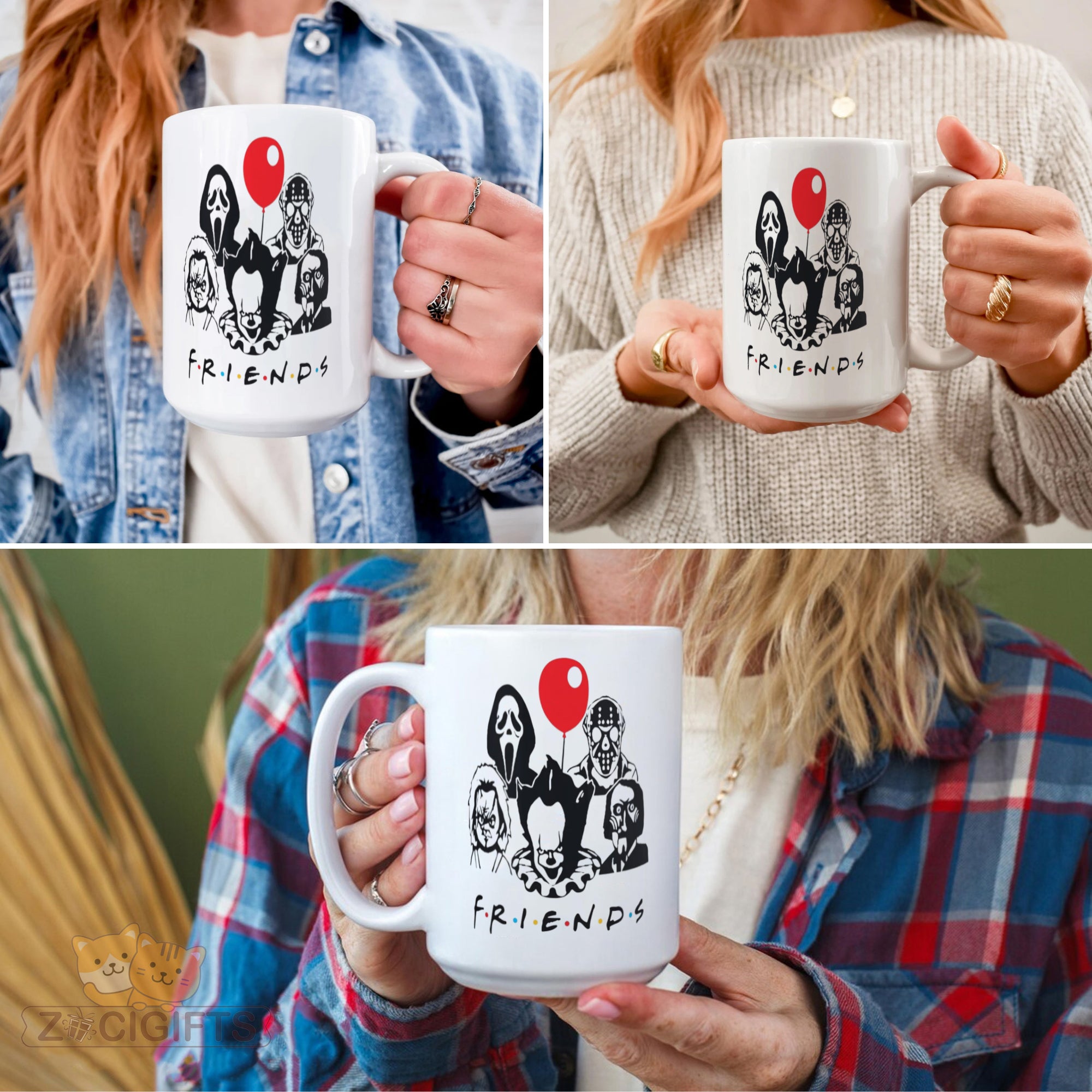 Introducing our unique Scary Friends Mug, a must - have for all horror movie enthusiasts! This isn't just any ordinary mug; it features an eye - catching design of iconic horror movie characters grouped together, with the word "FRIENDS" playfully displayed below. The black and white illustrations of these terrifying yet beloved characters are sure to add a touch of spookiness and fun to your daily routine. Crafted from high - quality, durable ceramic, this mug is built to last. Whether you're sipping on your morning coffee, enjoying an afternoon tea, or having a late - night hot chocolate, this mug will keep your beverage warm and your spirits high. It makes for a great conversation starter at home, in the office, or when hosting horror - themed parties. Surprise your friends and family with this one - of - a - kind gift that perfectly combines their love for horror movies and functional drinkware. Don't miss out on adding this special Scary Friends Mug to your collection today!