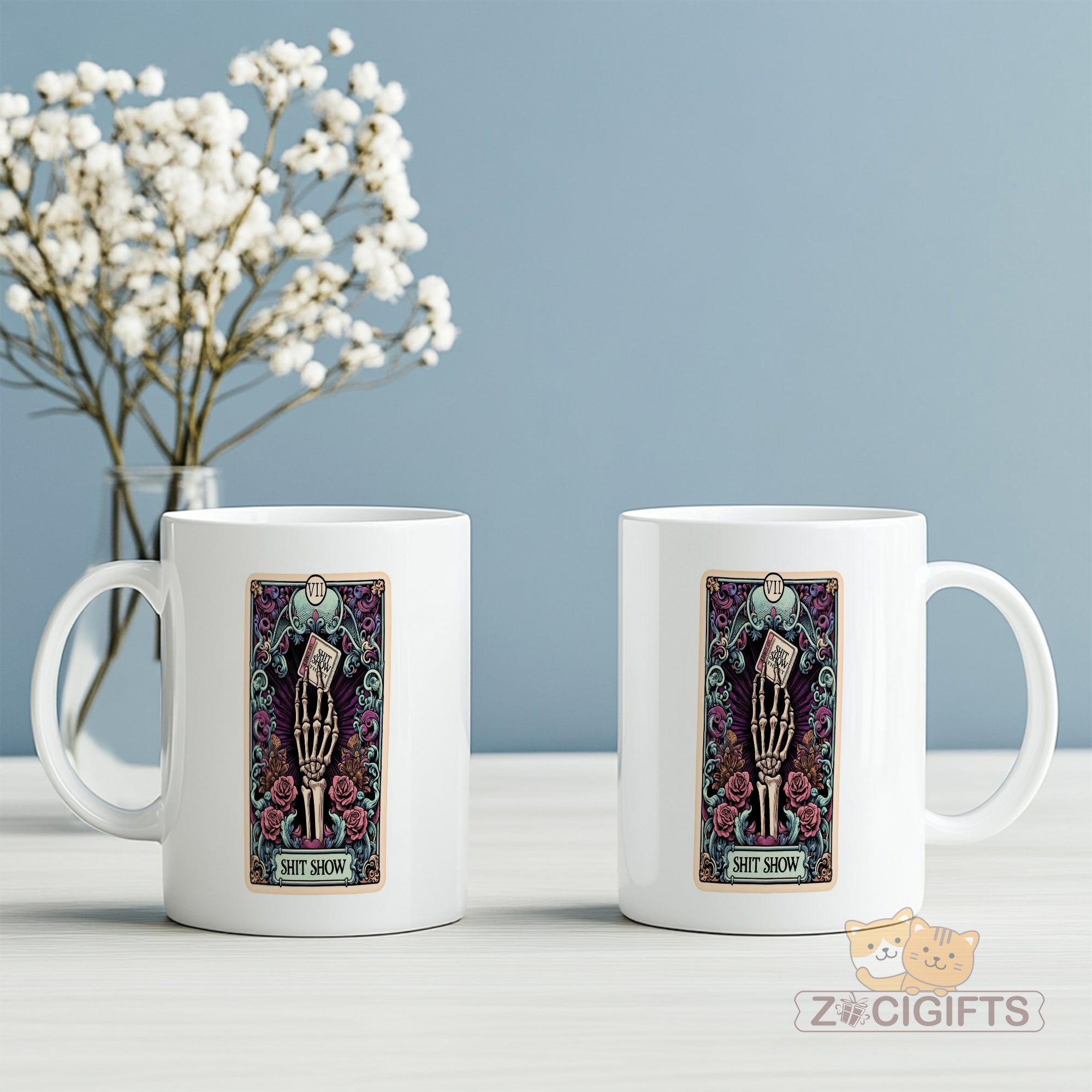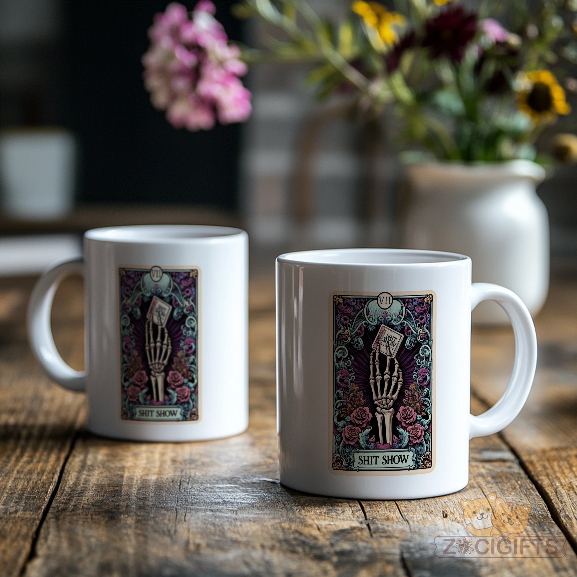 The art blends gothic aesthetics (dark florals, vintage tarot card framing) with unapologetic sarcasm, making it ideal for tarot enthusiasts, dark humor lovers, or anyone who’s had a “this is a shit show” kind of day. Sip your coffee/tea and laugh at the chaos — because sometimes, that’s the only option.