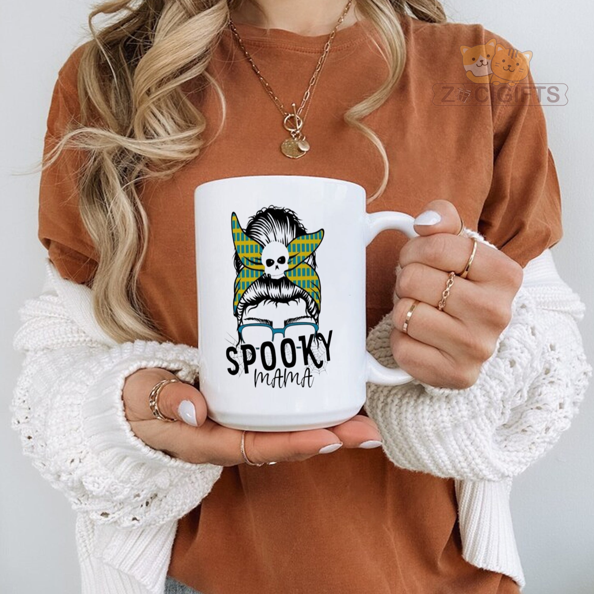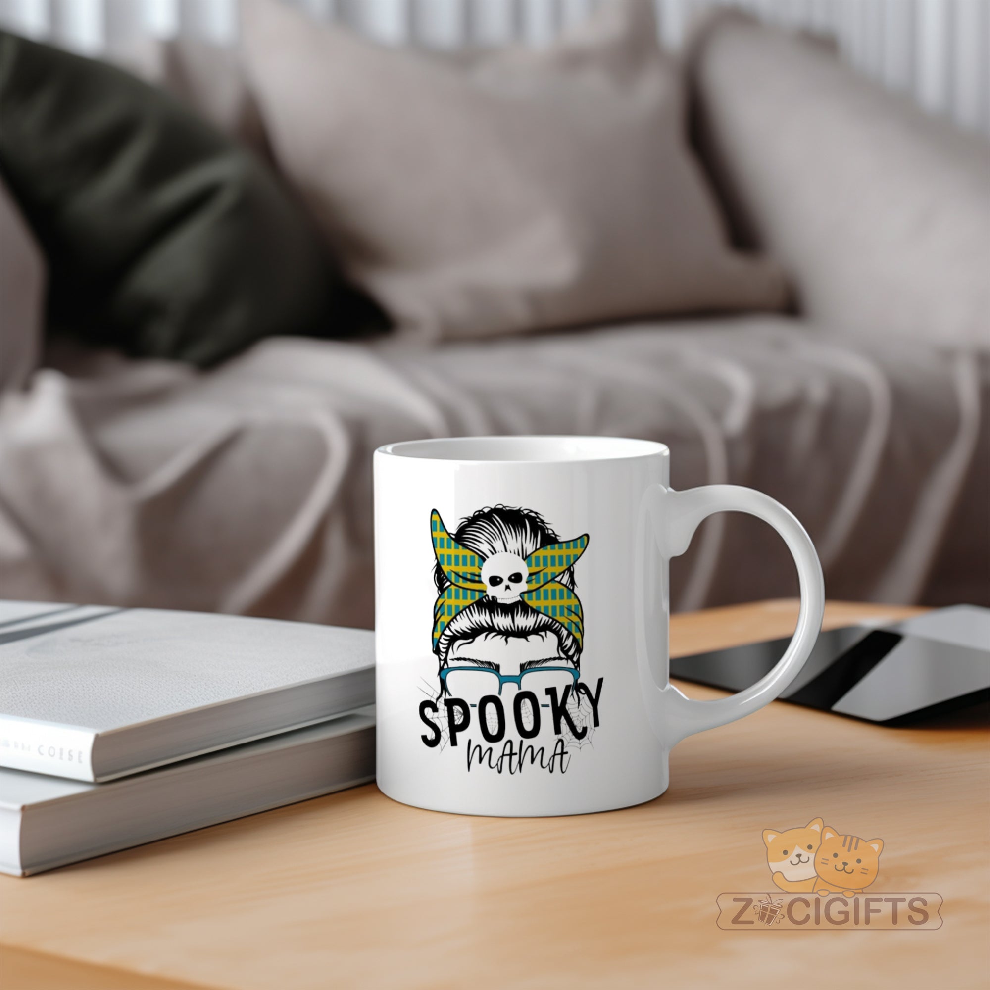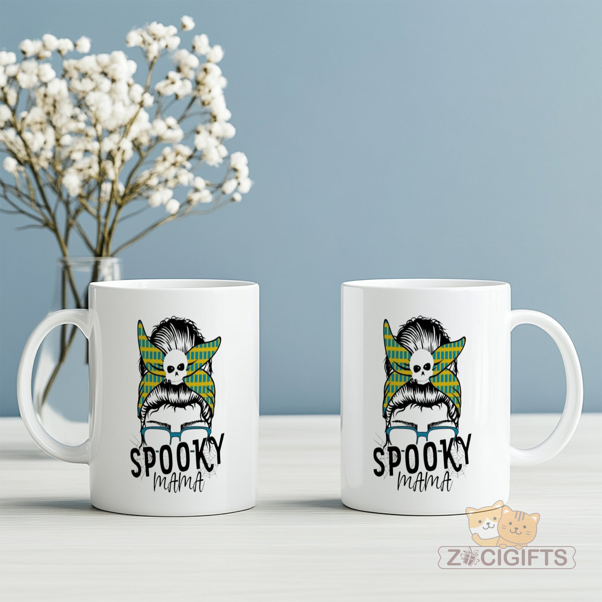Elevate your Halloween vibe or surprise a horror - loving mom with our "Spooky Mama" mug! This isn't just any coffee cup; it's a statement piece featuring a bold skull with a messy bun design in trendy plaid patterns. Whether you're sipping your morning coffee, enjoying an evening tea, or hosting a spooky Halloween party, this mug adds the perfect touch of spooky fun to your day.