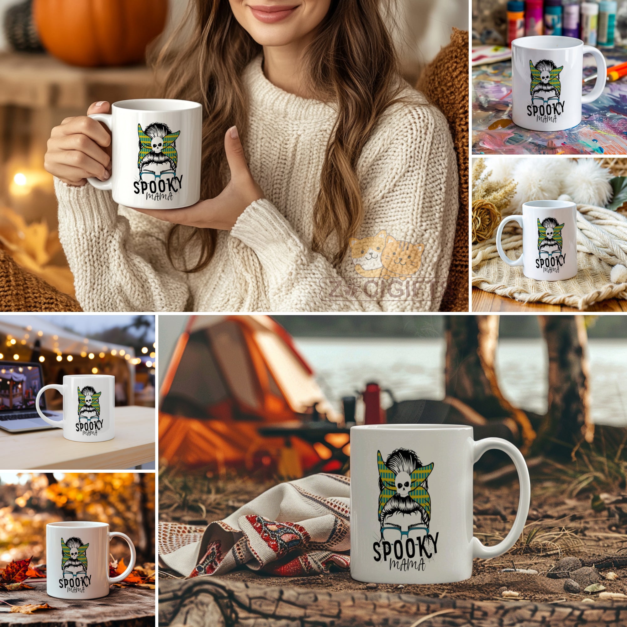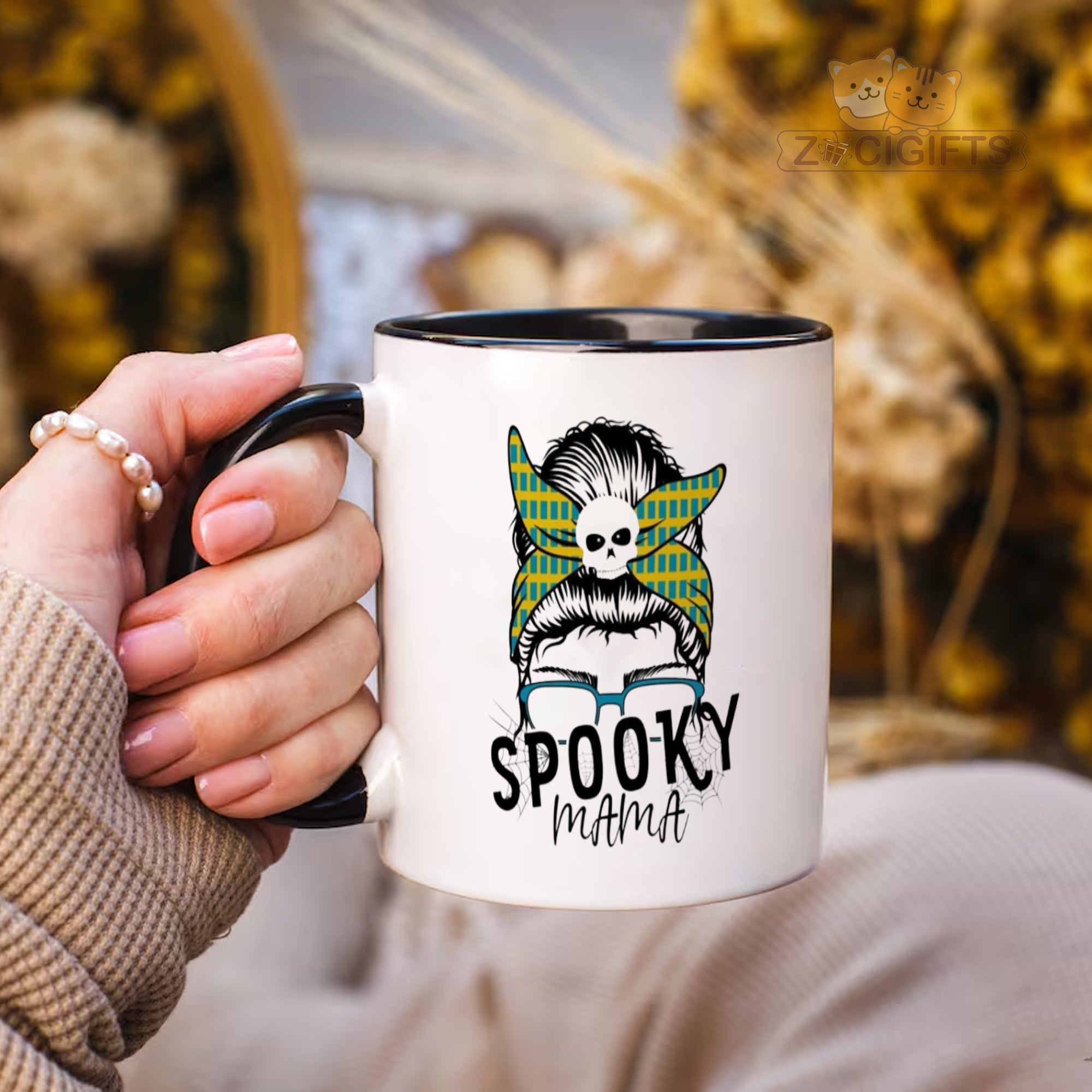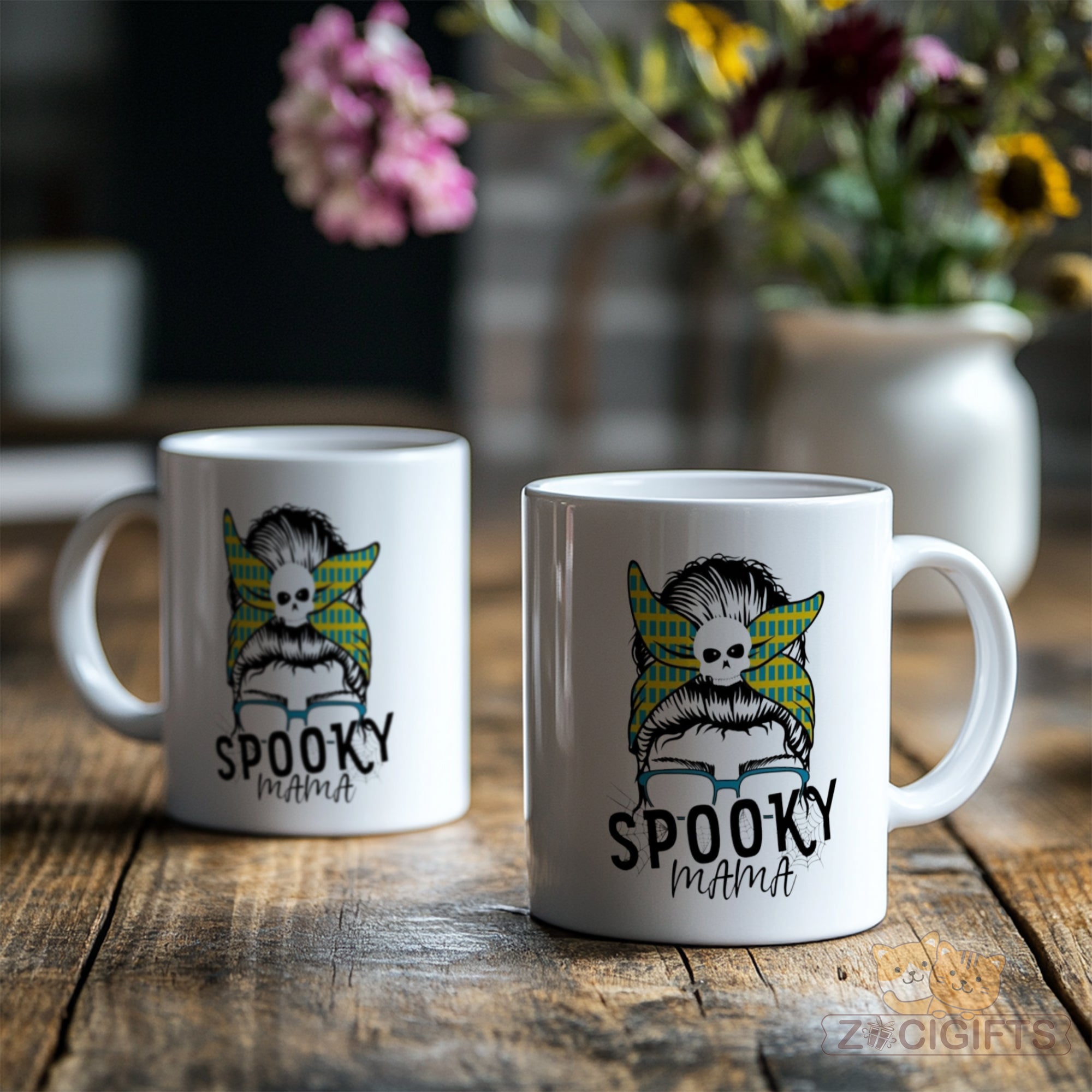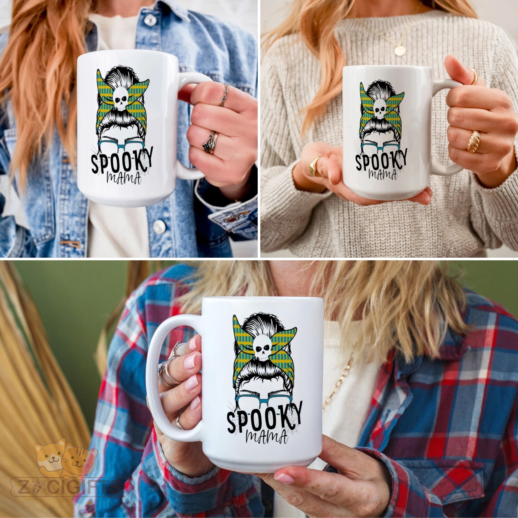 Elevate your Halloween vibe or surprise a horror - loving mom with our "Spooky Mama" mug! This isn't just any coffee cup; it's a statement piece featuring a bold skull with a messy bun design in trendy plaid patterns. Whether you're sipping your morning coffee, enjoying an evening tea, or hosting a spooky Halloween party, this mug adds the perfect touch of spooky fun to your day.