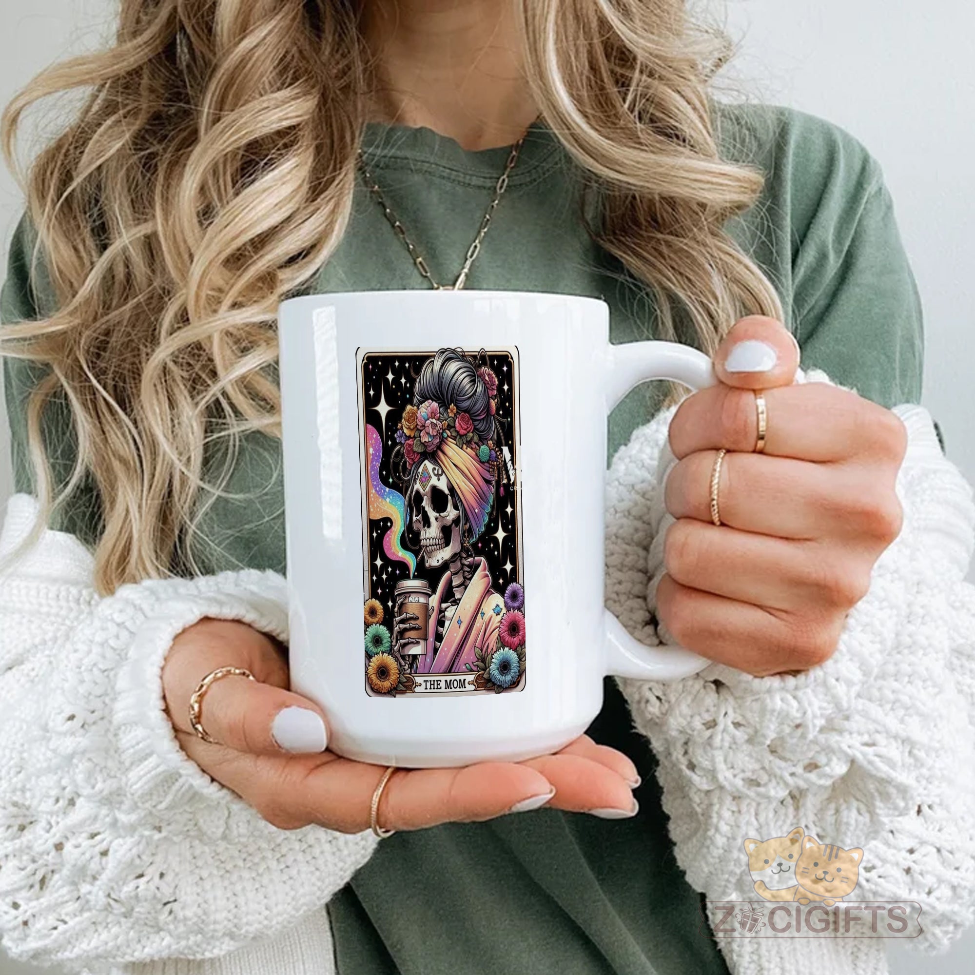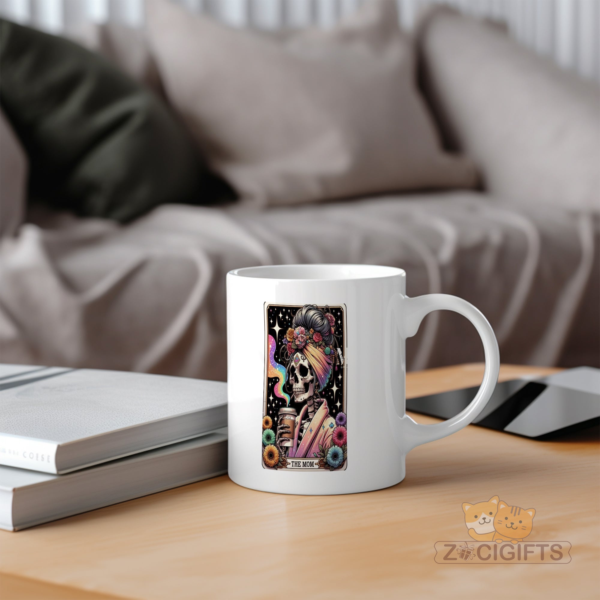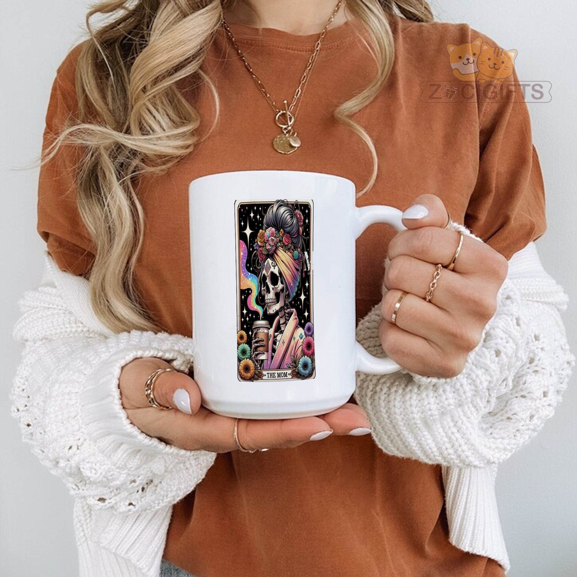 The intricate design merges tarot-inspired aesthetics (vintage card framing, celestial stars) with floral details and coffee-themed symbolism, making it perfect for moms who love gothic style or appreciate whimsical, edgy decor. Whether you’re sipping coffee during a busy mom morning or unwinding after a long day, this mug honors your vital role with artistic flair.