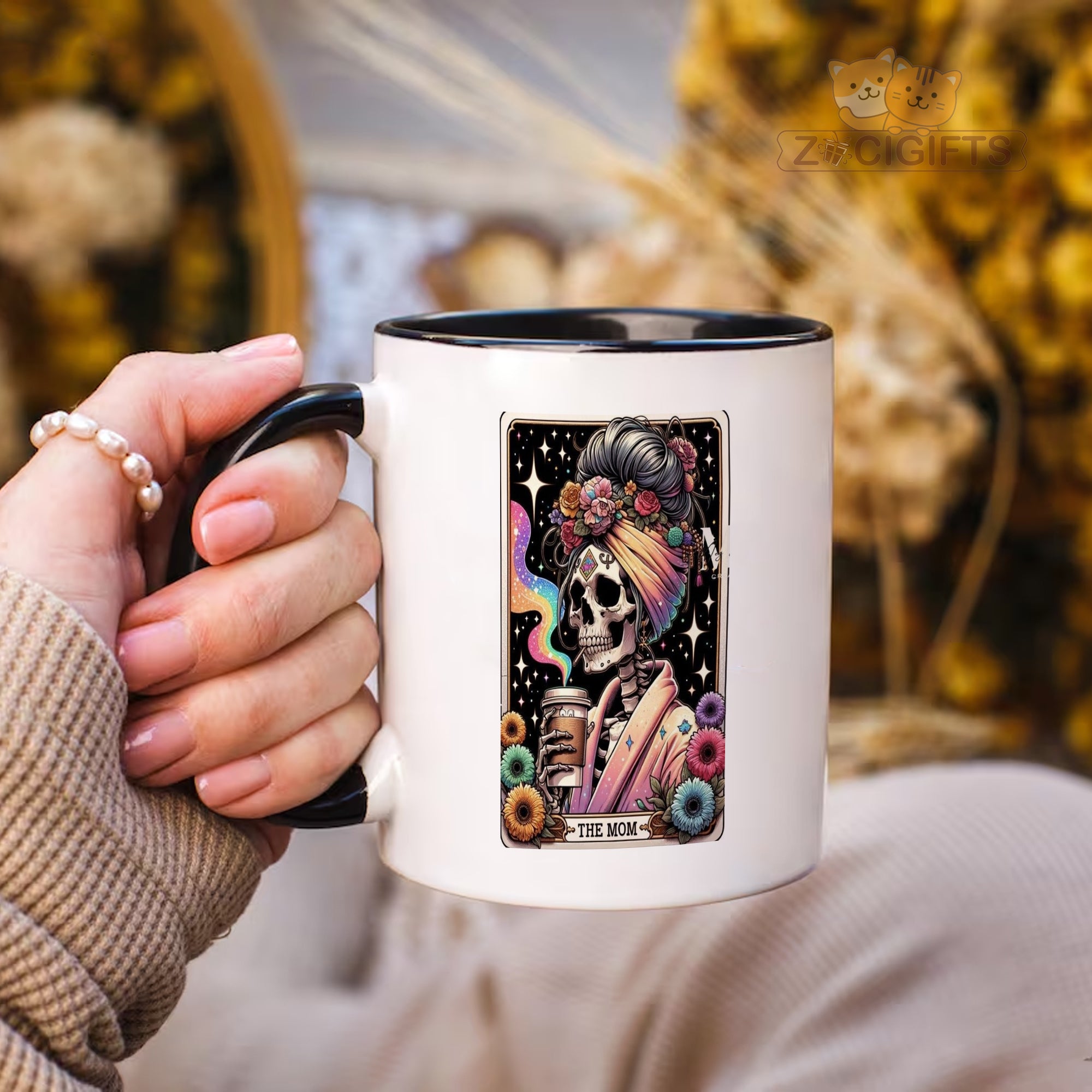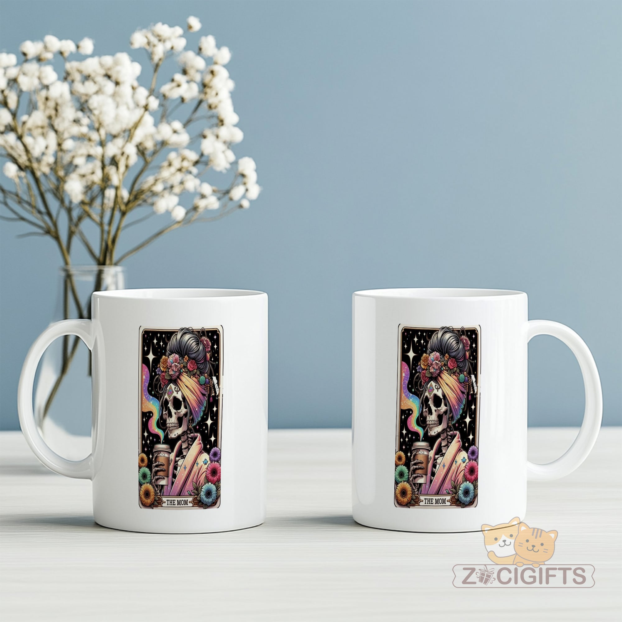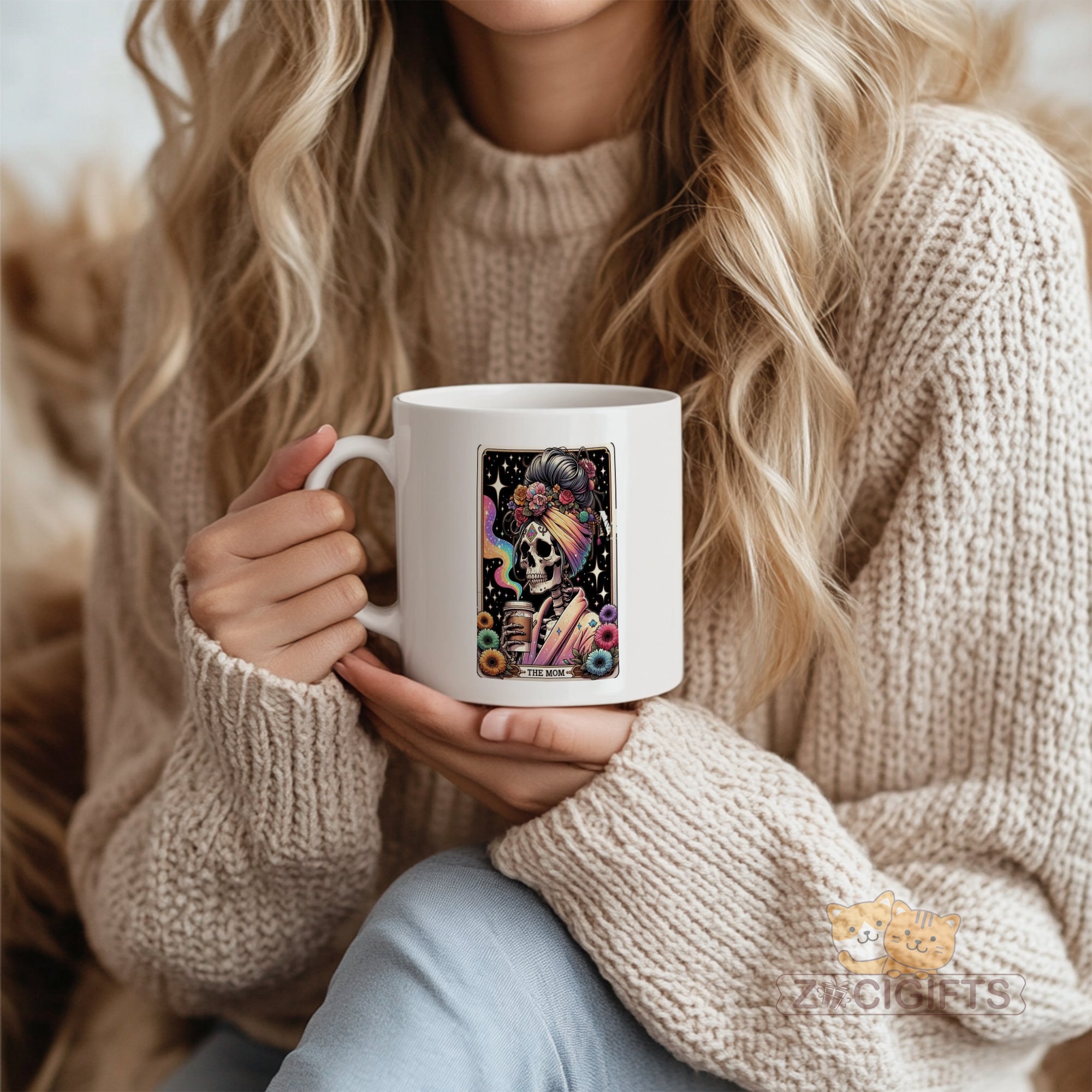 The intricate design merges tarot-inspired aesthetics (vintage card framing, celestial stars) with floral details and coffee-themed symbolism, making it perfect for moms who love gothic style or appreciate whimsical, edgy decor. Whether you’re sipping coffee during a busy mom morning or unwinding after a long day, this mug honors your vital role with artistic flair.