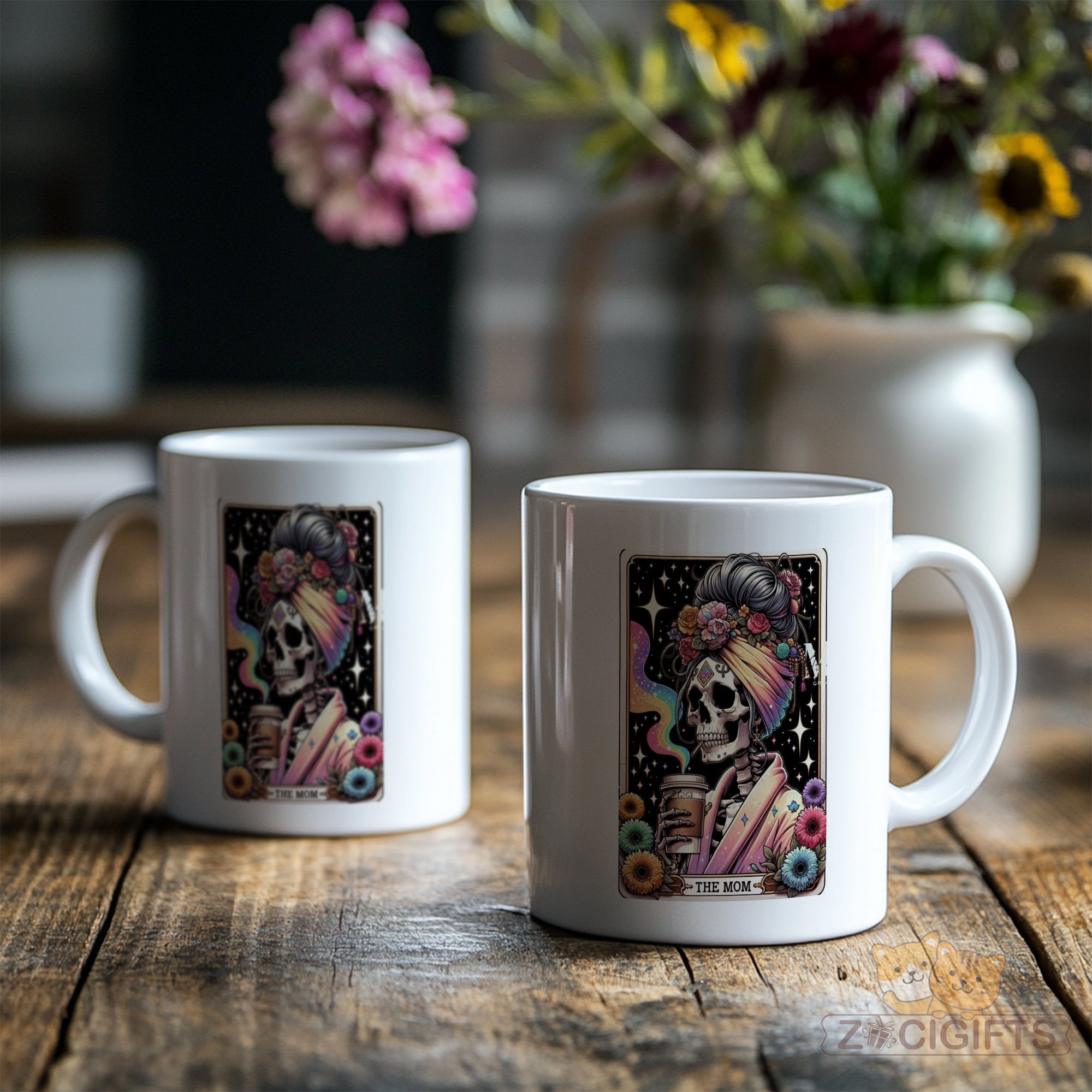 Motherhood is a journey full of magic (and chaos) — and this mug celebrates moms with a gothic tarot card twist. Featuring a skeleton mom adorned with vibrant florals, sipping coffee, and the bold text “THE MOM,” it’s a unique blend of mystical art and mom pride.