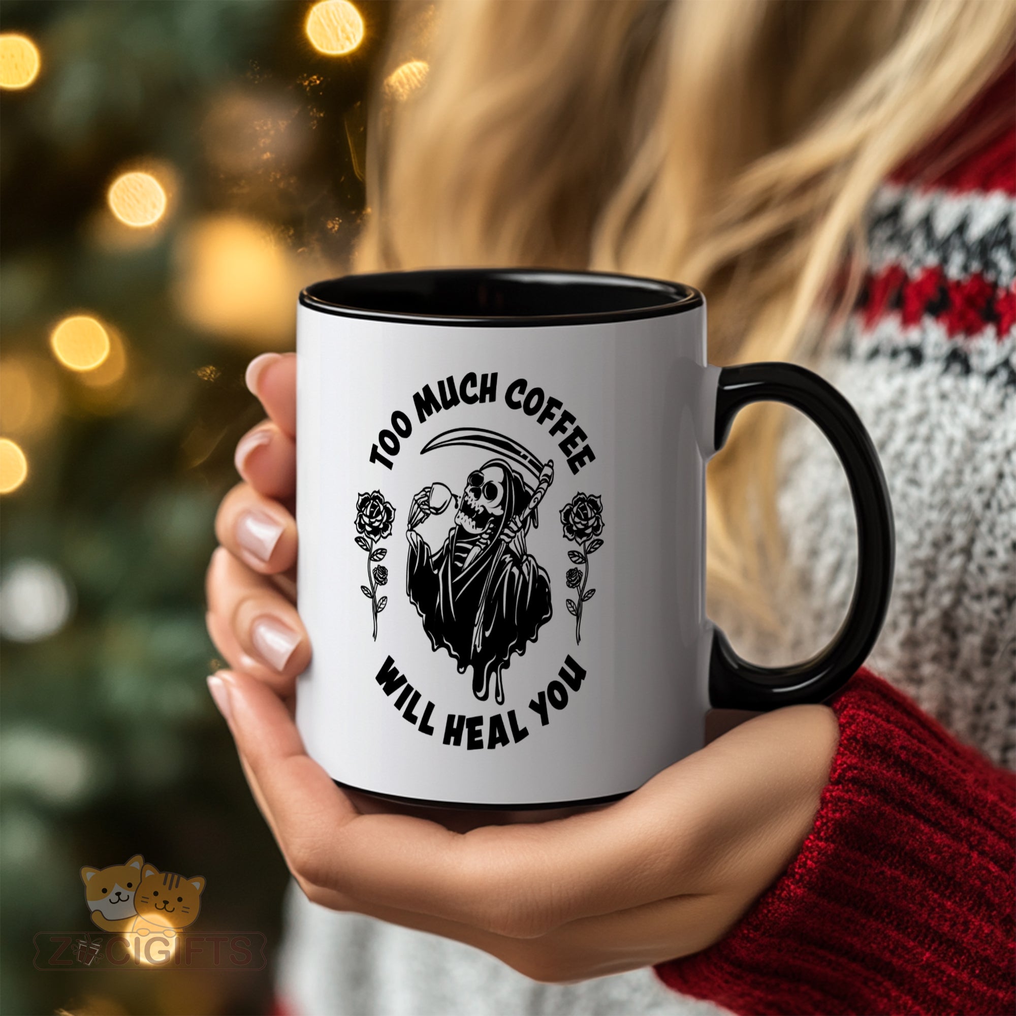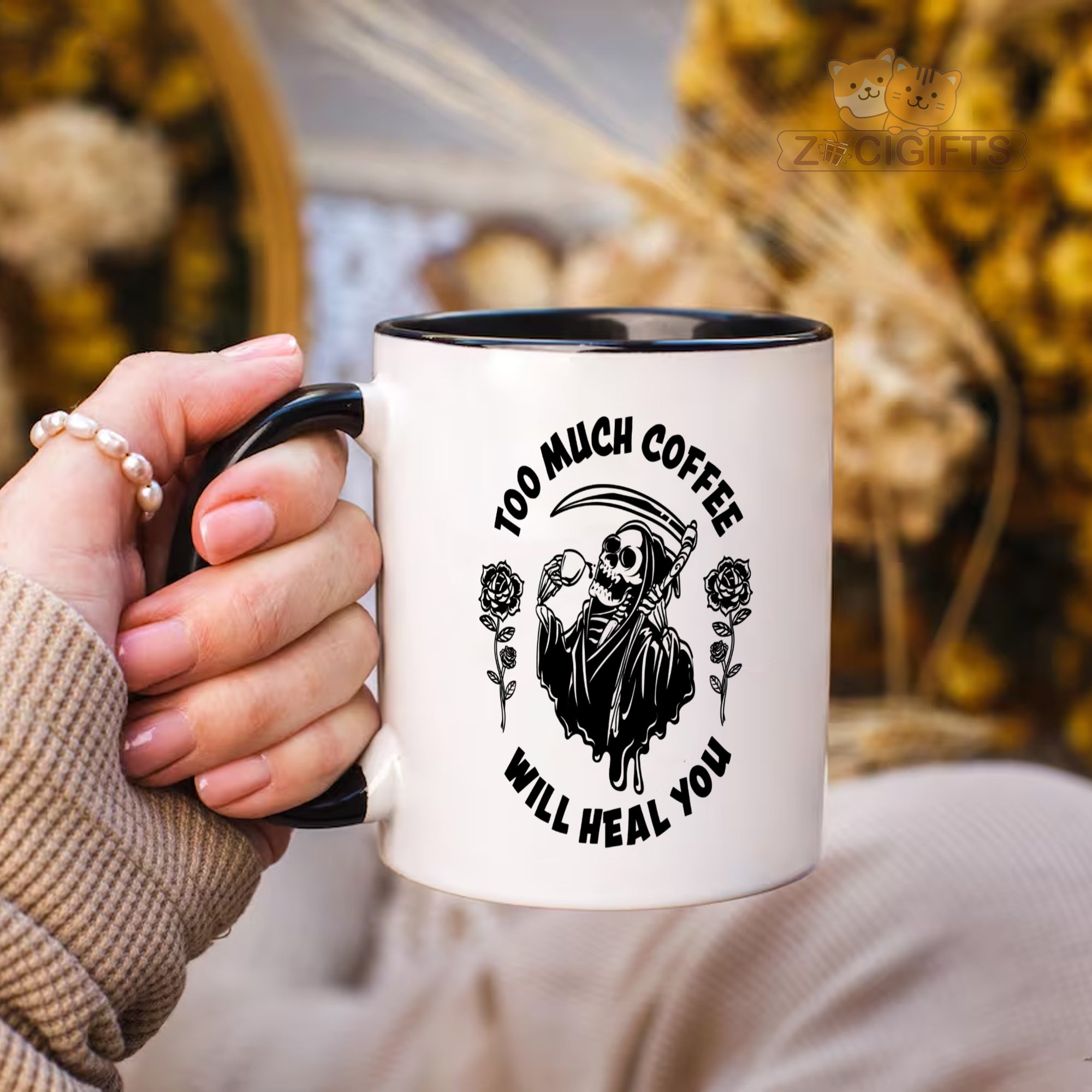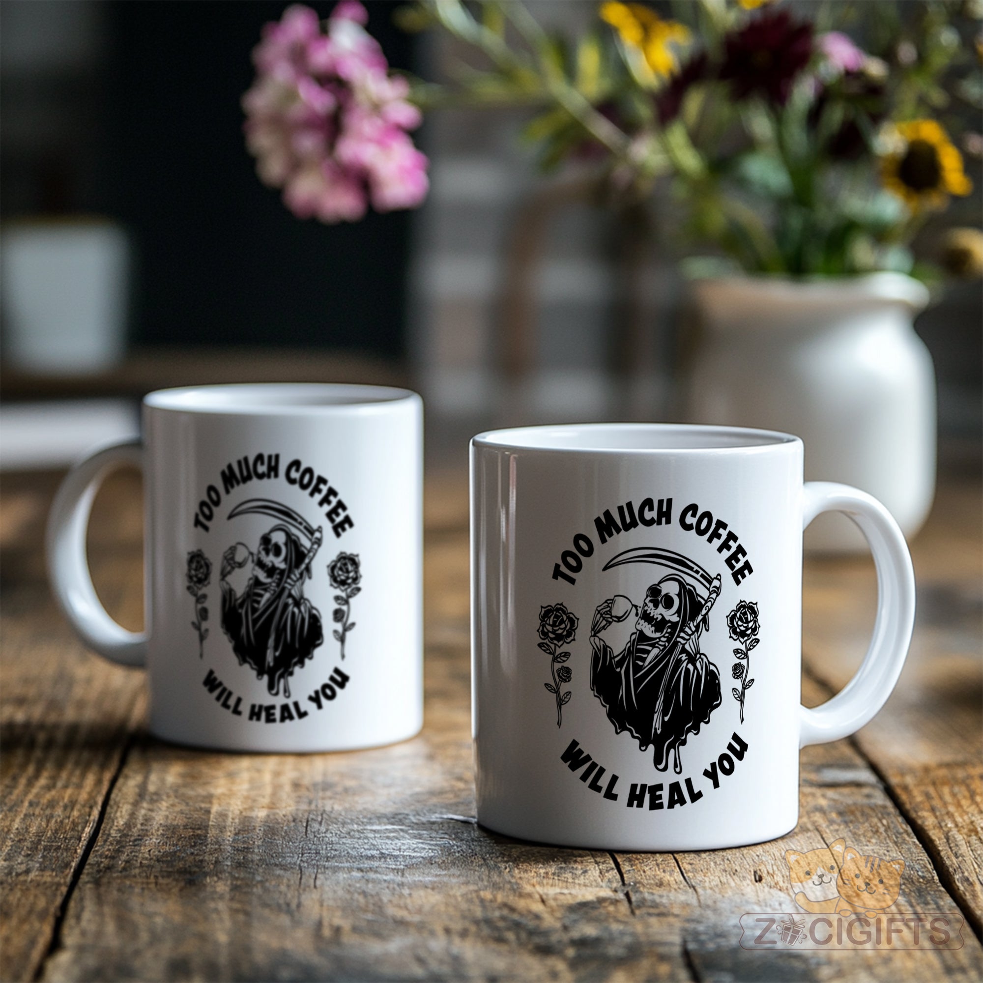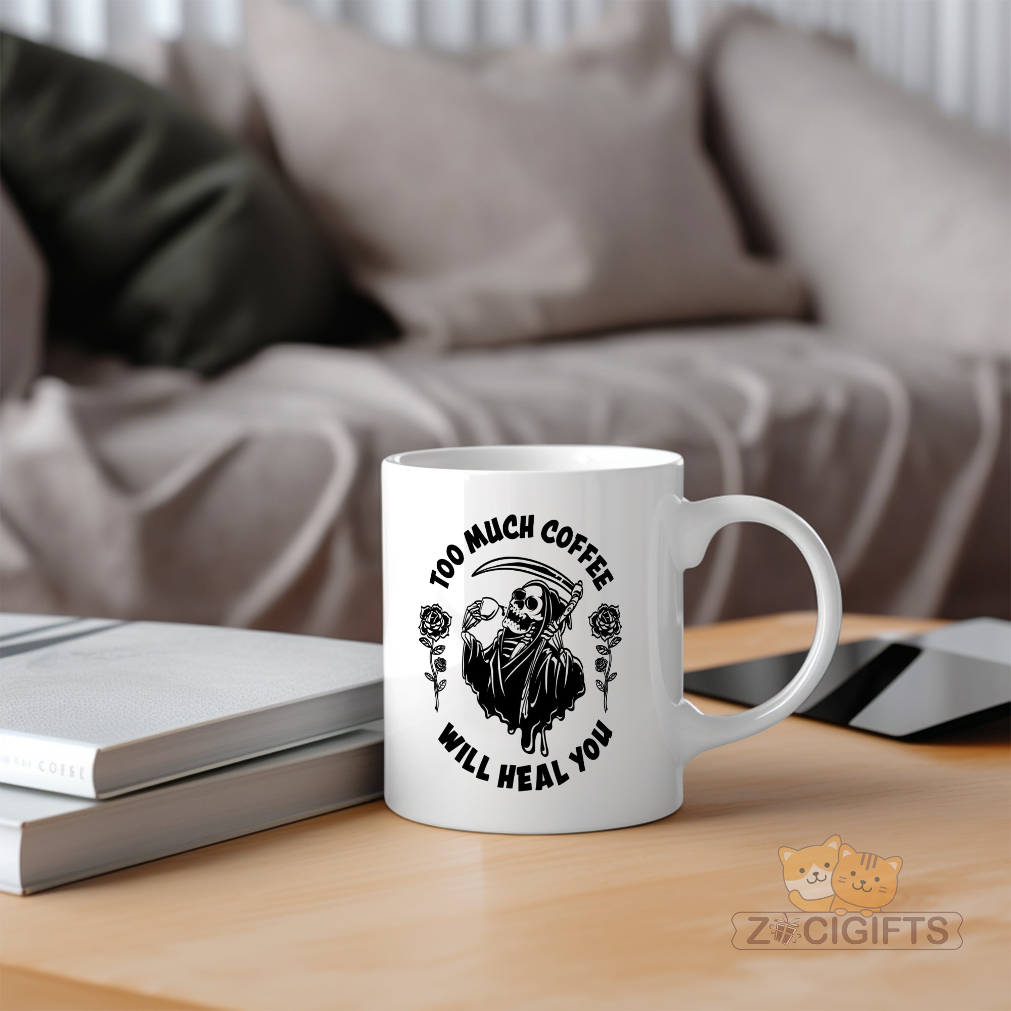 Elevate your coffee routine with this hilarious and unique "Too Much Coffee Will Heal You" mug! Featuring a gothic skeleton sipping coffee while surrounded by roses, this novelty ceramic cup is perfect for dark humor enthusiasts, goth lovers, or anyone who needs a daily reminder that coffee is basically life - giving.