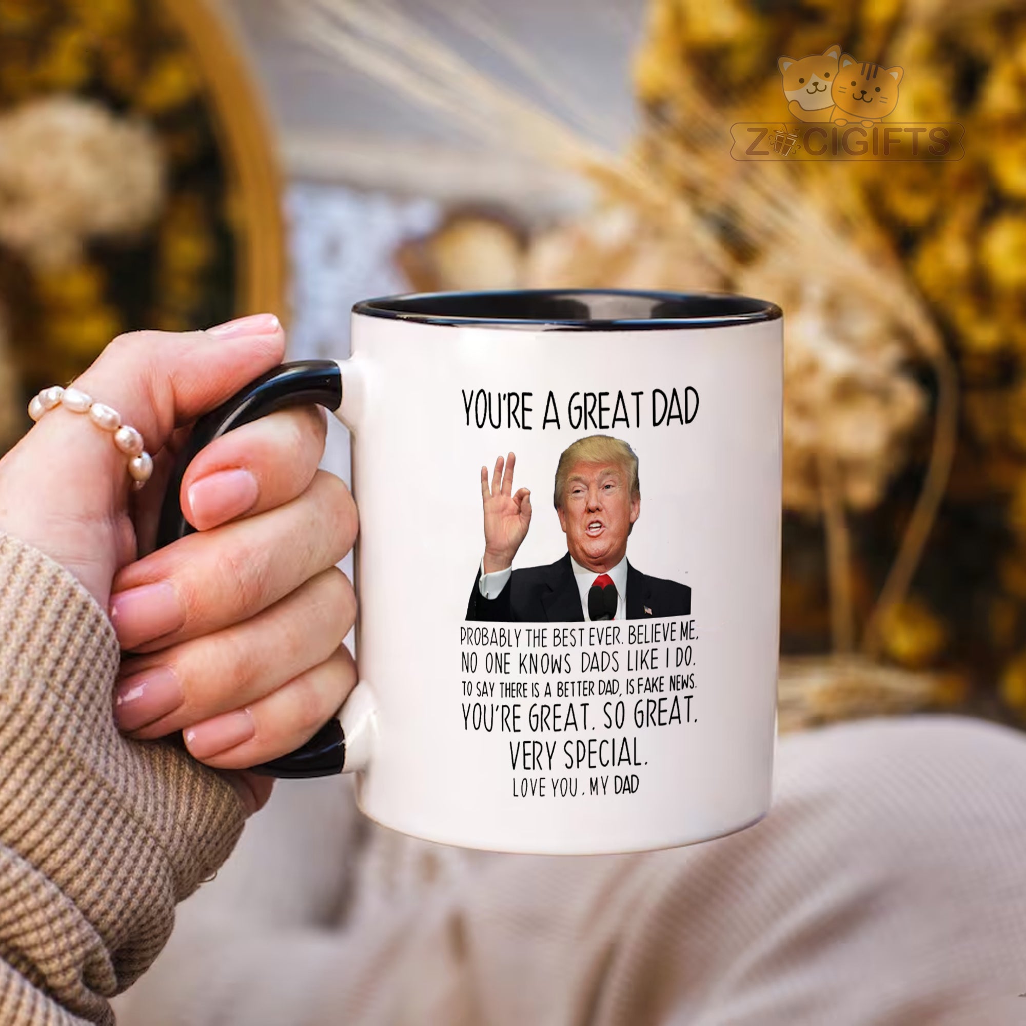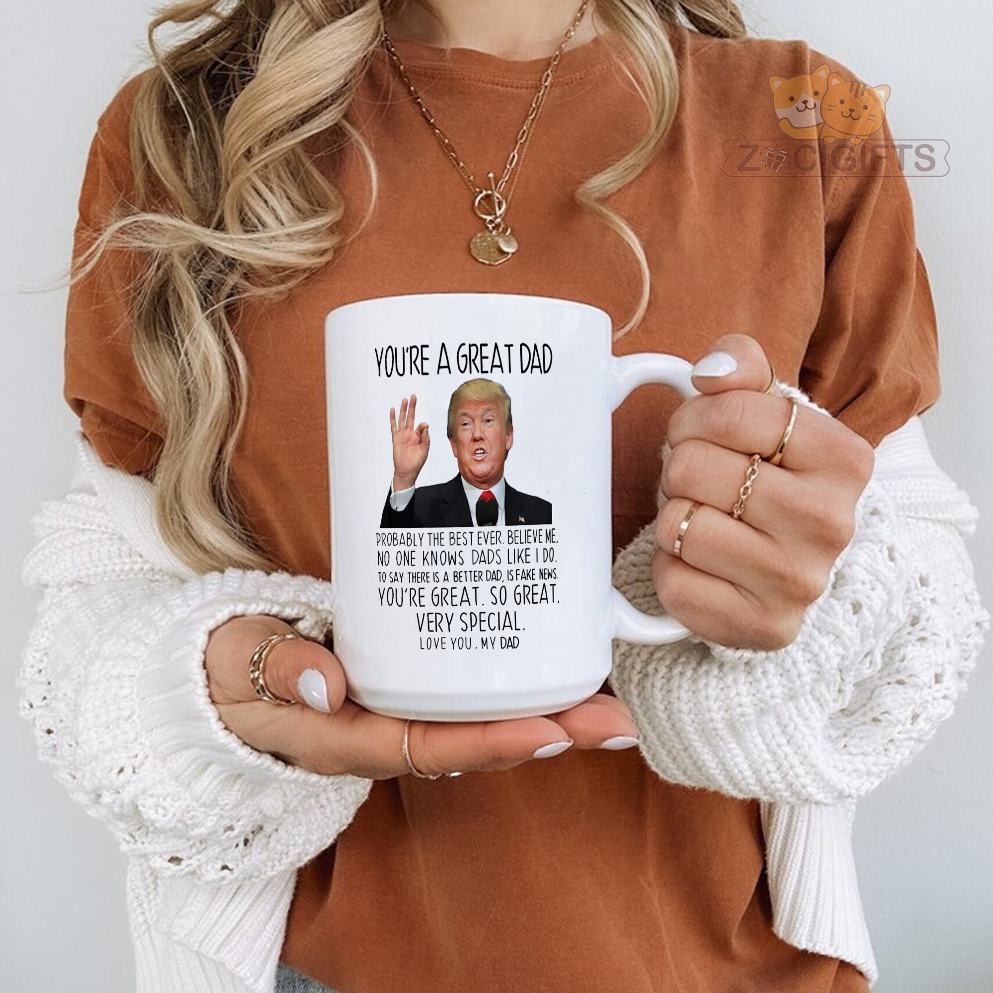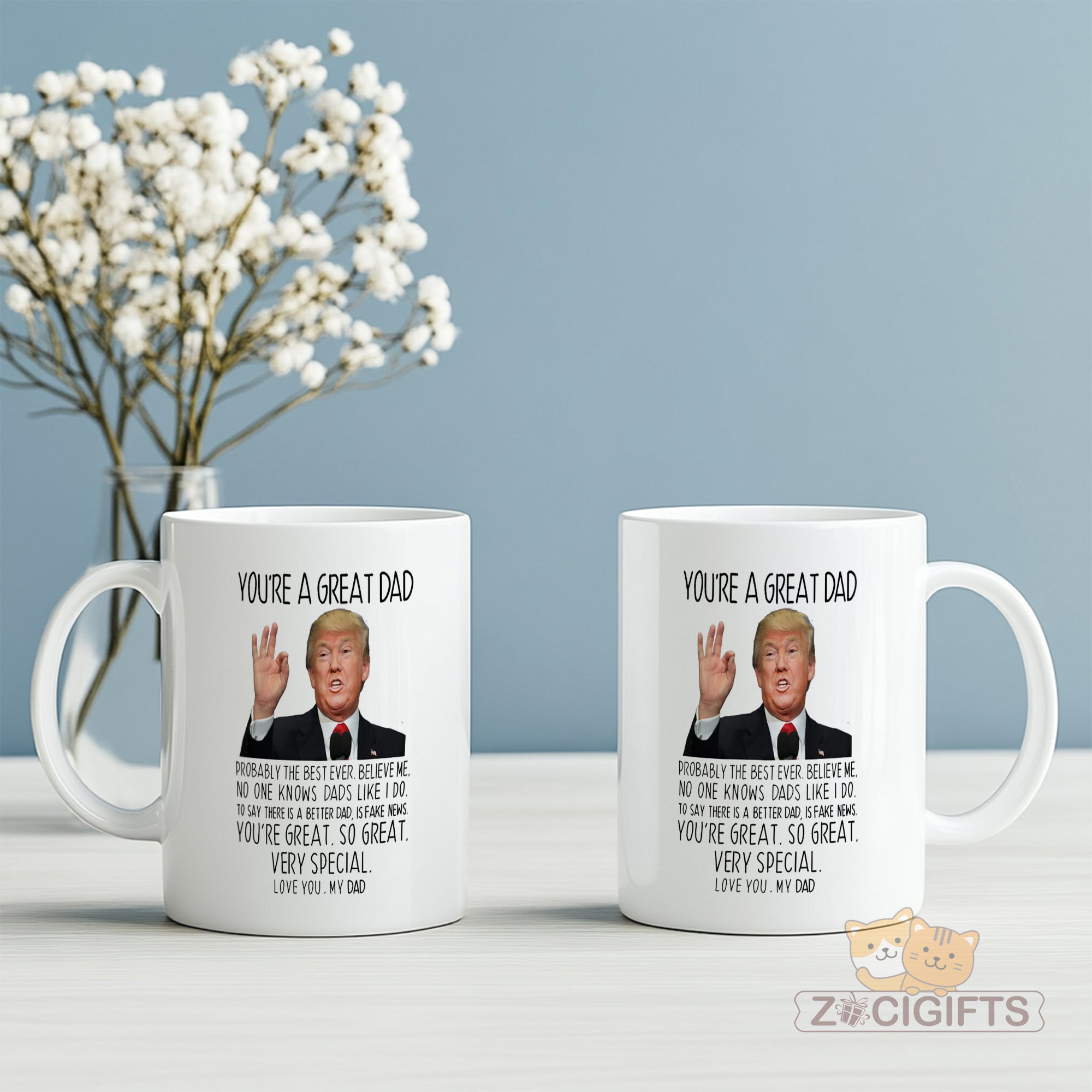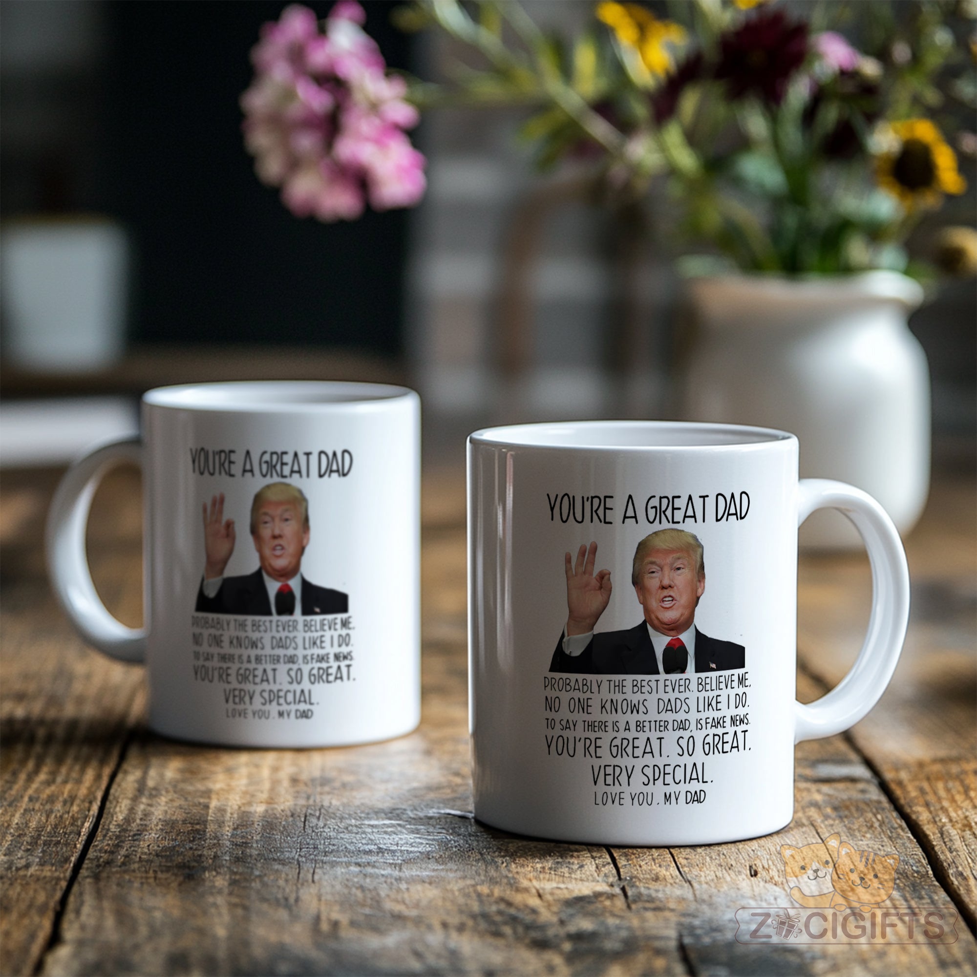 The mug features the iconic image of Donald Trump along with a hilarious quote that reads, "You're a great dad, probably the best ever. Believe me. No one knows dads like I do. To say there is a better dad, is fake news. You're great. So great. Very special. Love you. My dad". It's sure to bring a smile to any dad's face and start conversations at the breakfast table or in the office break room.