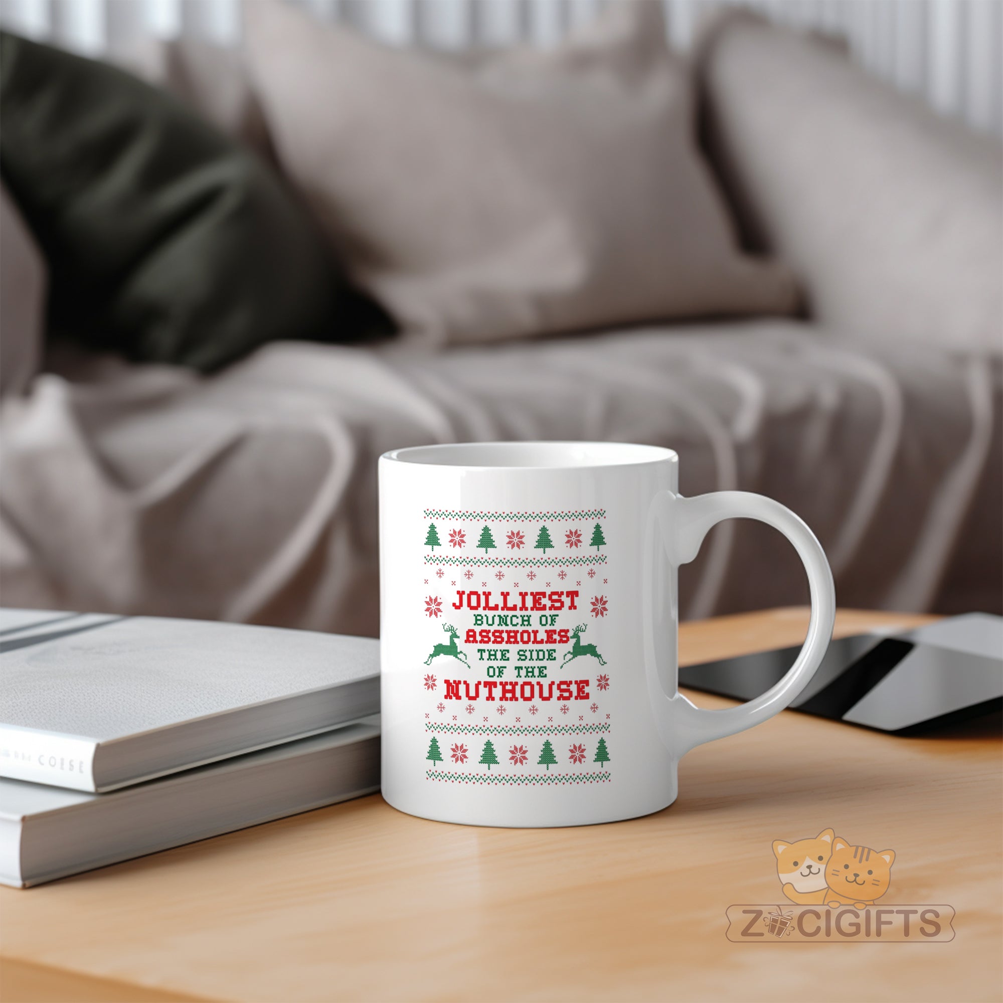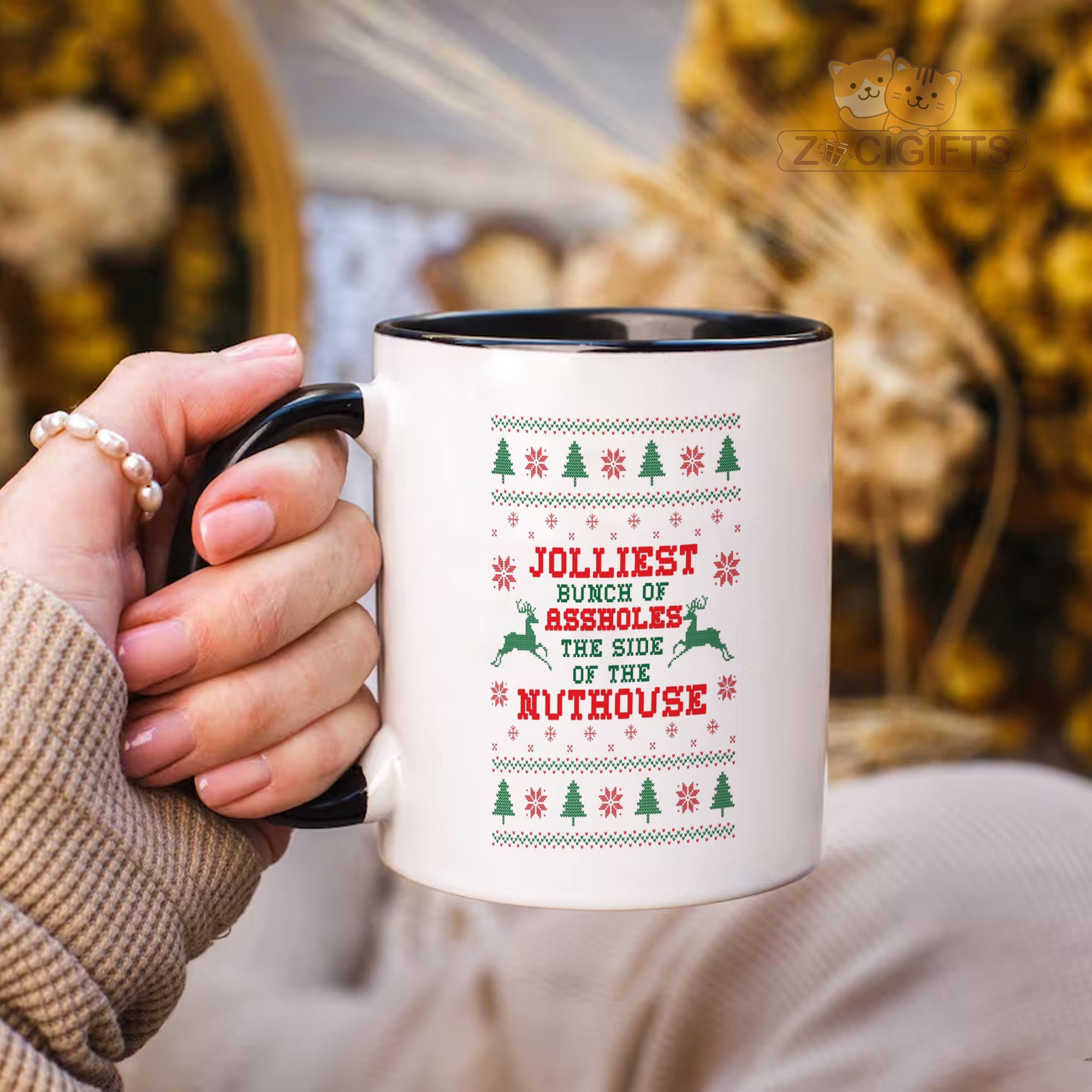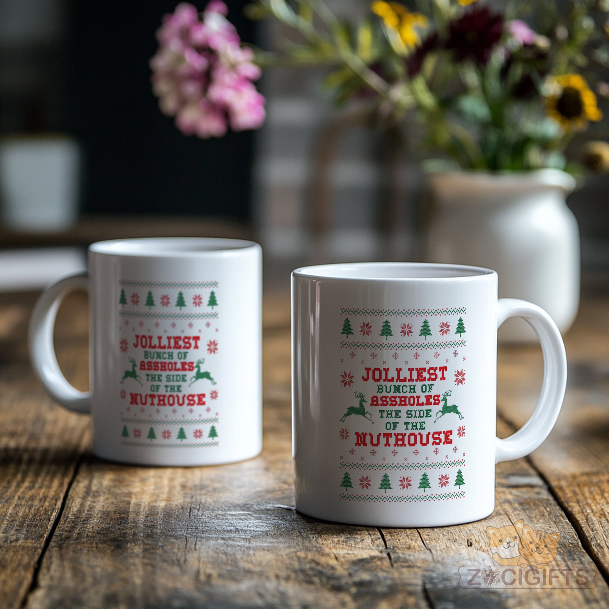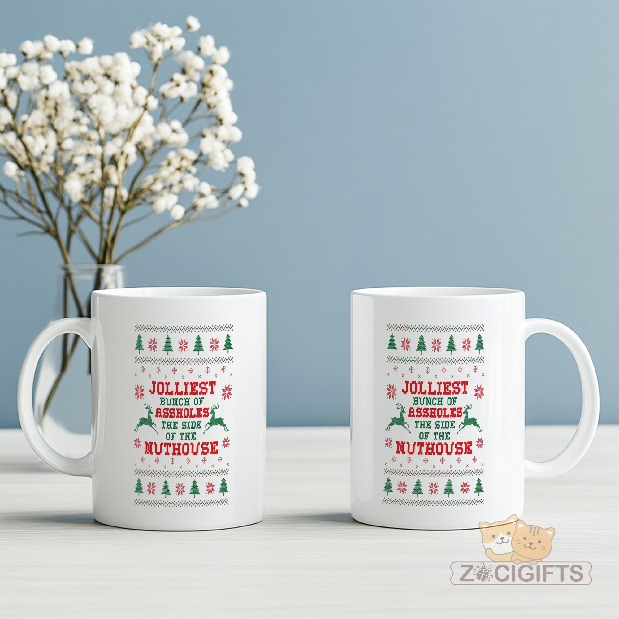 Celebrate the holiday season with humor and style using our Ugly Christmas Sweater Mug! This novelty mug features the cheeky design inspired by classic ugly Christmas sweaters, proudly displaying the phrase "Jolliest Bunch of Assholes on the Side of the Nuthouse" in bold festive colors. Perfect for spreading laughter at Christmas parties, office gatherings, or as a quirky gift for friends, coworkers, and family who love irreverent humor.