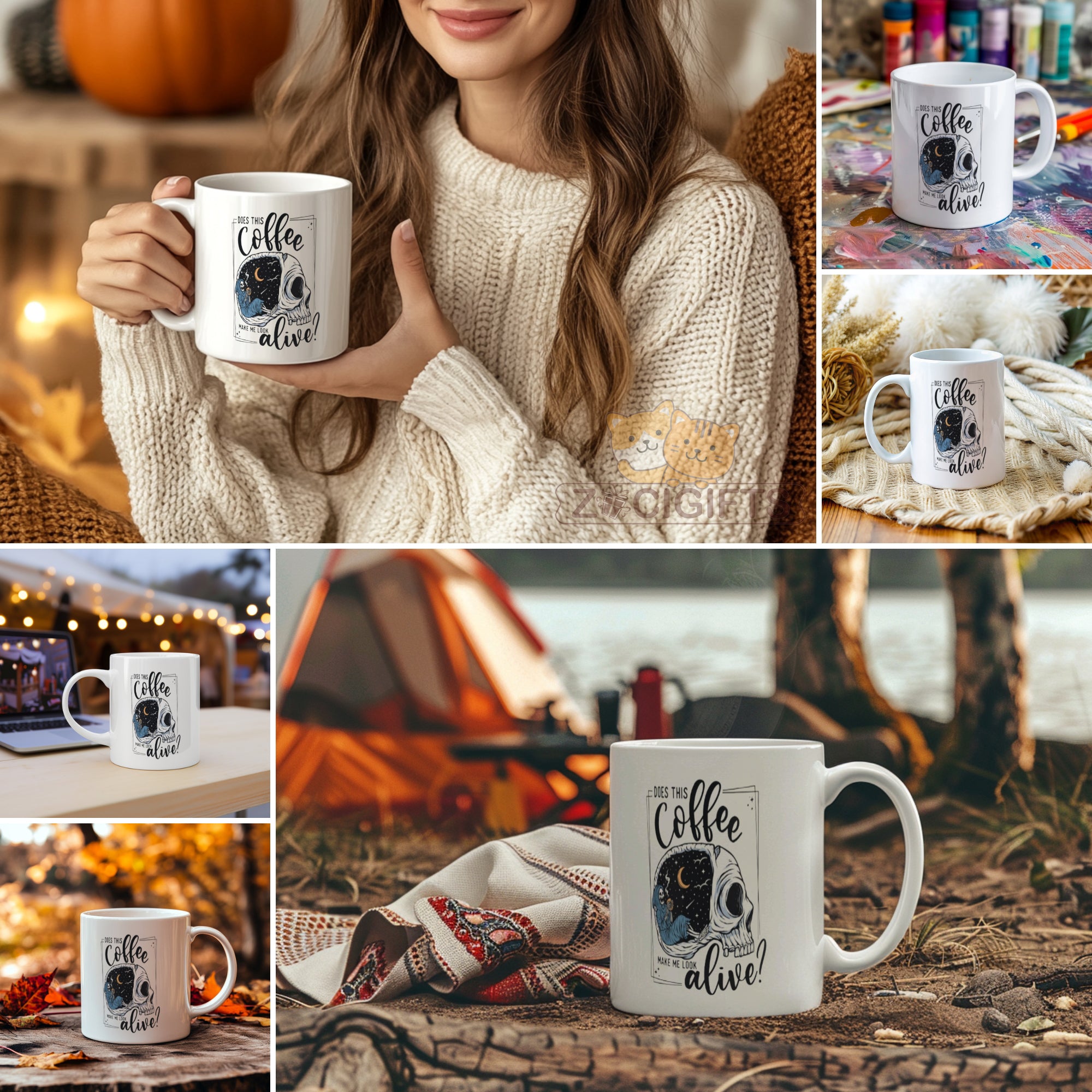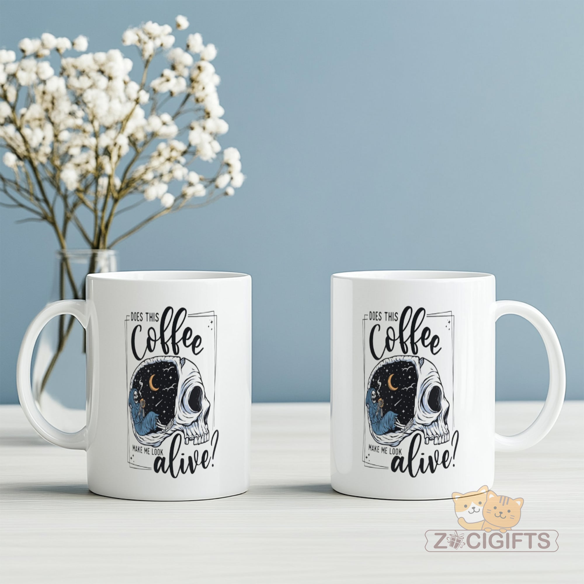 Introducing our one - of - a - kind skull - design coffee mug! This isn't just any ordinary mug; it's a statement piece that combines humor and a touch of the macabre. The bold text "Does This Coffee Make Me Look Alive?" printed on the mug is sure to bring a smile to your face every time you take a sip.