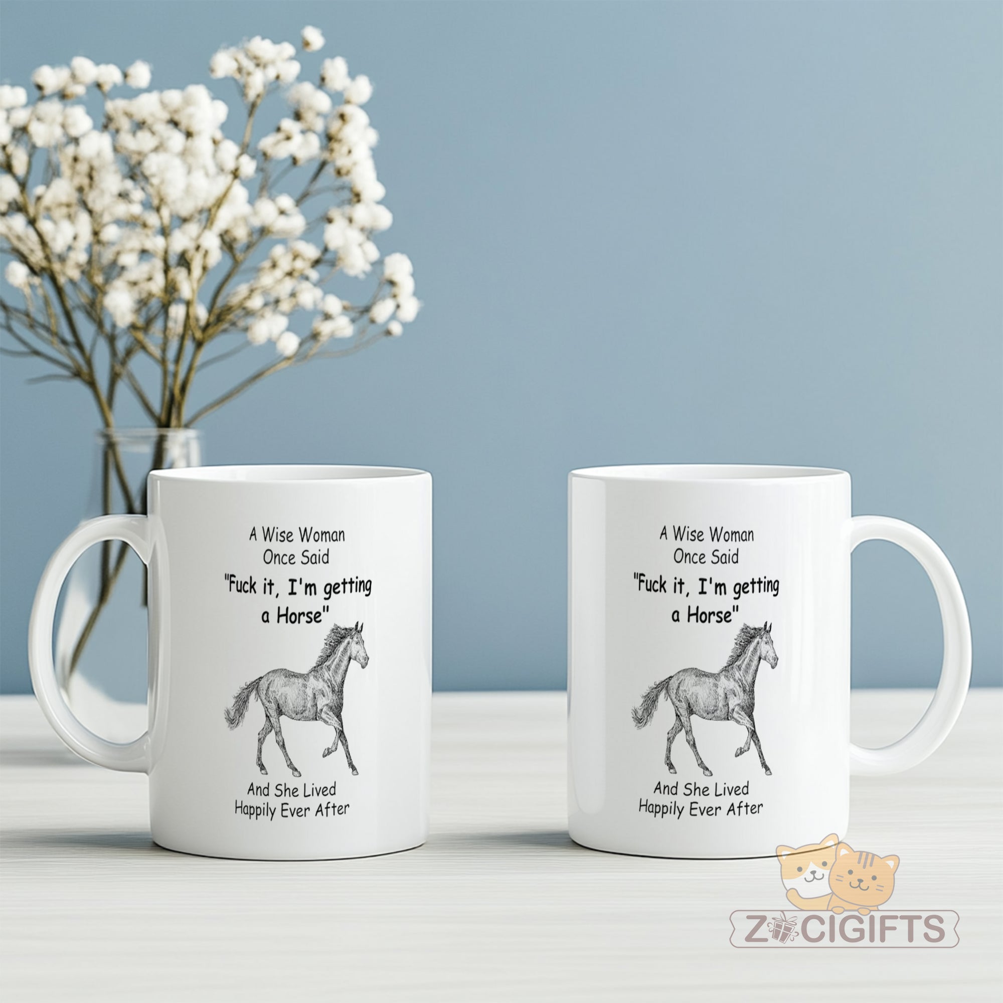 Elevate your daily coffee or tea routine with our unique and humorous horse - themed mug! This white ceramic mug features a bold and sassy slogan that reads "A Wise Woman Once Said 'F**k it, I'm getting a Horse' And She Lived Happily Ever After", accompanied by a detailed illustration of a beautiful horse.