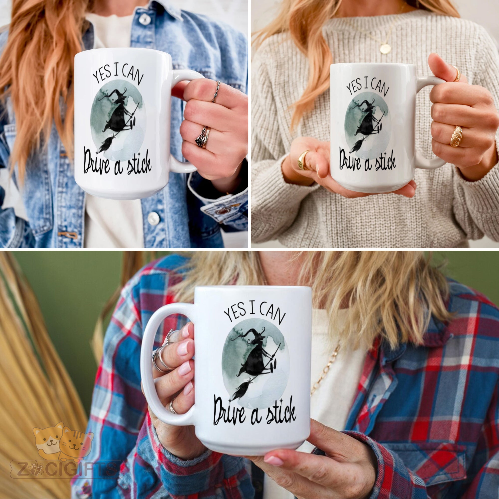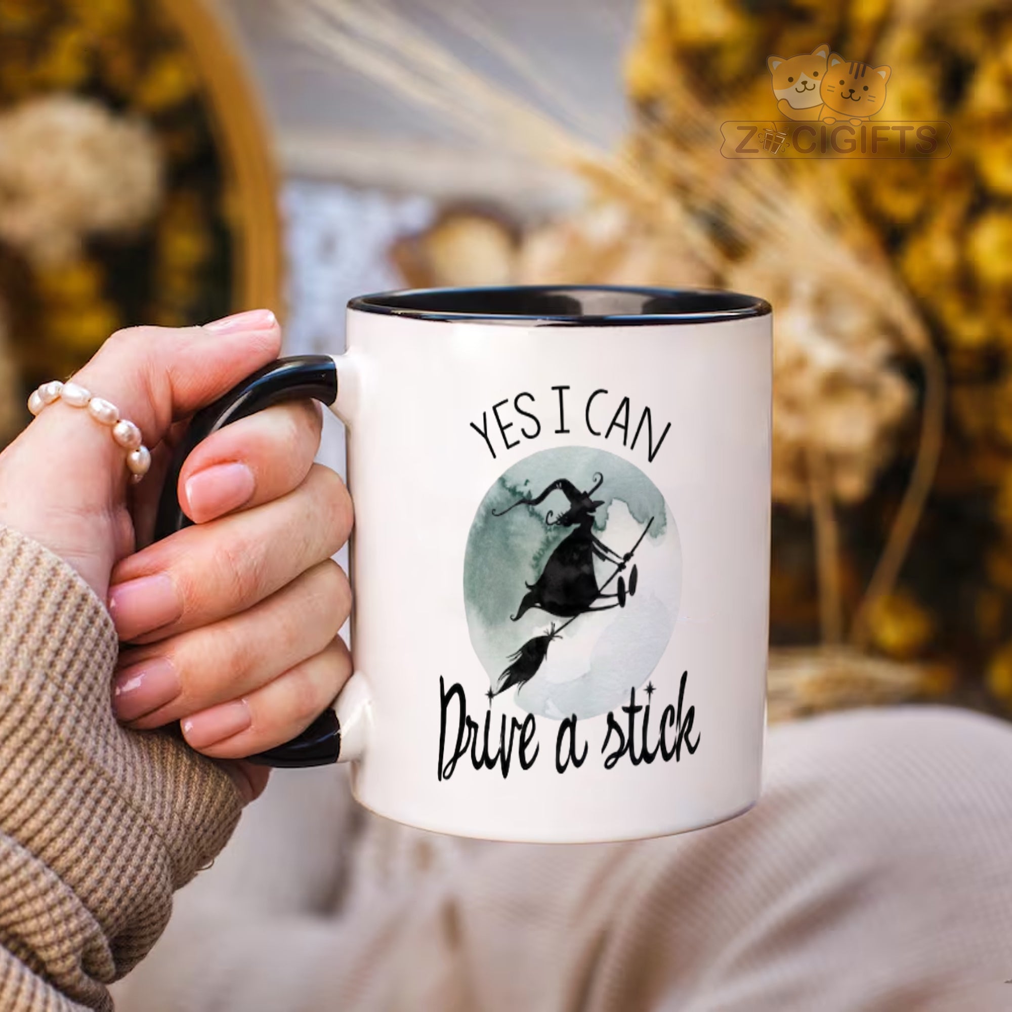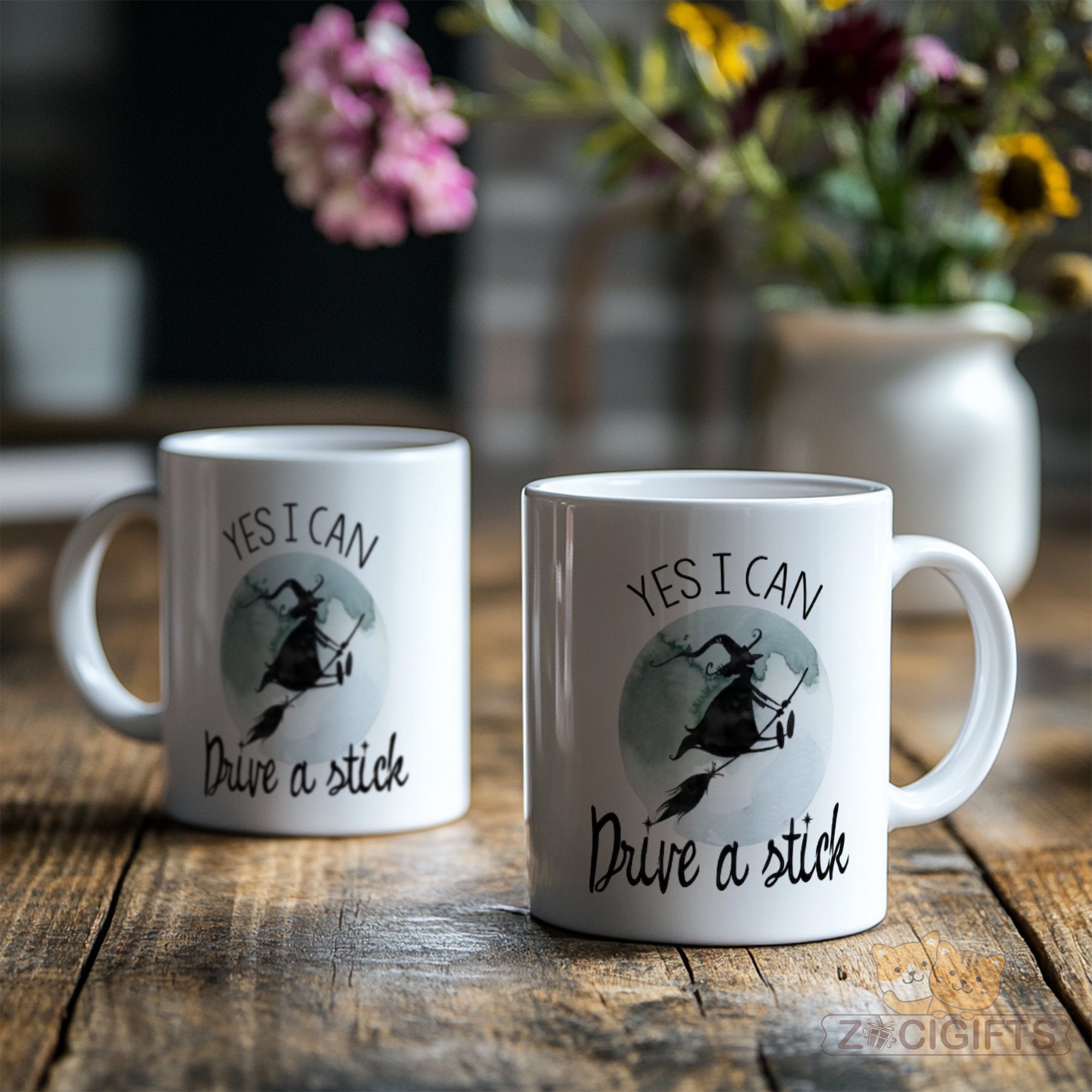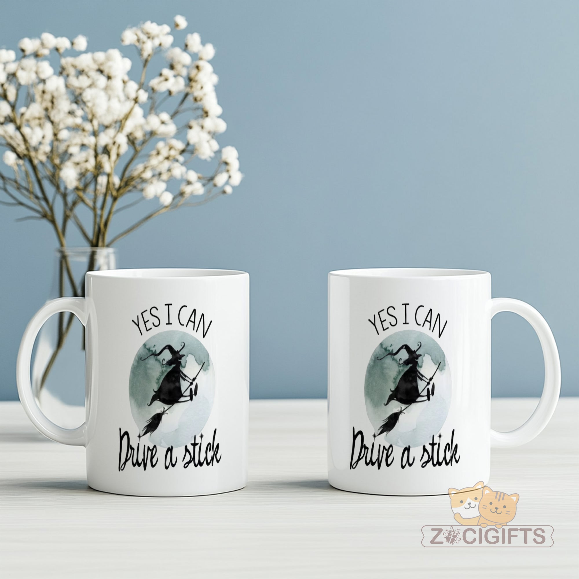 Elevate your beverage - drinking experience with our charming and humorous witch - themed mug! This white ceramic mug features a whimsical design of a witch soaring on a broomstick against a dreamy, moonlit background. Above the enchanting scene, the bold words "YES I CAN" inspire confidence, while below it, the playful phrase "Drive a stick" adds a touch of fun and mystery.