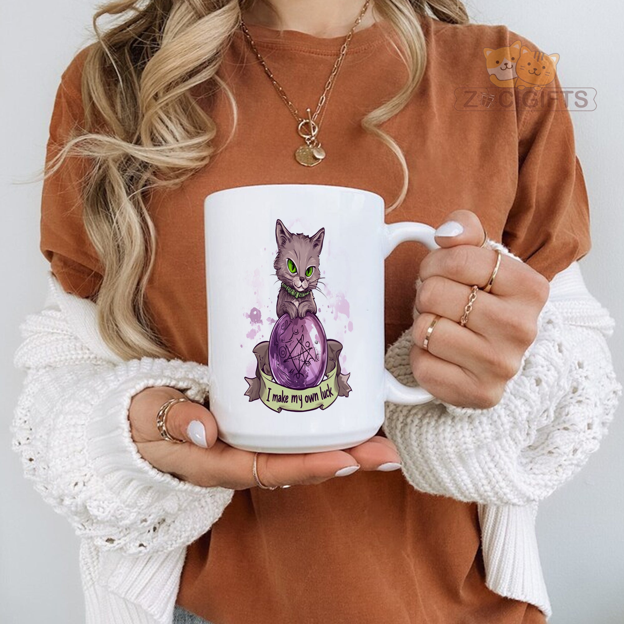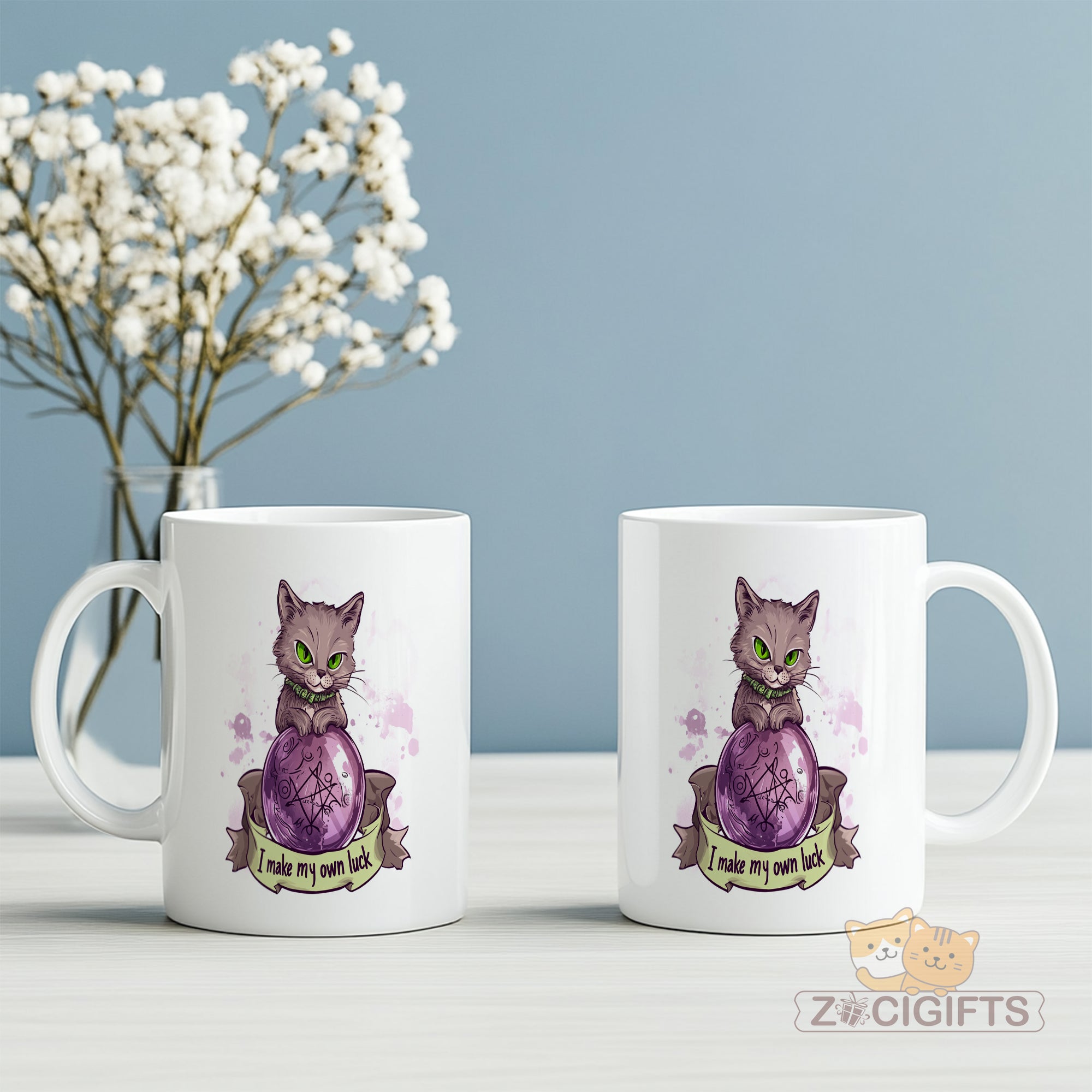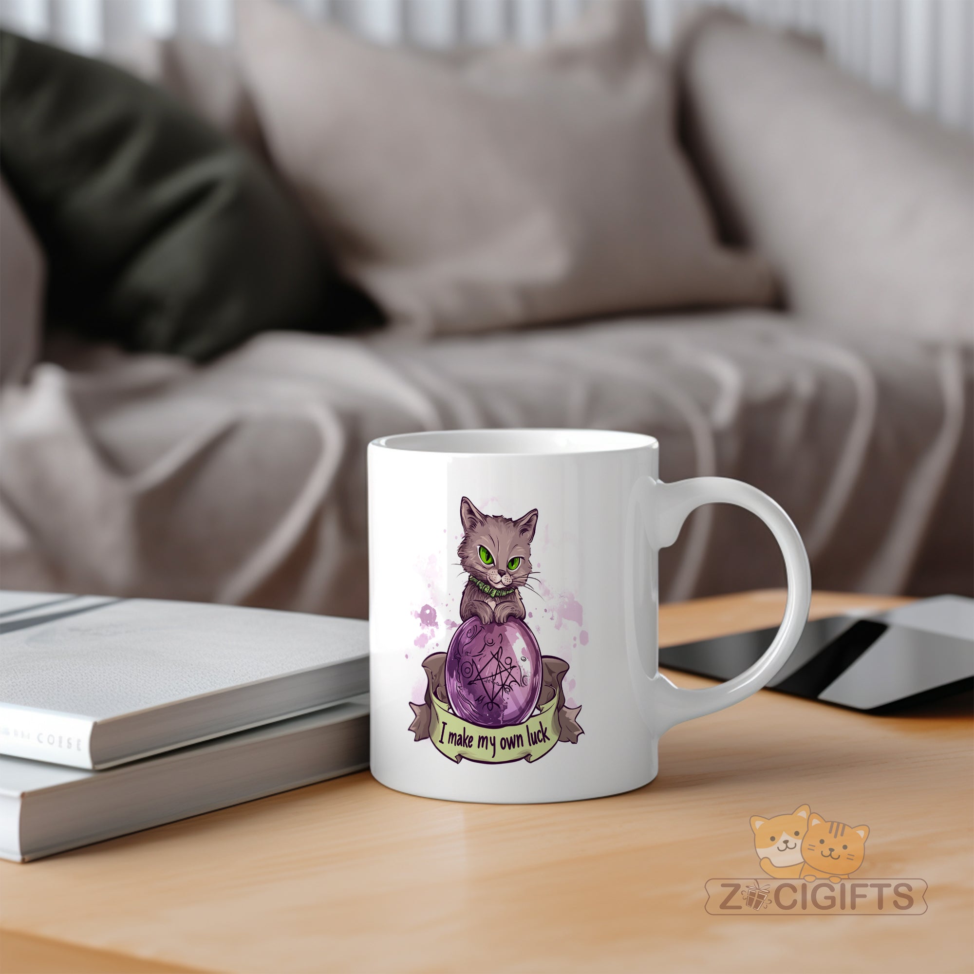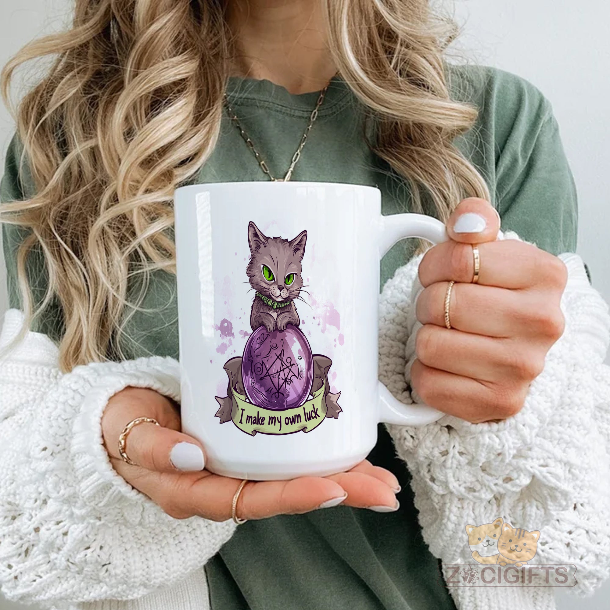 Marvel at the captivating artwork: a charming gray cat with striking green eyes perches atop a glowing purple crystal ball (adorned with occult symbols), while a banner sweetly proclaims “I make my own luck”. It blends feline cuteness, gothic allure, and empowering spirit — ideal for your morning coffee, evening tea, or even whimsical potions.
