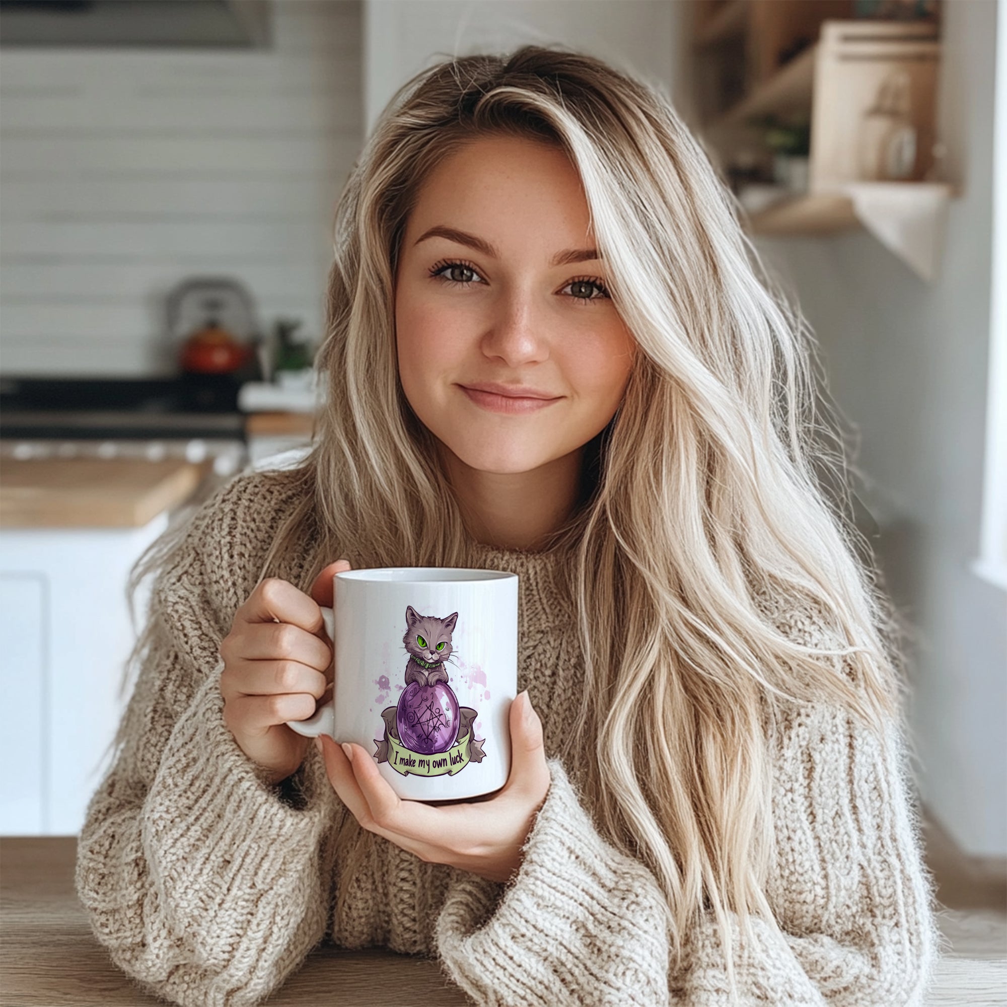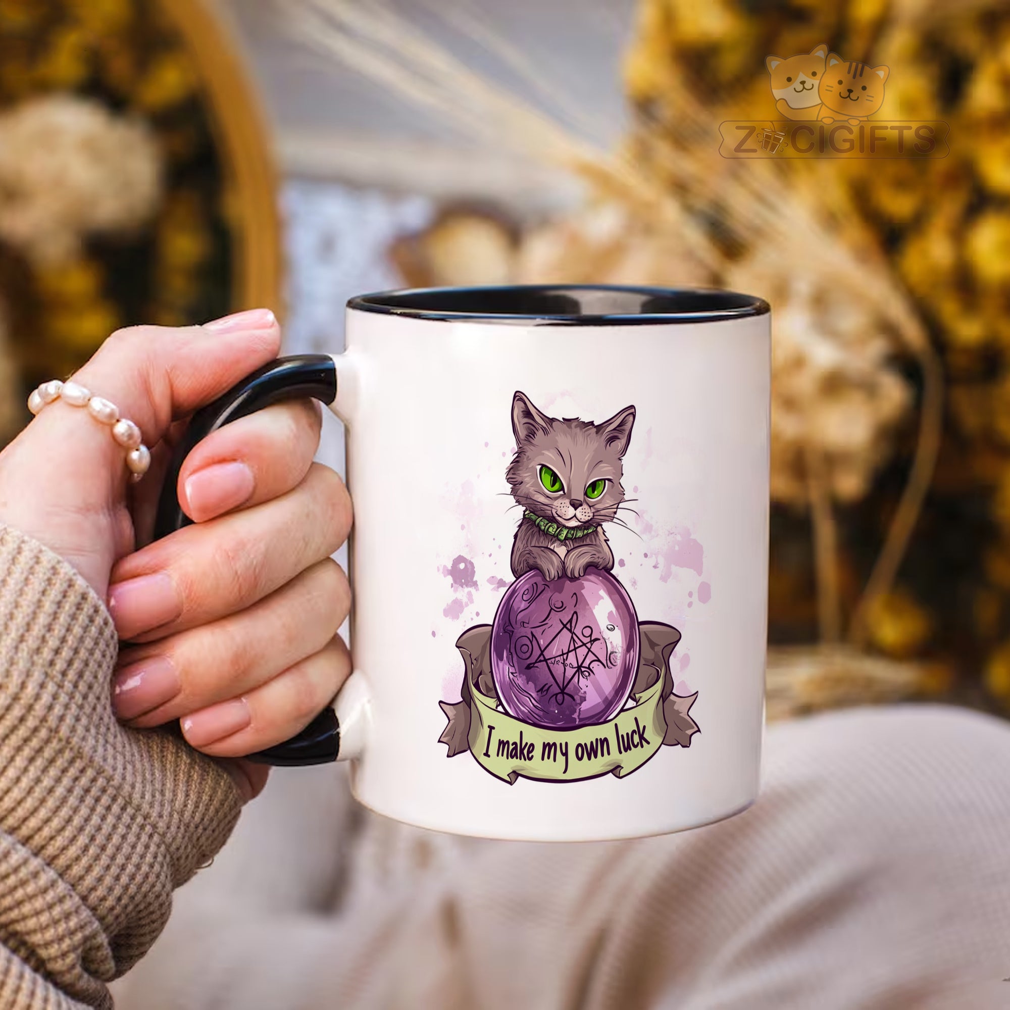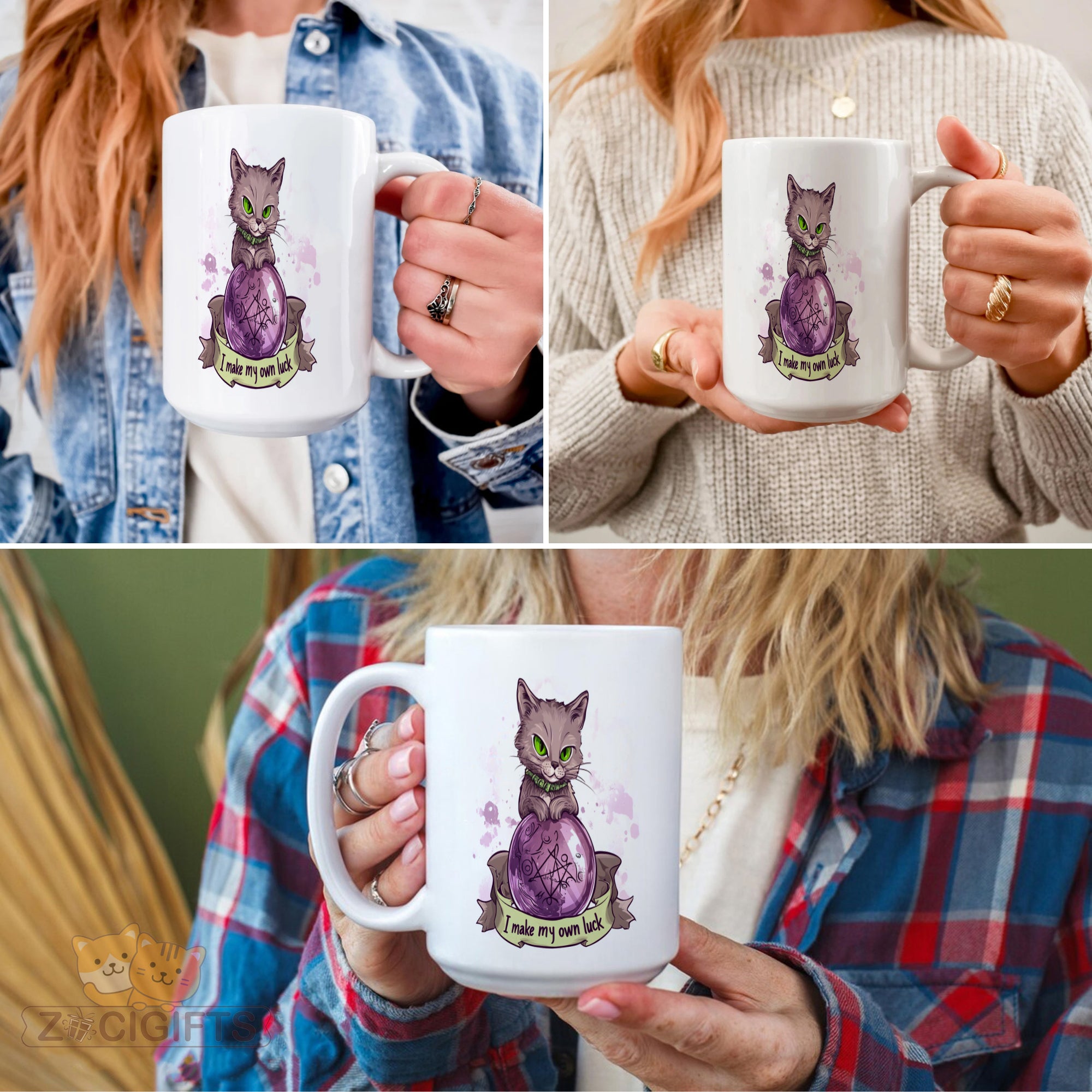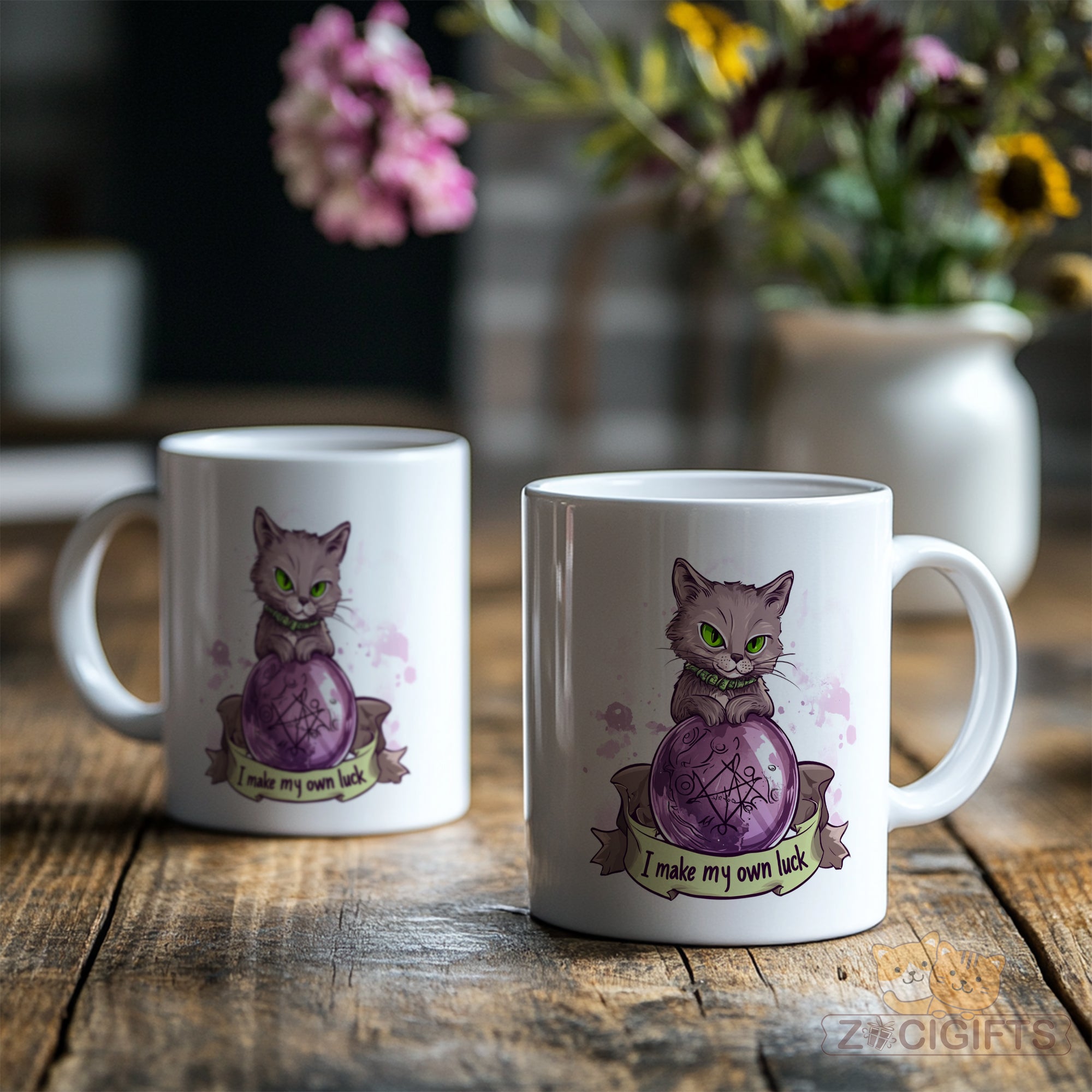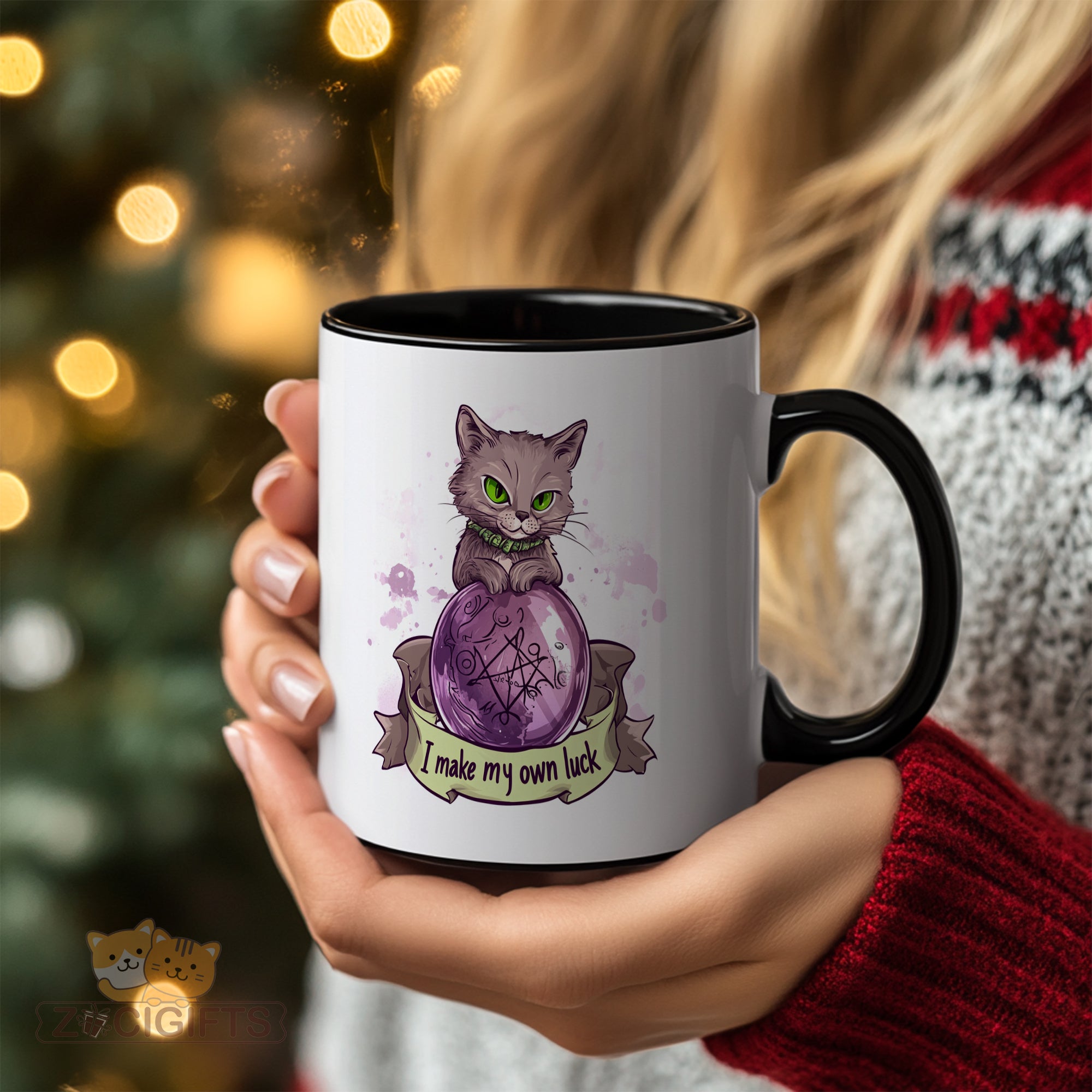 Marvel at the captivating artwork: a charming gray cat with striking green eyes perches atop a glowing purple crystal ball (adorned with occult symbols), while a banner sweetly proclaims “I make my own luck”. It blends feline cuteness, gothic allure, and empowering spirit — ideal for your morning coffee, evening tea, or even whimsical potions.